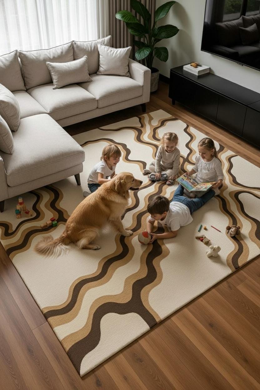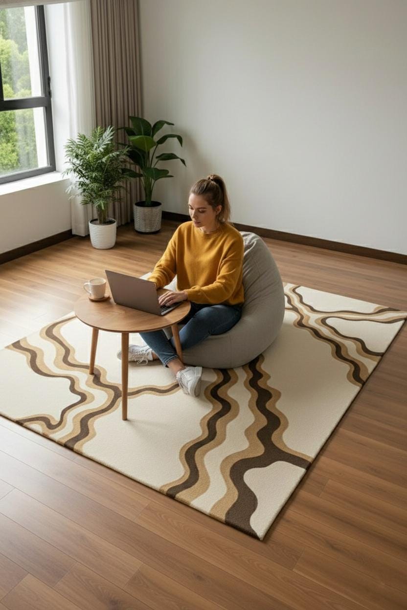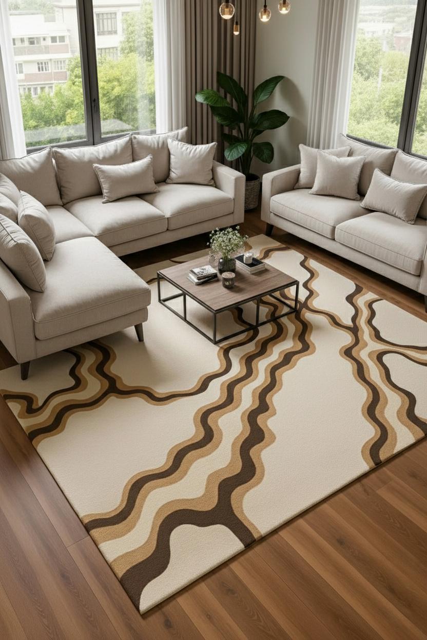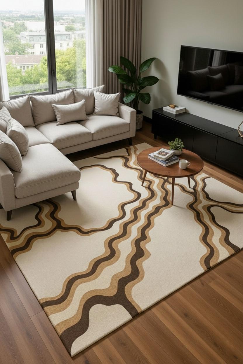 Modern Abstract Wavy Line Area Rug | Beige & Brown Living Room Carpet | Soft Minimalist Floor Decor | Bedroom, Office & Home Interior Rug | Contemporary Aesthetic Mat