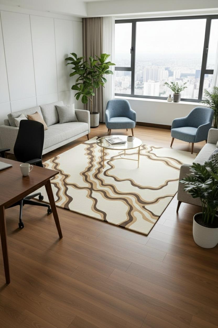 This modern wave-pattern rug combines Scandinavian simplicity with a calming coastal vibe, making it an ideal statement piece for living rooms, bedrooms, nurseries, dining areas, and workspaces. The soft cream base is accented with flowing deep-blue wave lines, creating a balanced, airy look that complements minimalist, contemporary, boho, Japandi, or coastal décor styles.