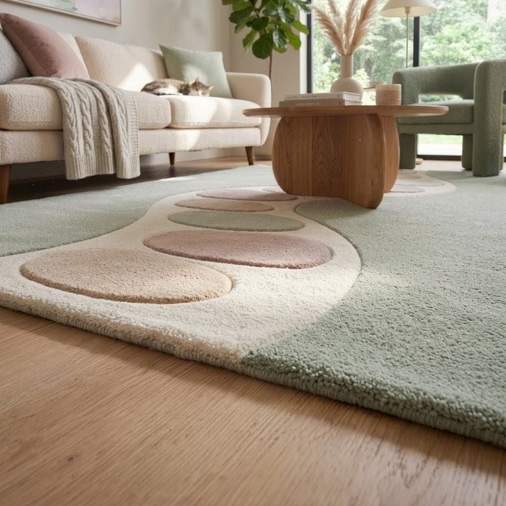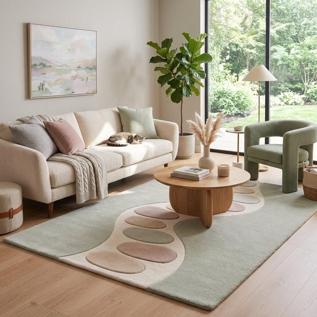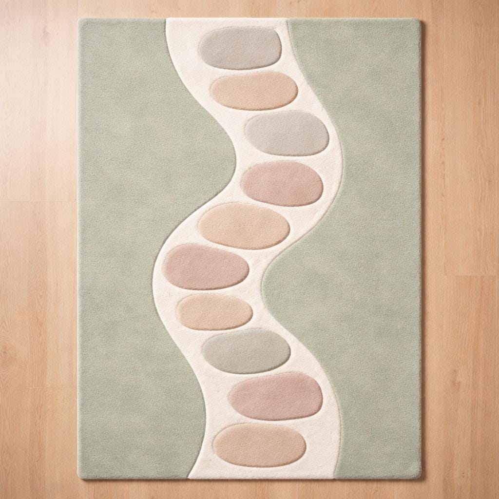 Inspired by the gentle flow of nature, this rug features an organic wavy pathway adorned with soft pebble-like shapes in calming pastel tones. The muted sage green base evokes tranquility, while the creamy ivory pathway and subtle blush, sand, and misty grey accents create a harmonious, modern composition. This design bridges Scandinavian minimalism with contemporary organic aesthetics, making it a statement piece that feels both artistic and soothing. The curved lines guide the eye effortlessly across the rug, adding movement and depth without overwhelming your space.