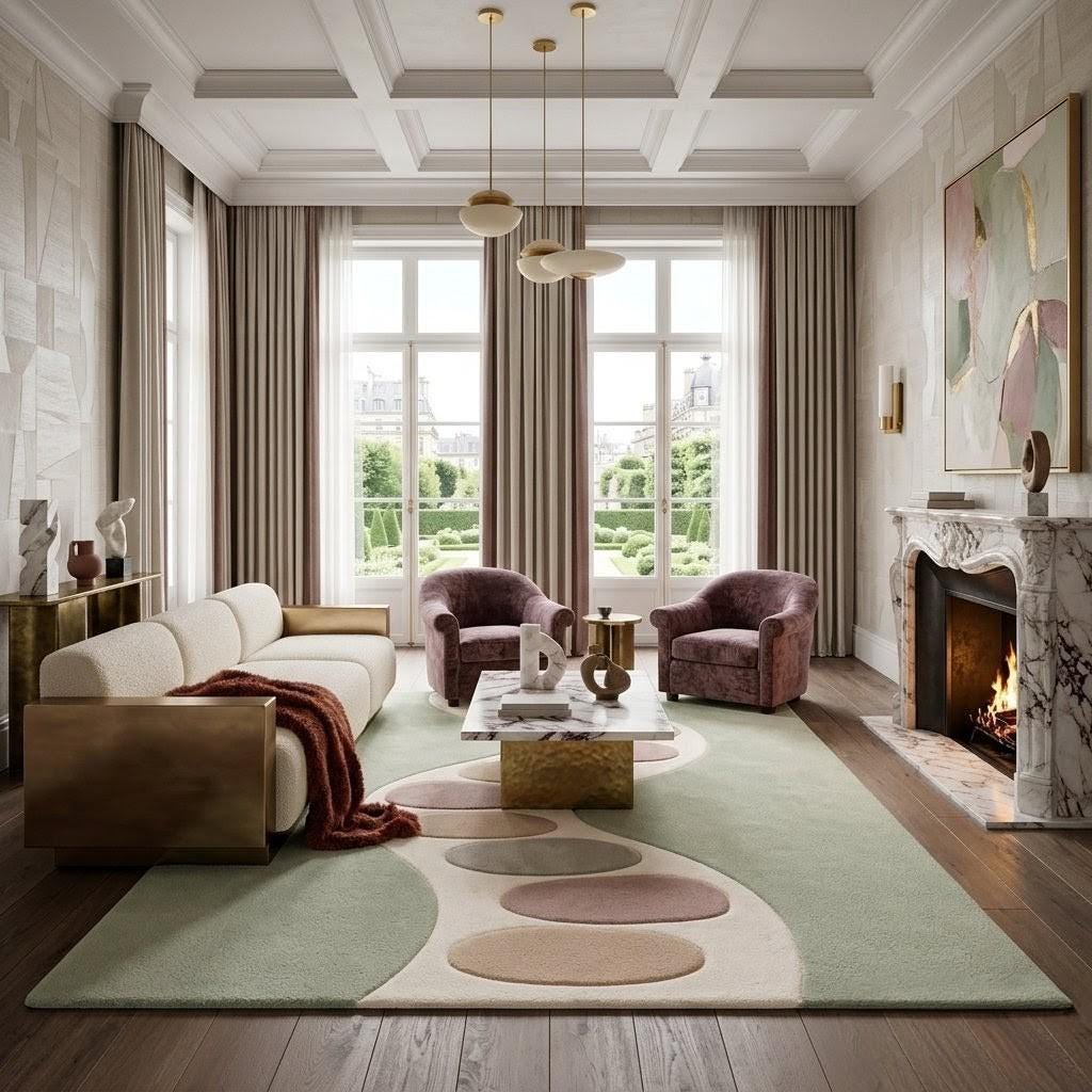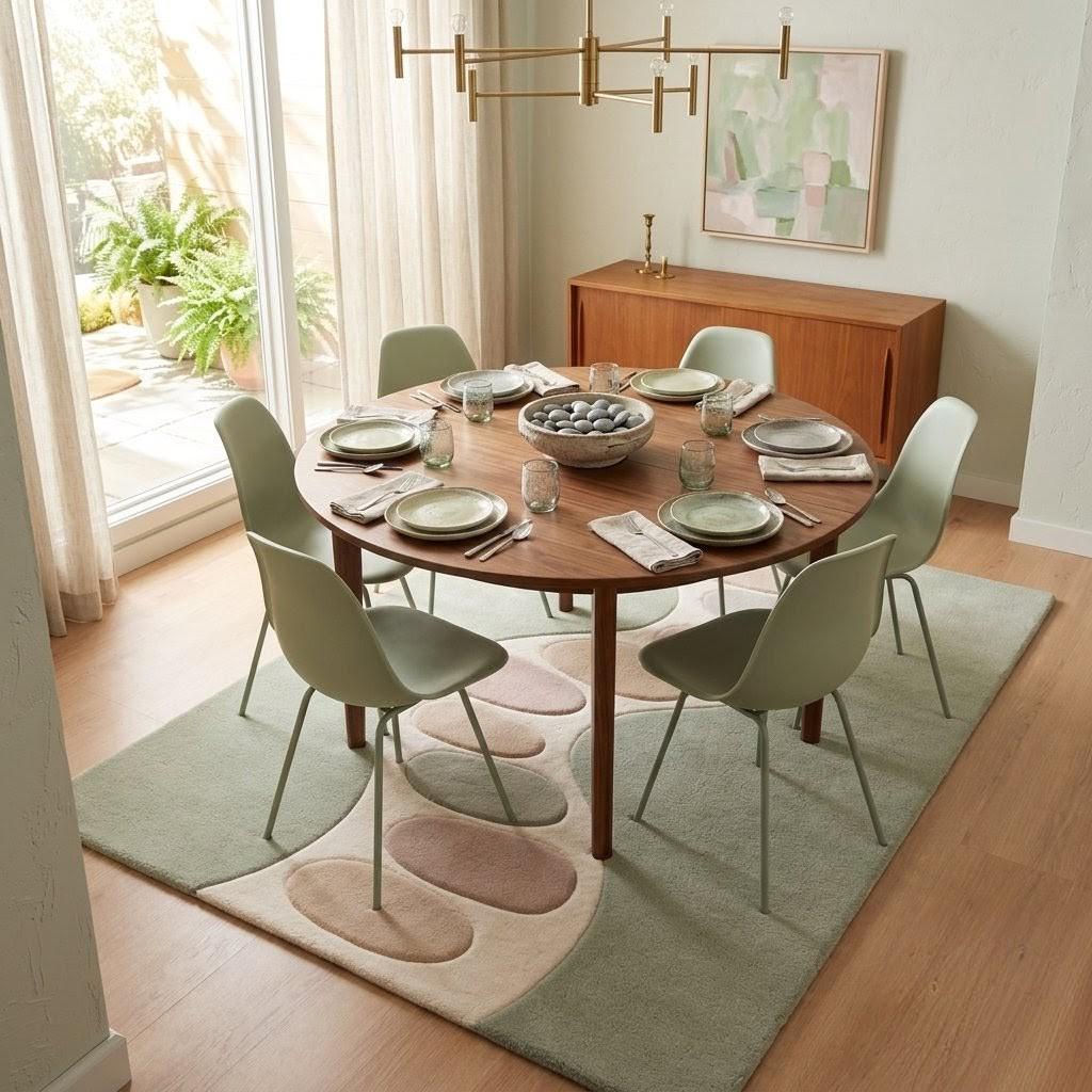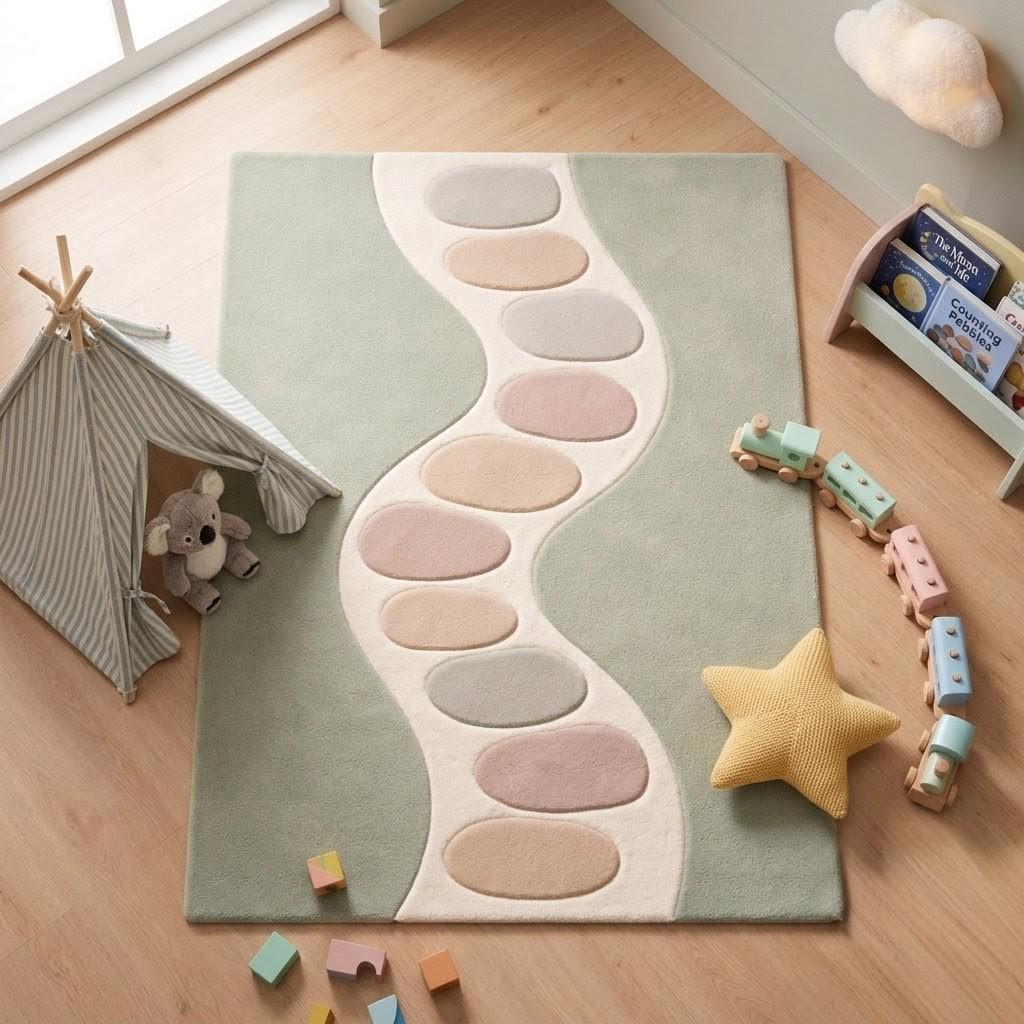 Inspired by the gentle flow of nature, this rug features an organic wavy pathway adorned with soft pebble-like shapes in calming pastel tones. The muted sage green base evokes tranquility, while the creamy ivory pathway and subtle blush, sand, and misty grey accents create a harmonious, modern composition. This design bridges Scandinavian minimalism with contemporary organic aesthetics, making it a statement piece that feels both artistic and soothing. The curved lines guide the eye effortlessly across the rug, adding movement and depth without overwhelming your space.