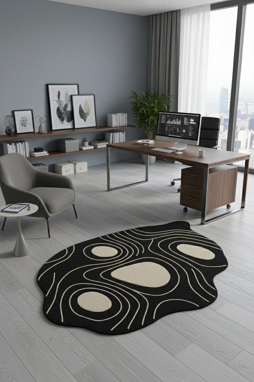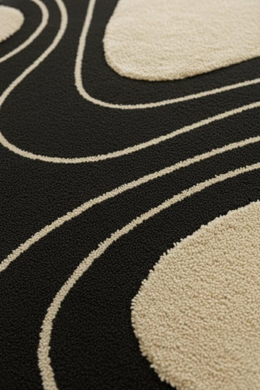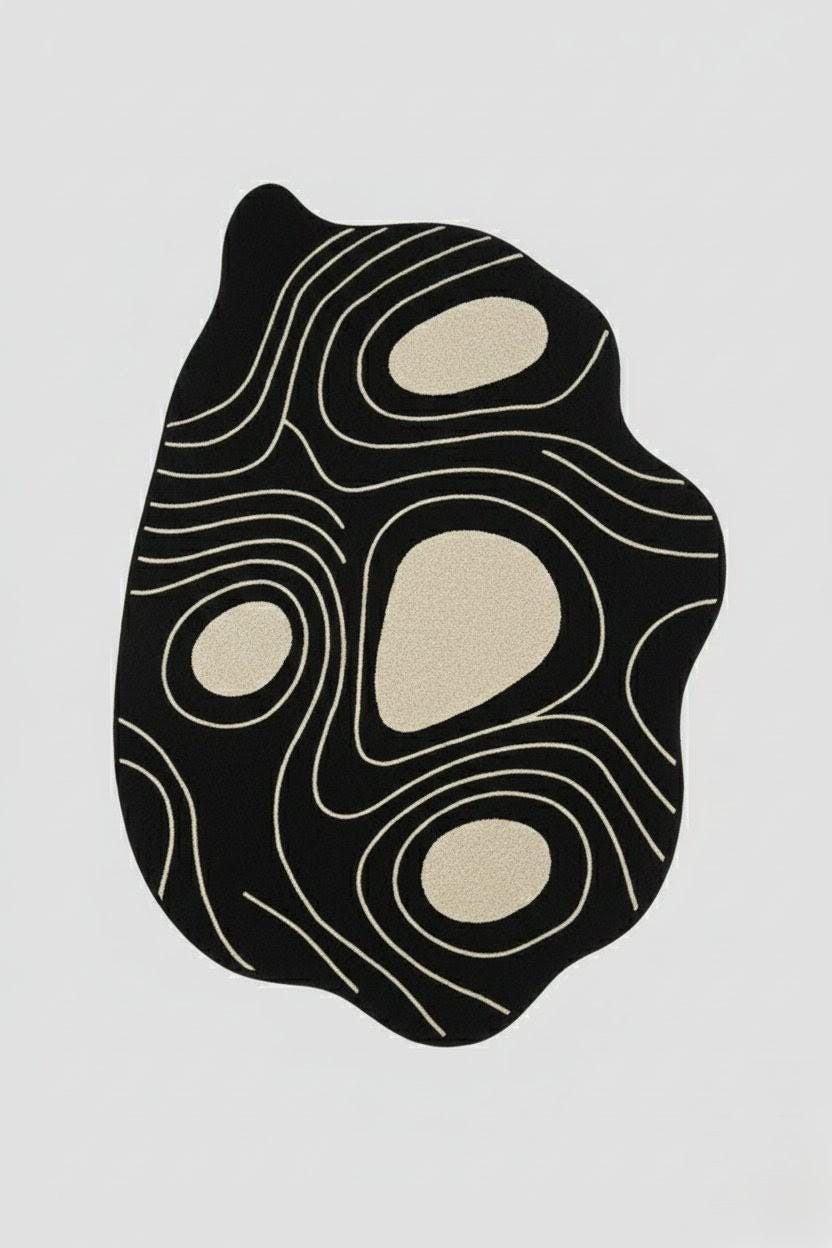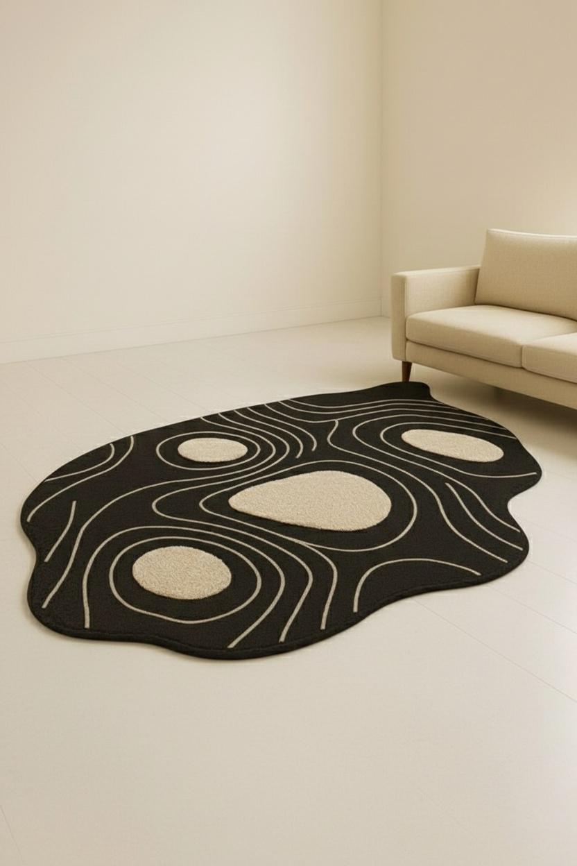 Bring modern artistry into your home with this Abstract Irregular Shape Area Rug, designed to add character, comfort, and a touch of luxury to any space. Featuring a bold black base with beige contour shapes, this rug creates a striking visual effect inspired by nature, topography, and organic forms.