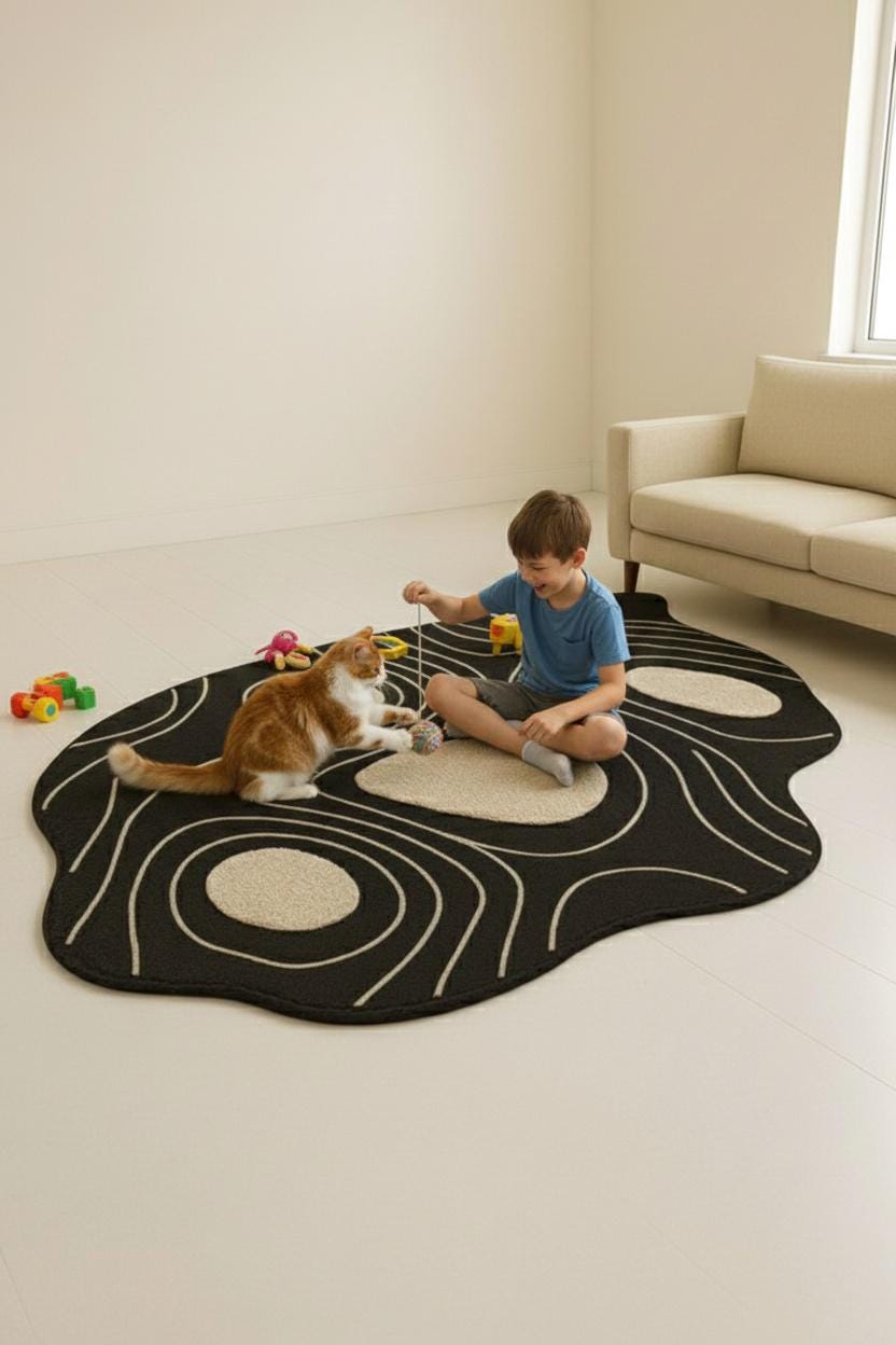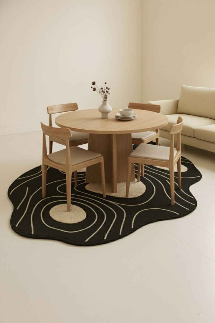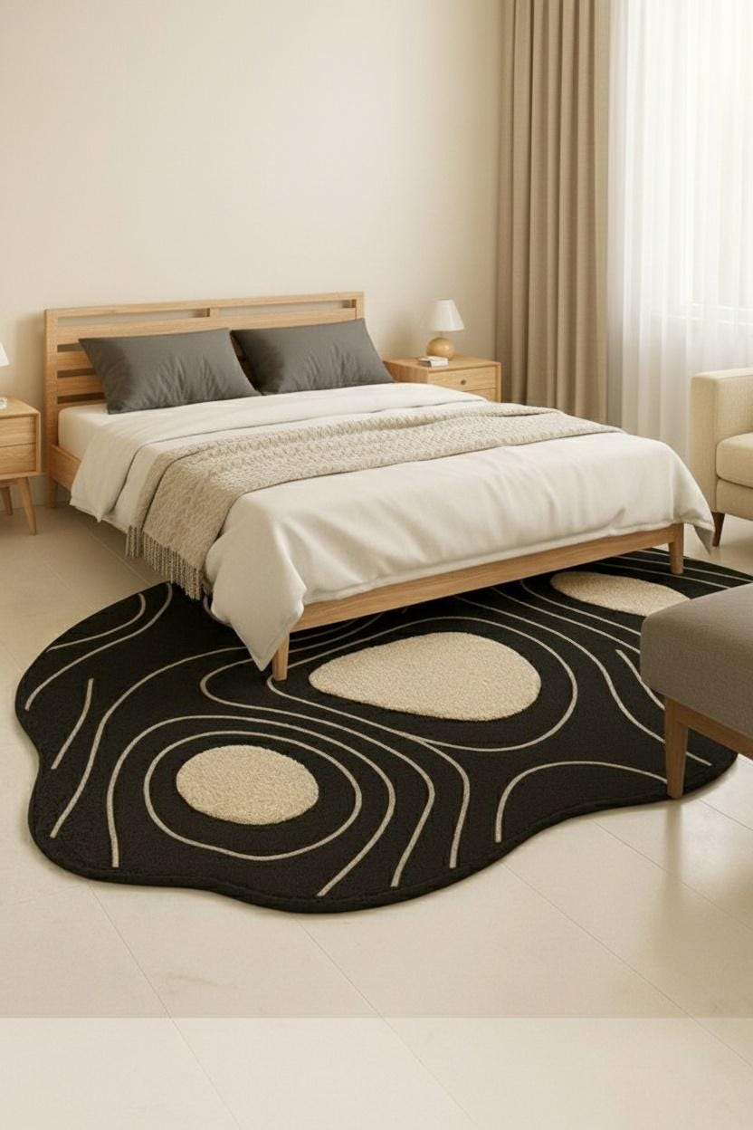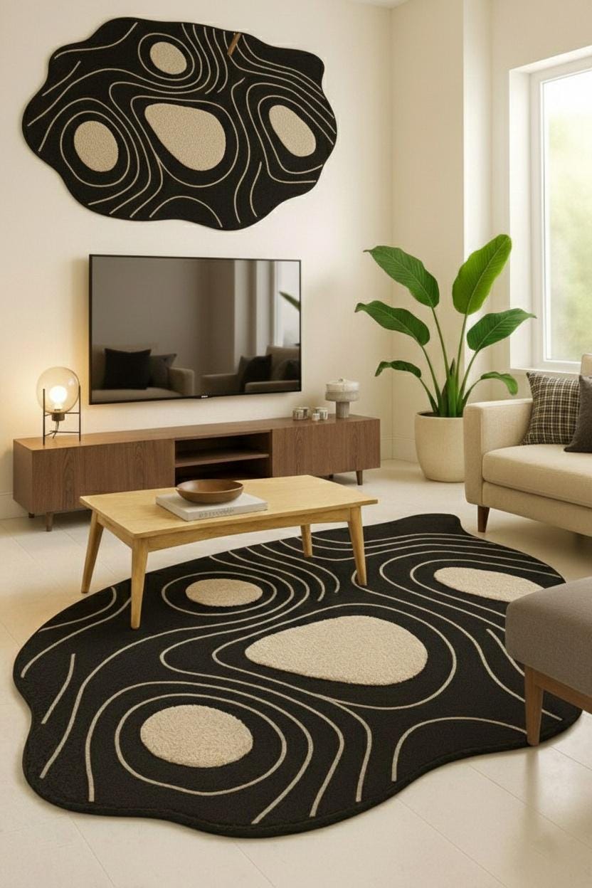 Bring modern artistry into your home with this Abstract Irregular Shape Area Rug, designed to add character, comfort, and a touch of luxury to any space. Featuring a bold black base with beige contour shapes, this rug creates a striking visual effect inspired by nature, topography, and organic forms.