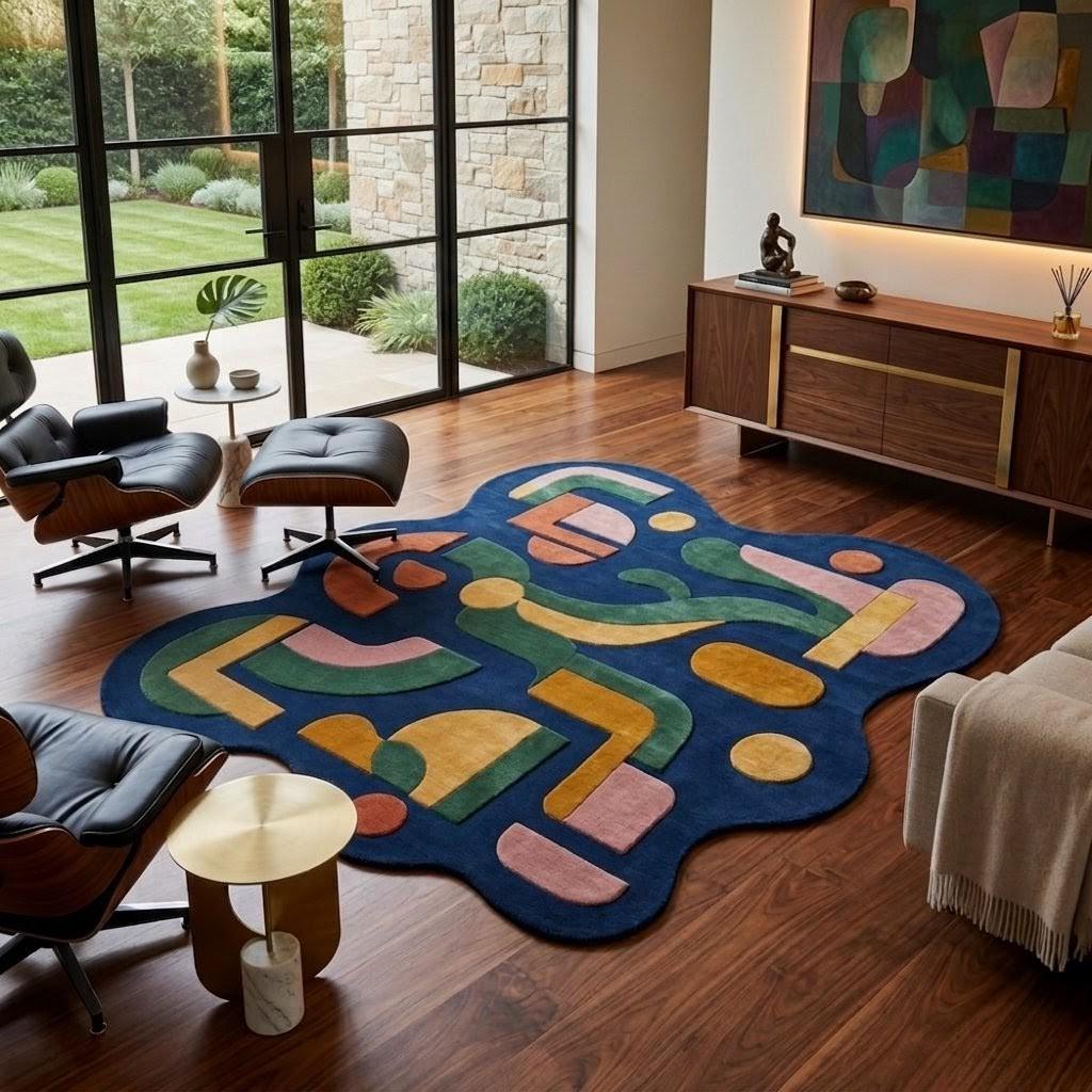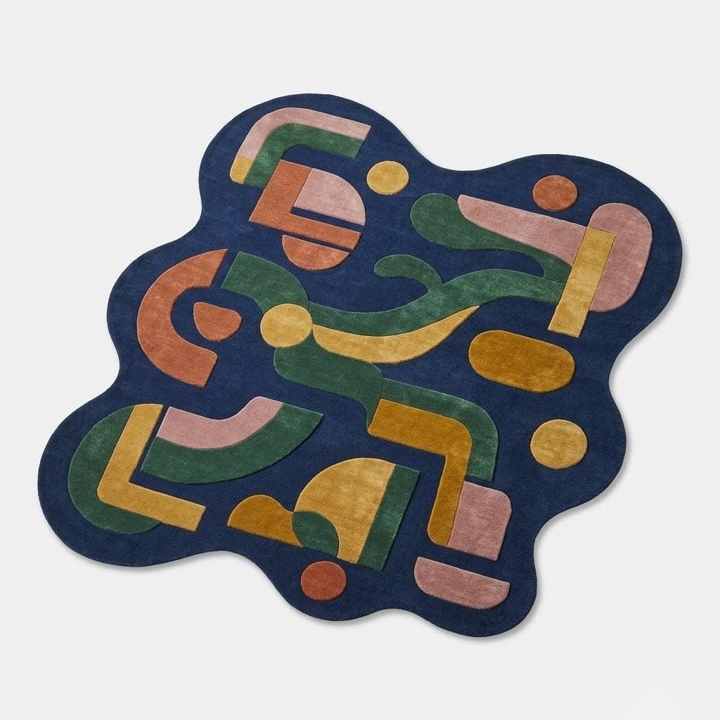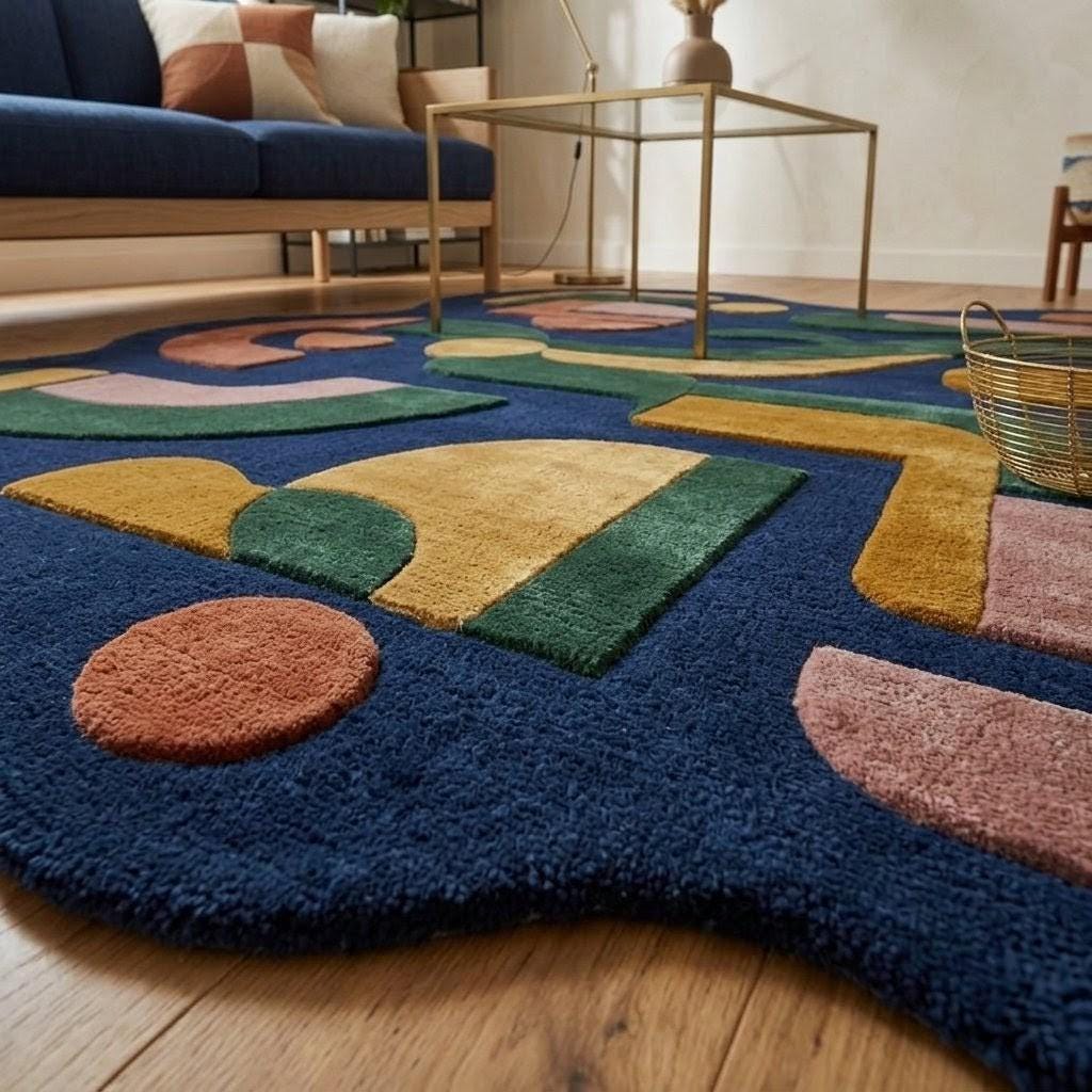 This rug features a striking abstract composition of organic shapes and flowing lines, inspired by mid-century modern design. Set against a deep navy background, warm tones of mustard, terracotta, blush pink, and forest green create a harmonious yet vibrant palette. Its irregular silhouette adds a sculptural, gallery-like presence—perfect for interiors that embrace creativity, modern art, and bold design.