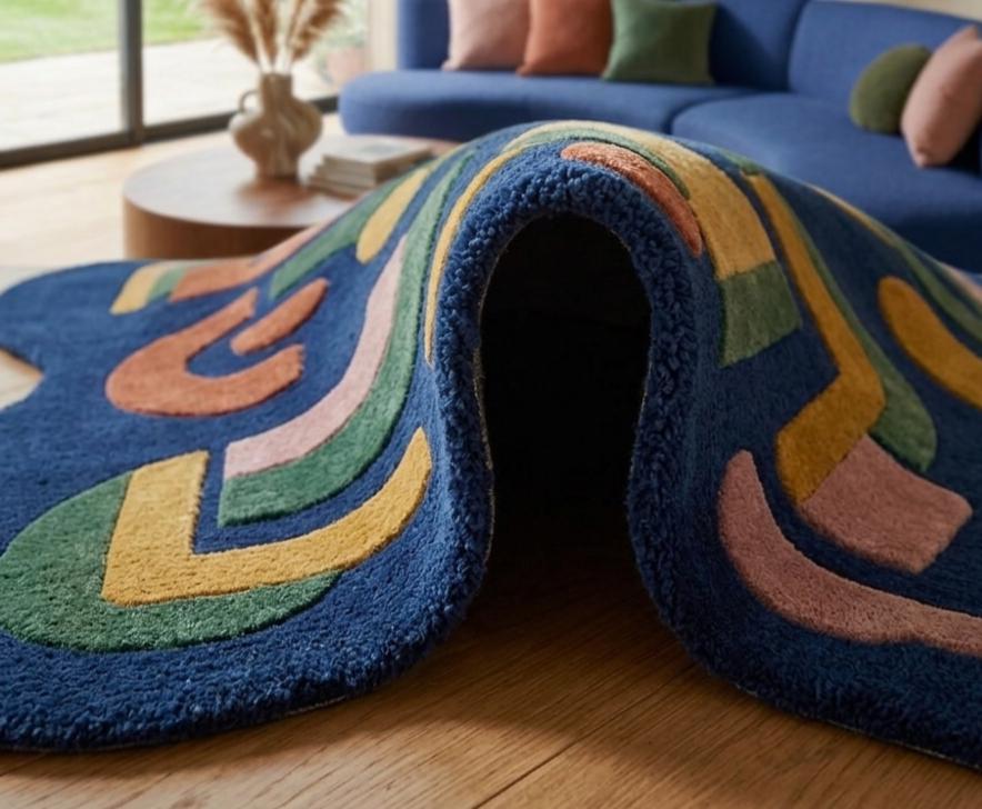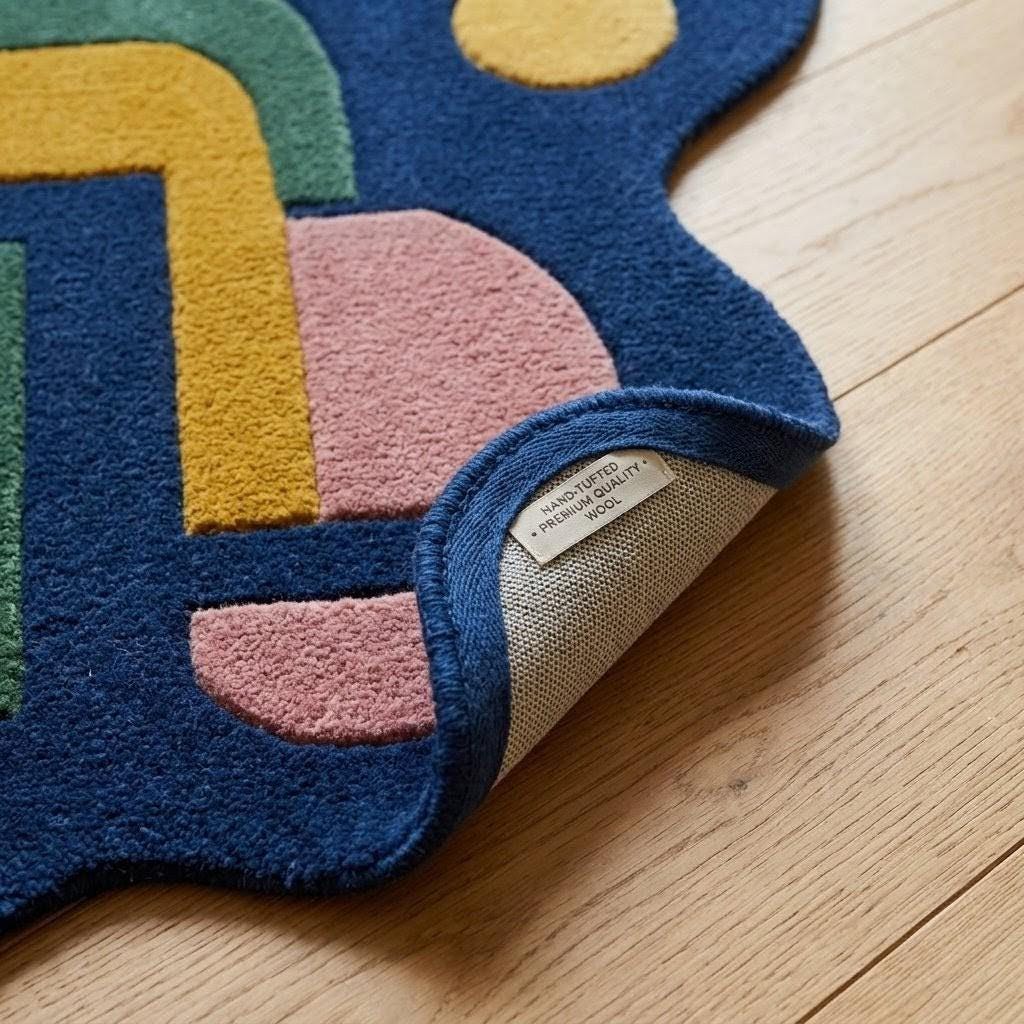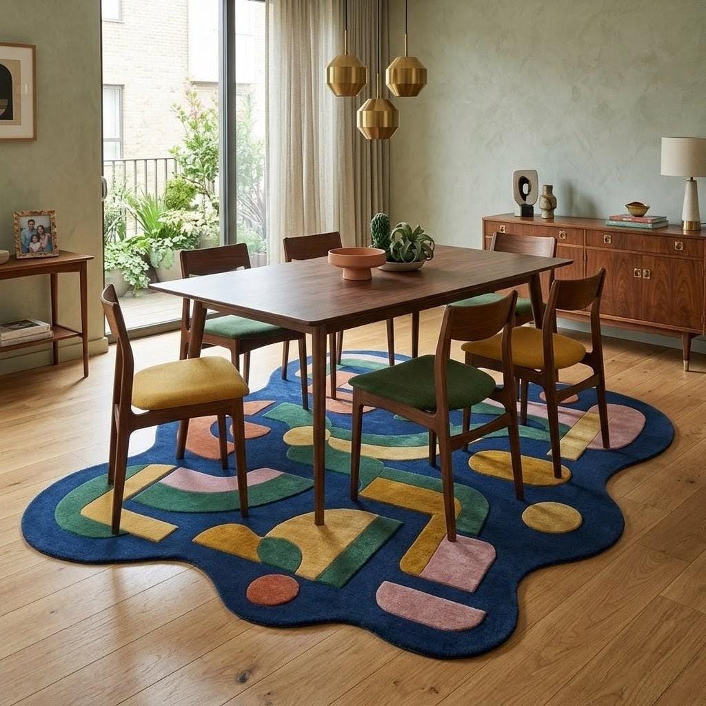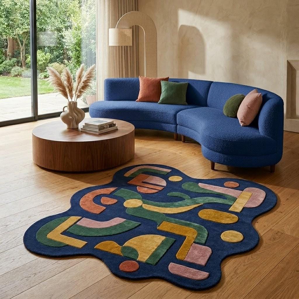 This rug features a striking abstract composition of organic shapes and flowing lines, inspired by mid-century modern design. Set against a deep navy background, warm tones of mustard, terracotta, blush pink, and forest green create a harmonious yet vibrant palette. Its irregular silhouette adds a sculptural, gallery-like presence—perfect for interiors that embrace creativity, modern art, and bold design.