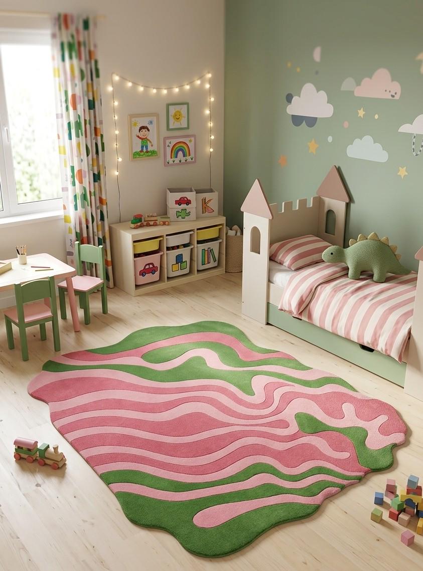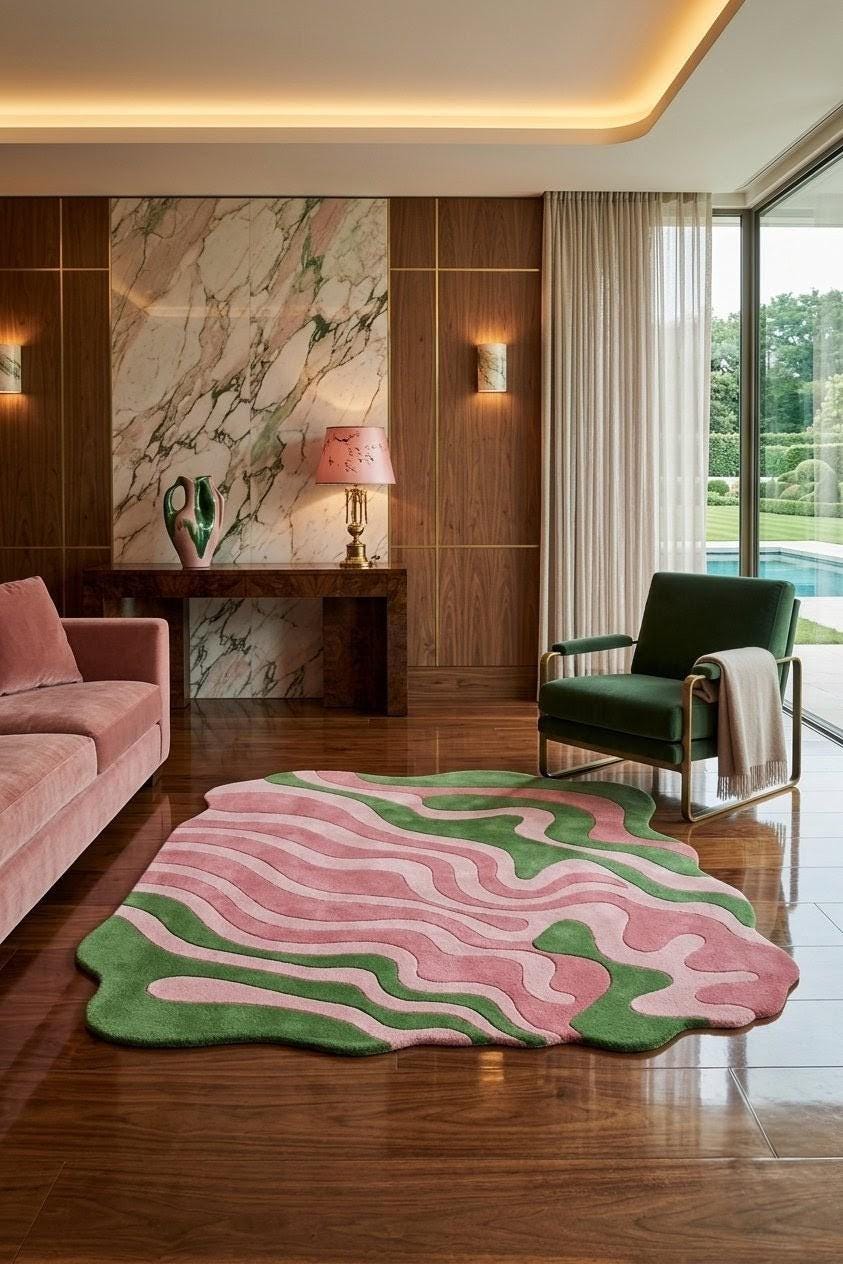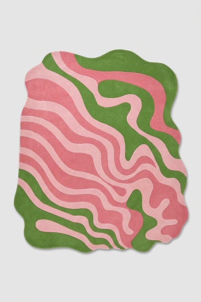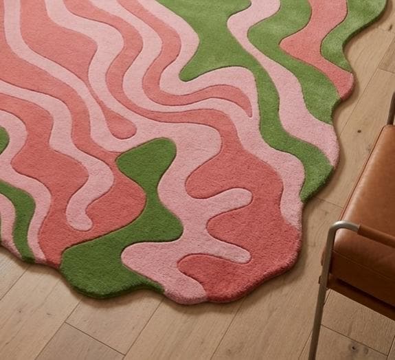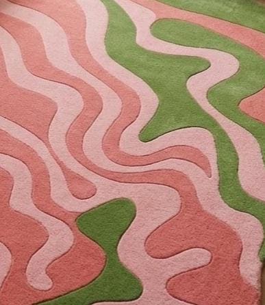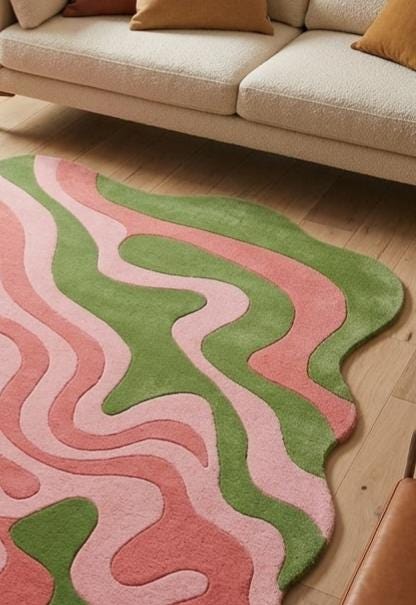 This rug features a fluid, abstract wave pattern with soft pink tones intertwined with earthy green shapes, creating a modern organic aesthetic. Its irregular, freeform silhouette adds a sculptural element, making it a perfect statement piece for contemporary, mid-century, or playful interiors. The design evokes movement and calm, balancing boldness with softness.
