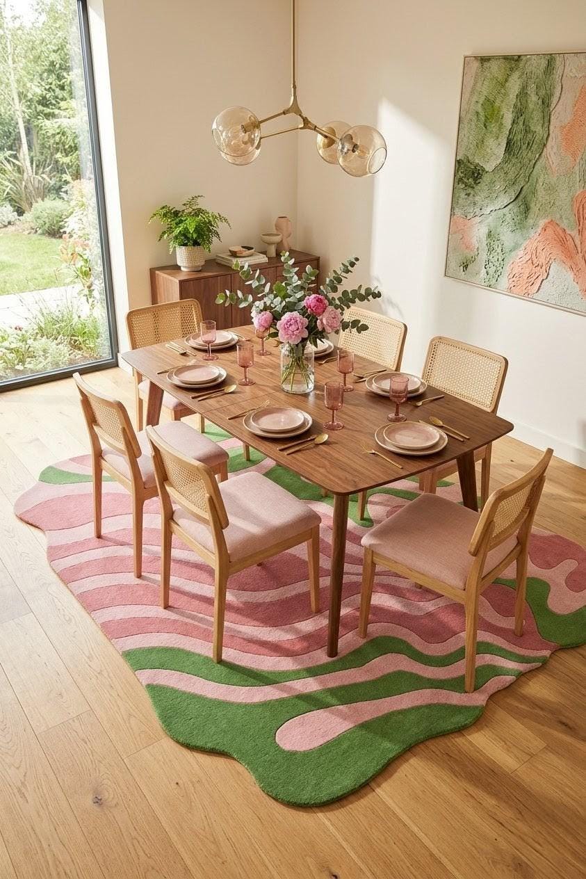 Abstract Pink Green Rug, Hand Tufted Wool Area Rug, Modern Organic Shape Carpet, Wavy Pattern Living Room Rug, Custom Size