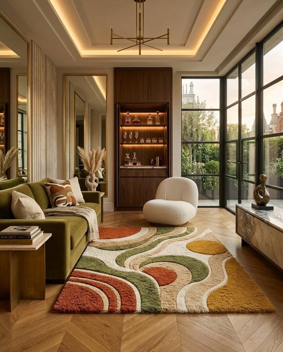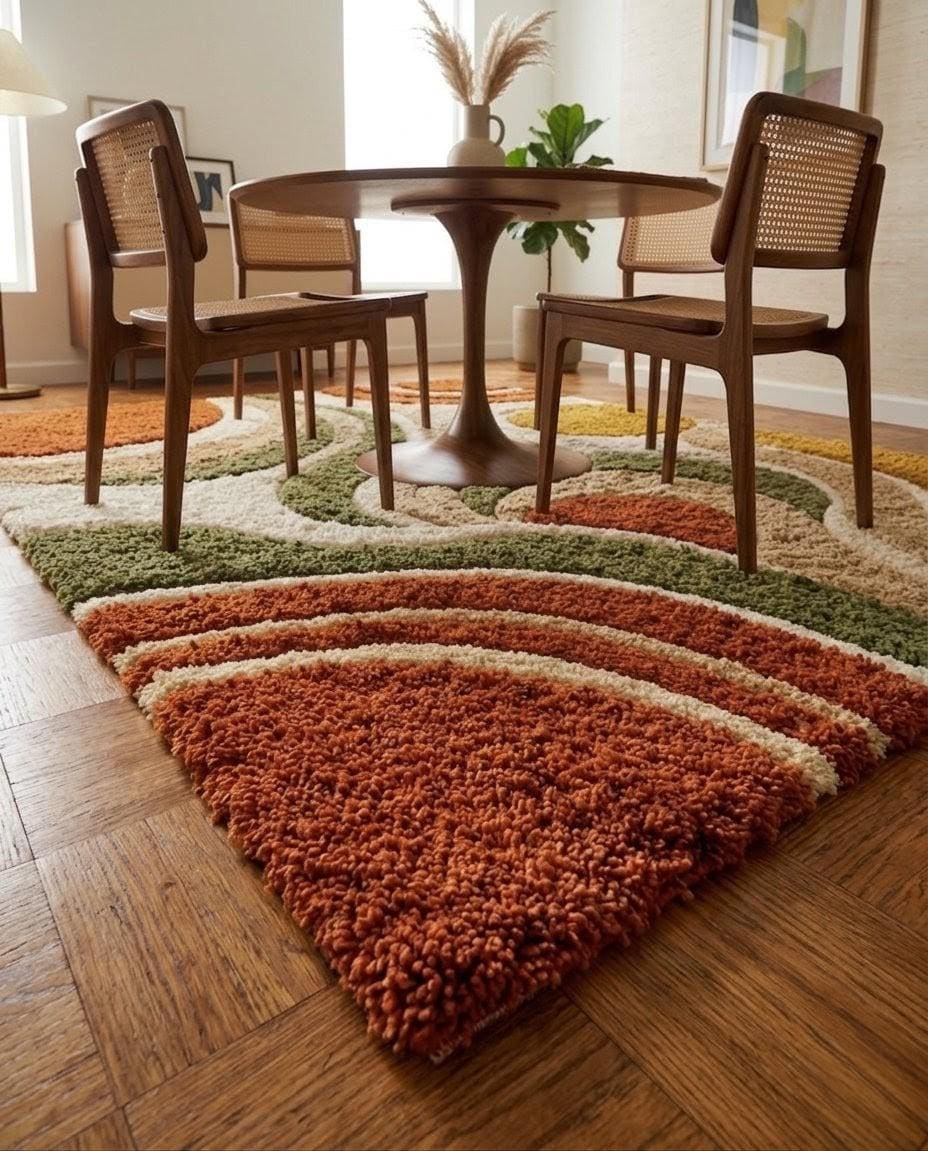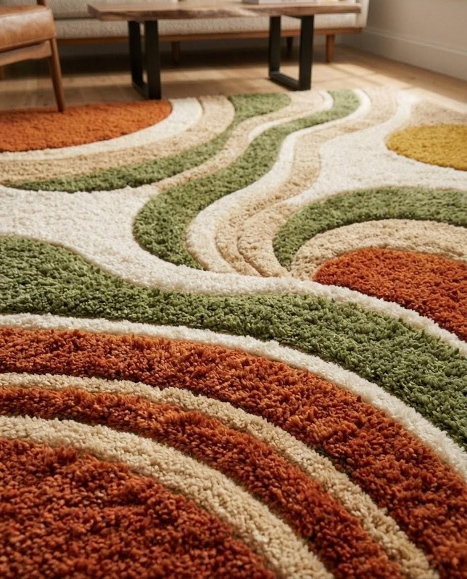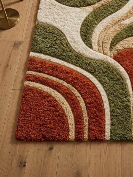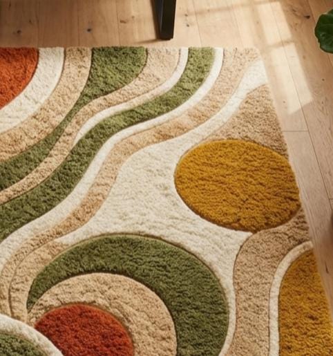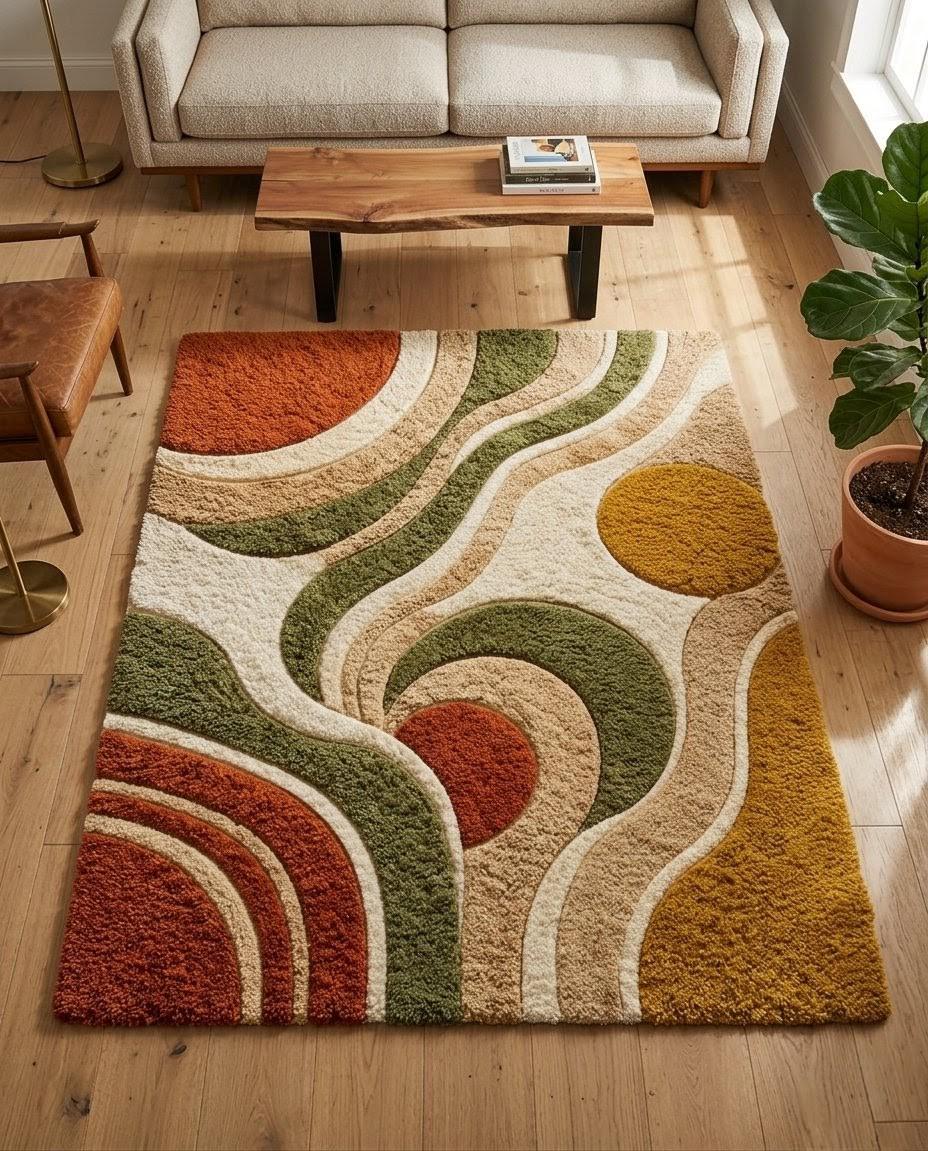 Bring warmth, movement, and retro charm into your space with this stunning abstract rug. Its earthy tones and flowing design instantly create a cozy, designer-inspired atmosphere.
