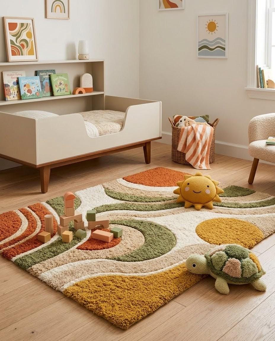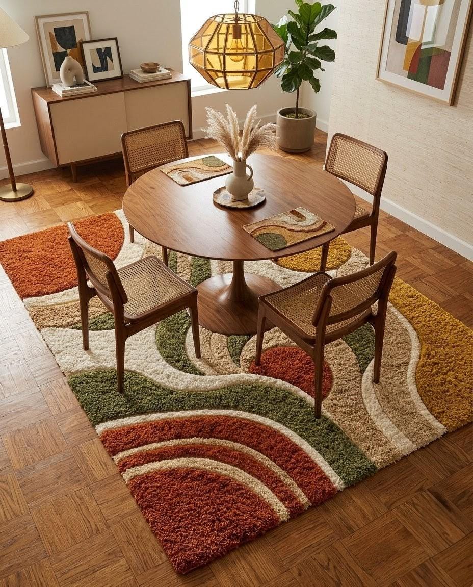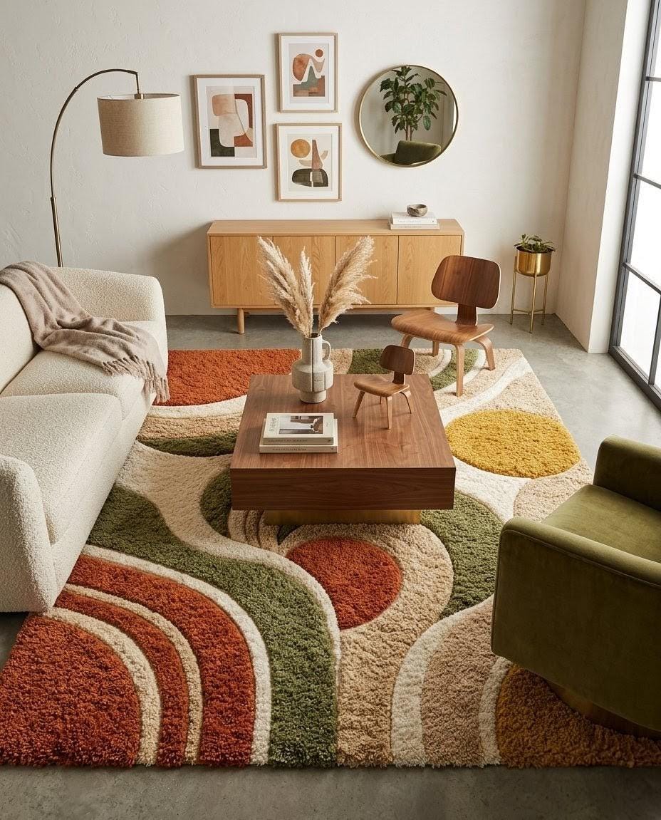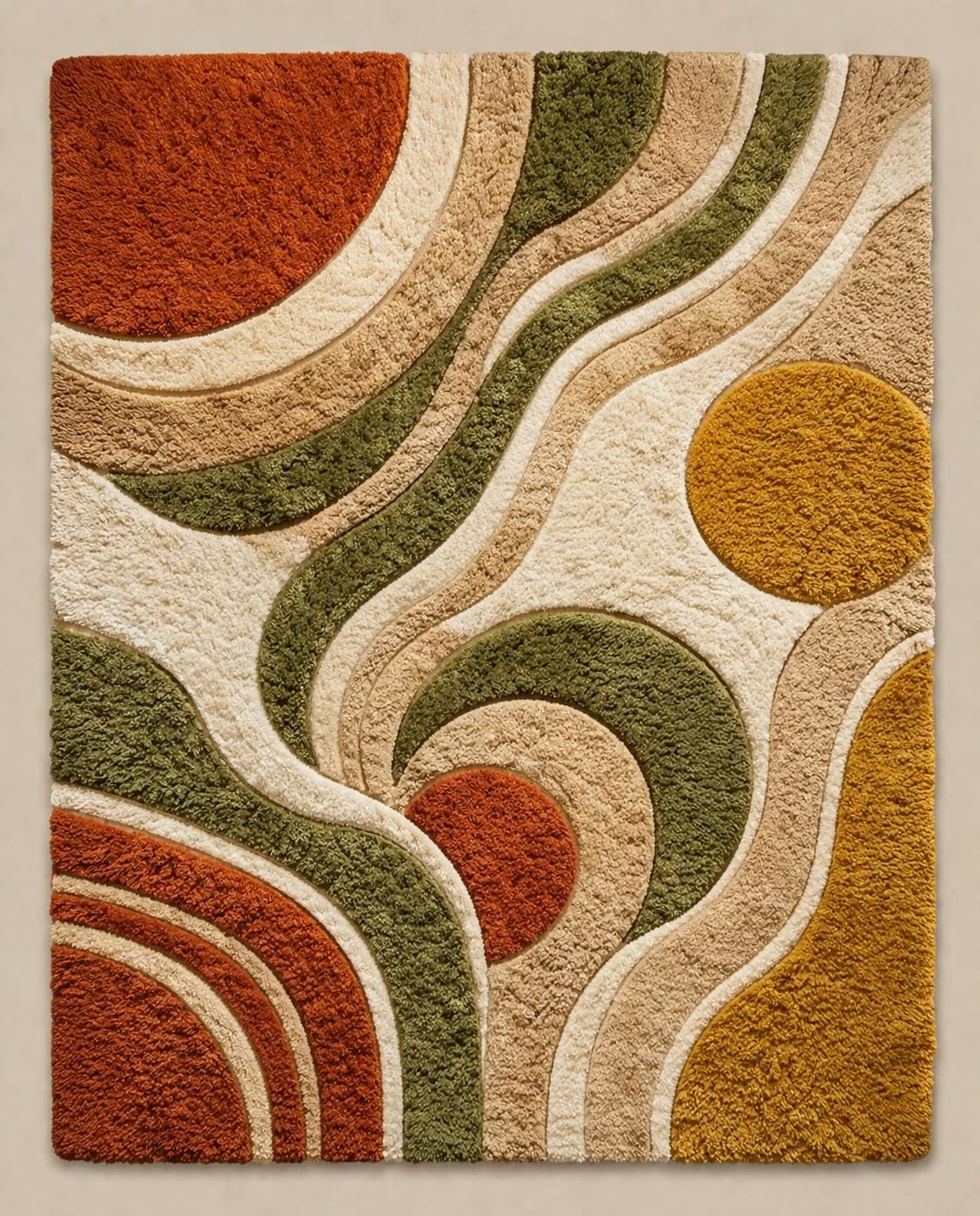 Inspired by mid-century modern and retro abstract art, this rug features flowing curves, organic shapes, and layered arcs in earthy tones. The harmonious blend of rust, olive green, mustard, and soft beige creates a grounded yet artistic statement piece that elevates any interior. Perfect for lovers of boho, modern, and vintage-inspired dƩcor, this rug adds both visual interest and warmth.