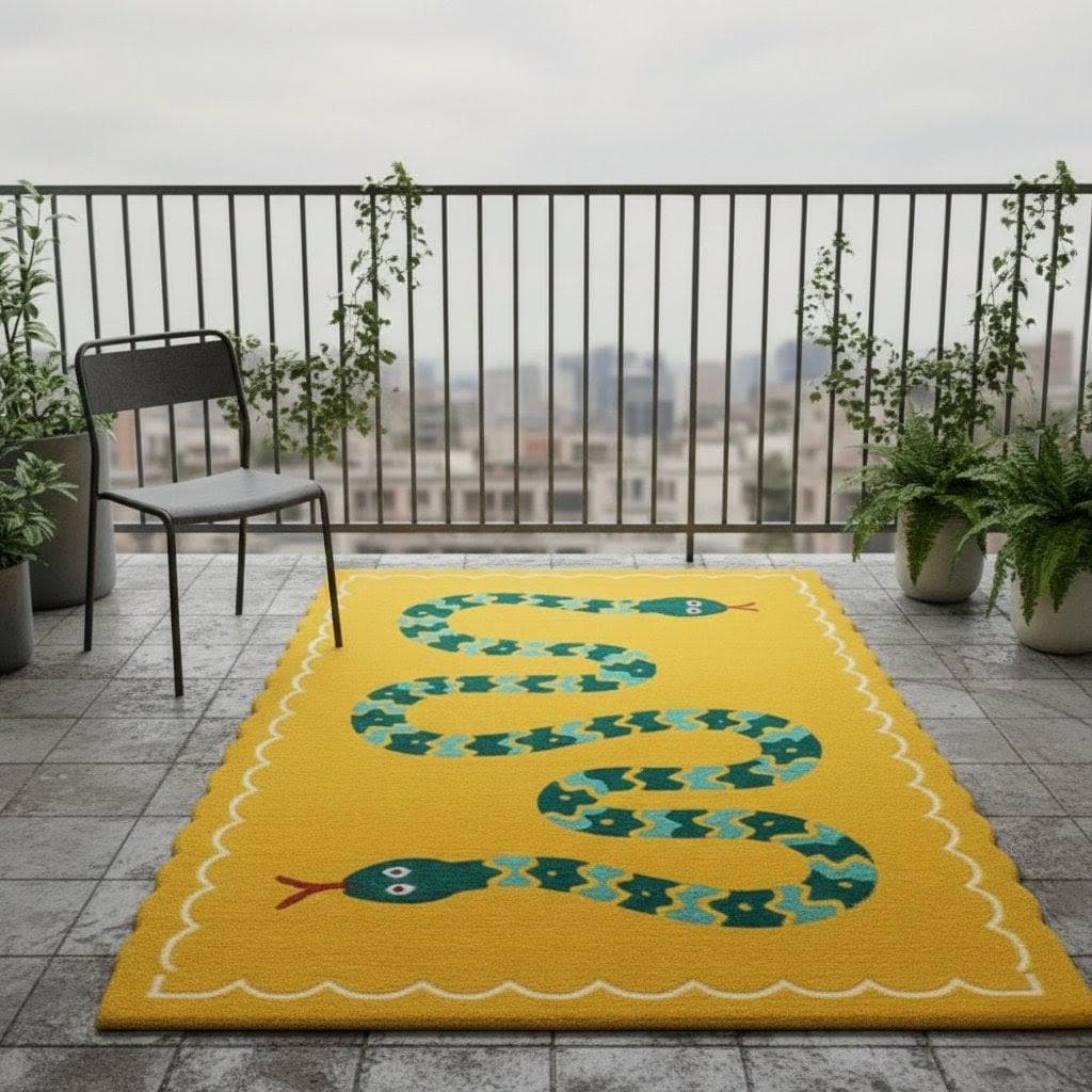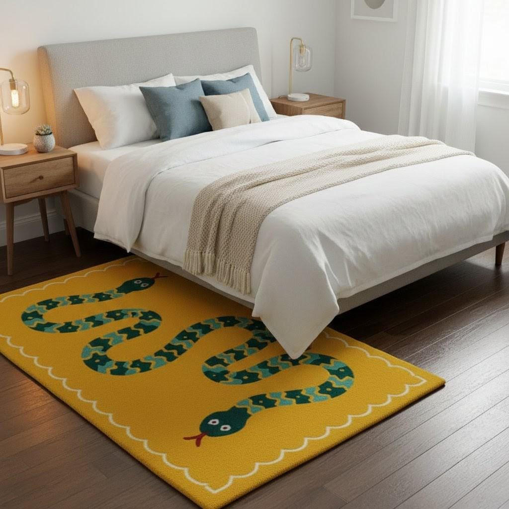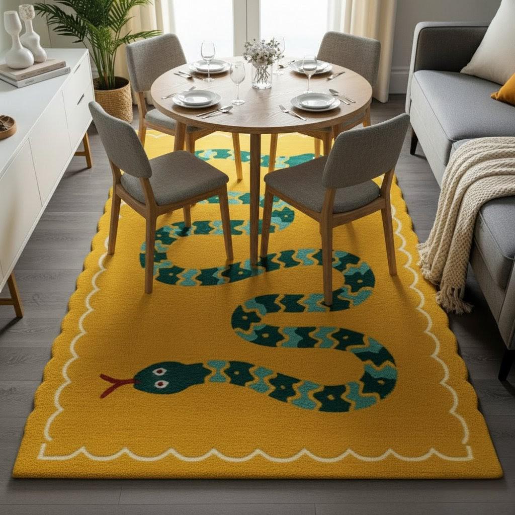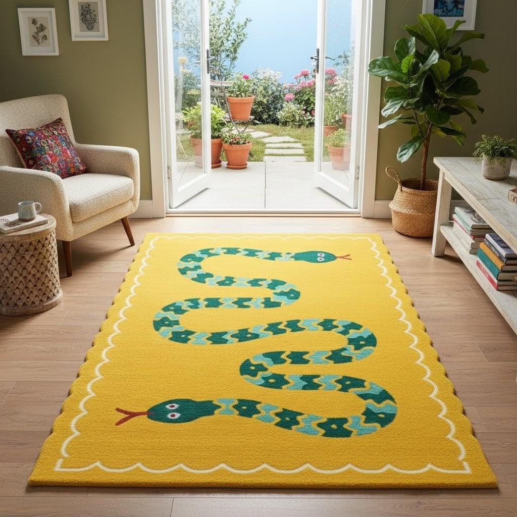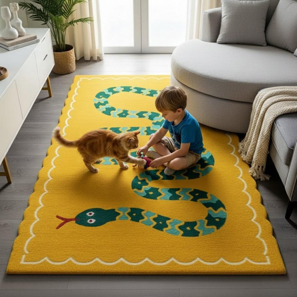 Designed with a cheerful yellow base and a charming green snake illustration, this rug instantly brightens any space—perfect for children’s rooms, nurseries, play areas, living rooms, or even cozy balconies.