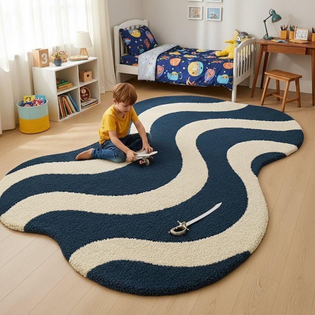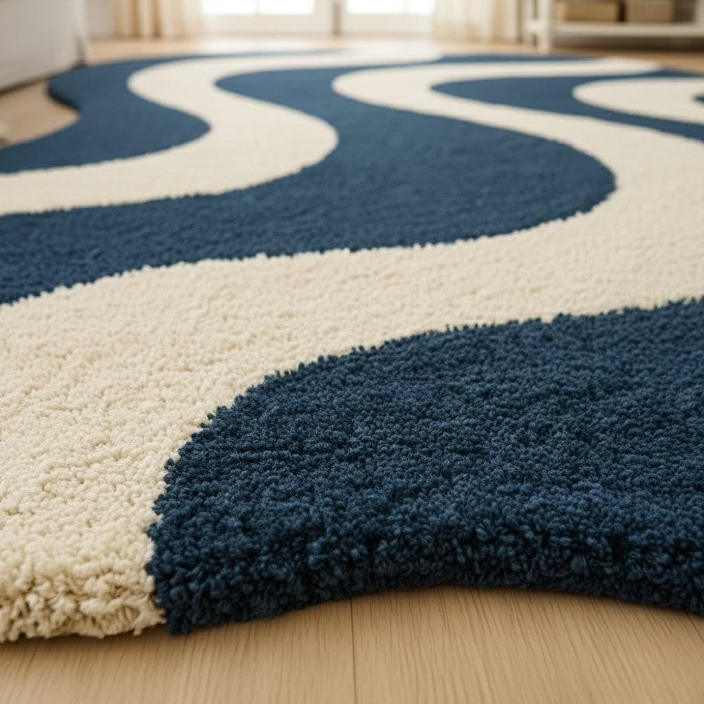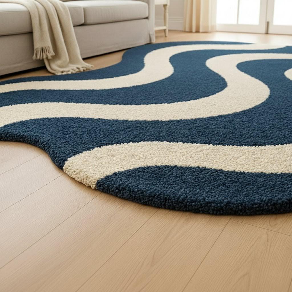Add a modern artistic touch to your space with this Wave Pattern Area Rug, featuring a bold wavy abstract design in deep navy blue and warm cream tones. Soft, plush and visually striking, this rug creates a cozy atmosphere while elevating any room’s aesthetic.