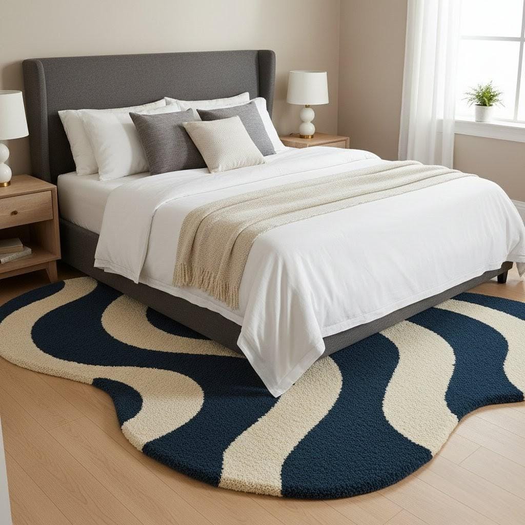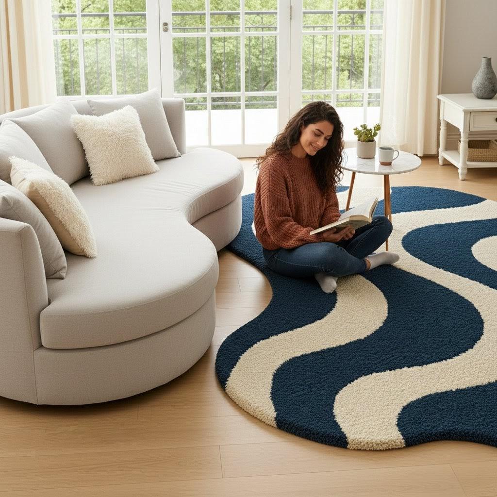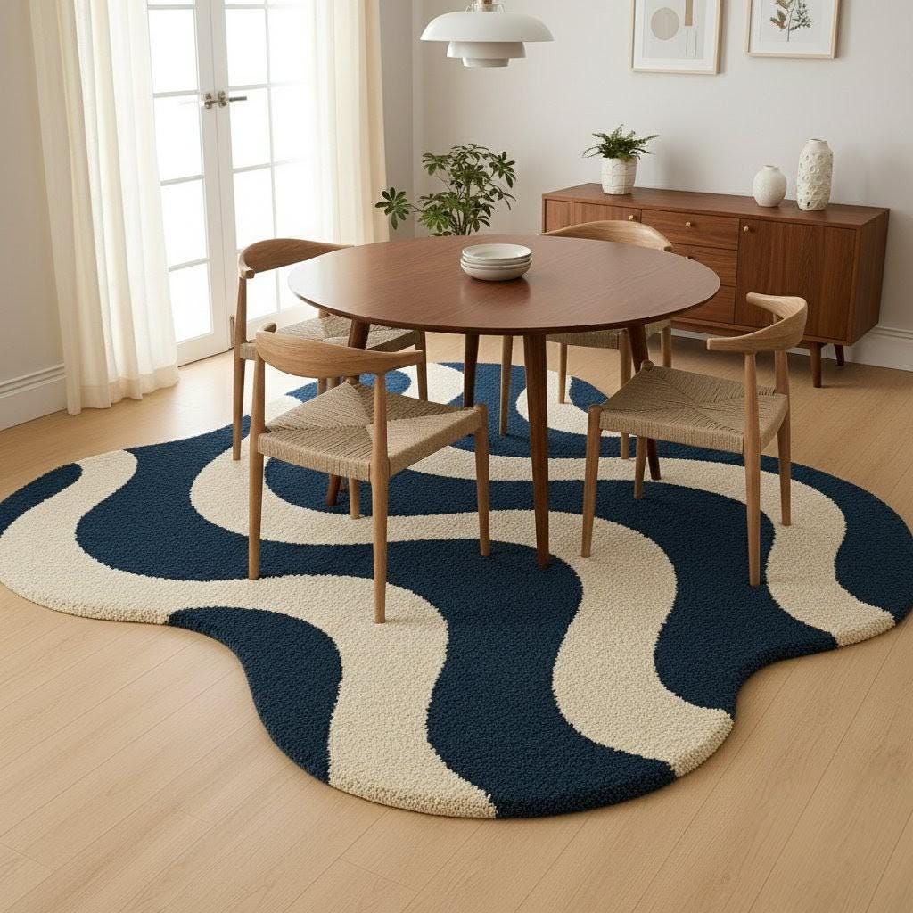 Add a modern artistic touch to your space with this Wave Pattern Area Rug, featuring a bold wavy abstract design in deep navy blue and warm cream tones. Soft, plush and visually striking, this rug creates a cozy atmosphere while elevating any room’s aesthetic.