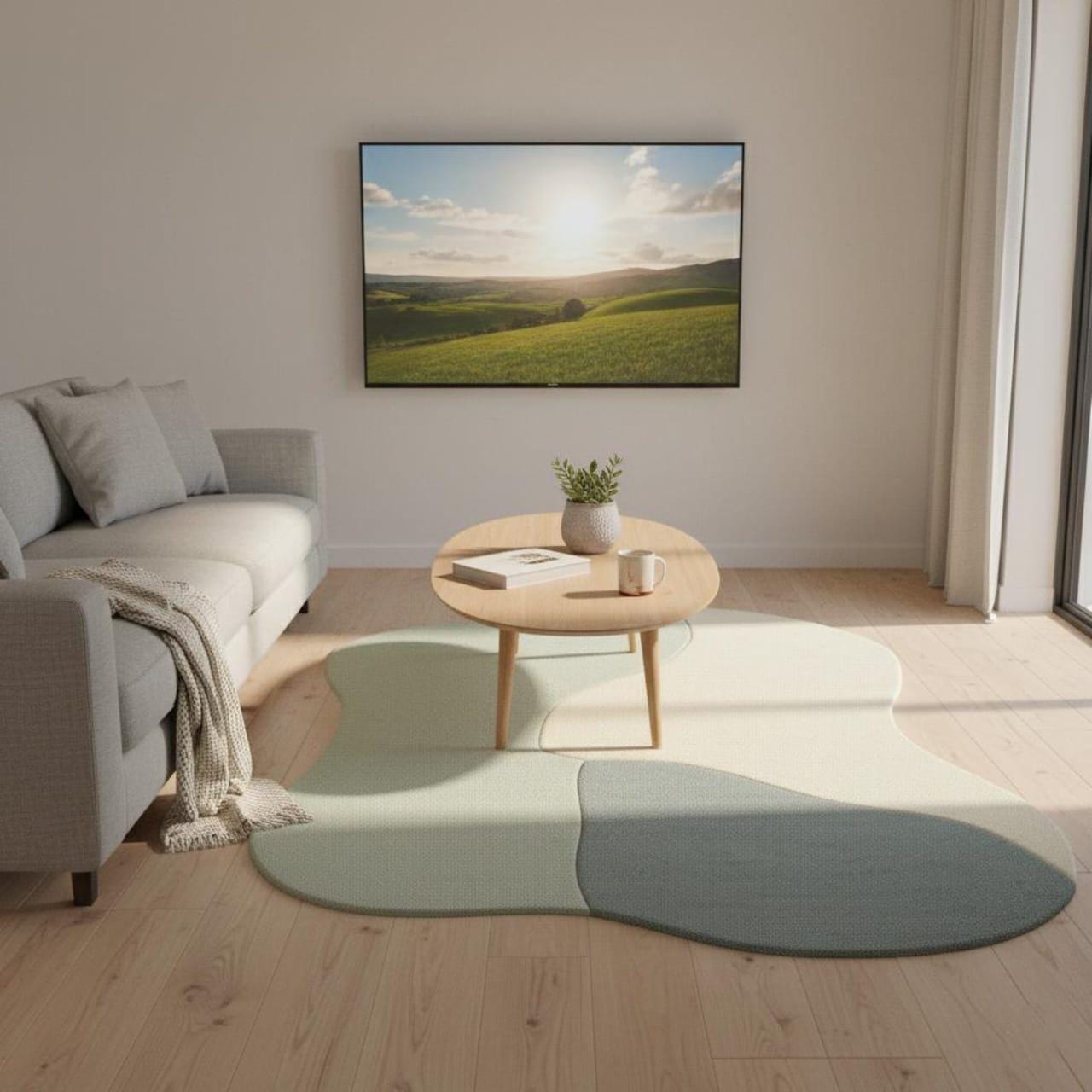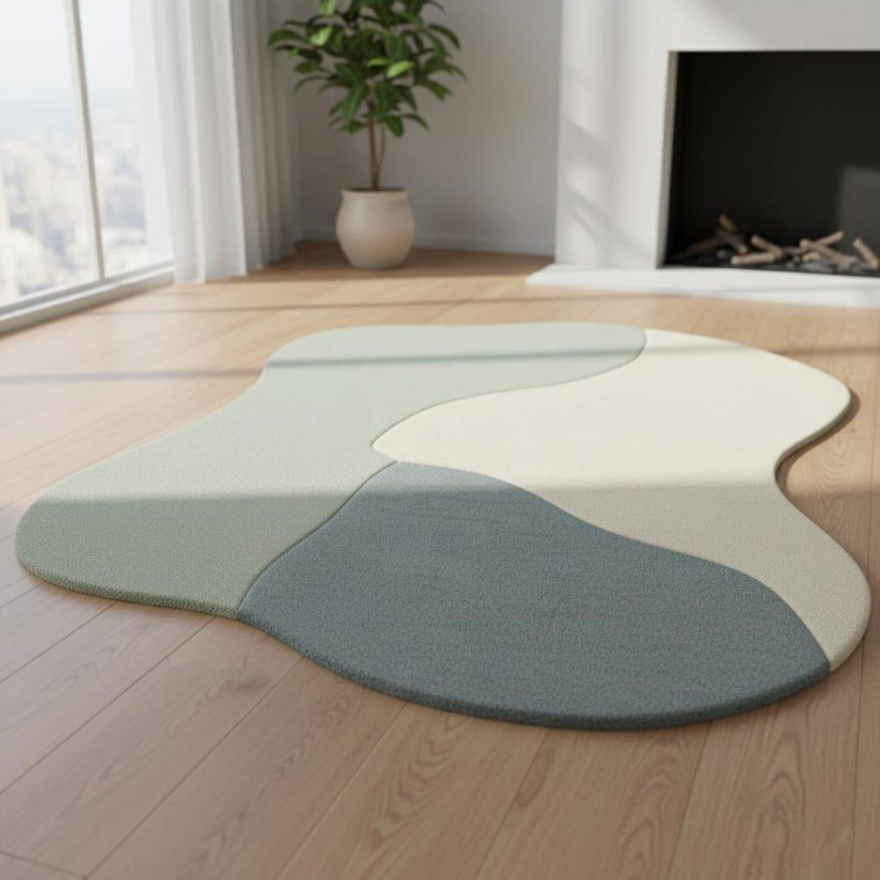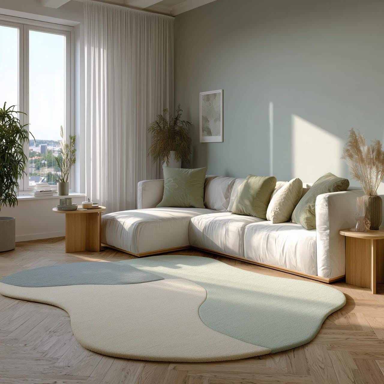 This rug is a celebration of organic movement and modern minimalism. Designed with flowing, sculptural curves, it breaks away from traditional rectangular boundaries and introduces a sense of artistic freedom to your home. The palette blends sage green, muted eucalyptus, soft cream, and misty seafoam — tones inspired by rolling hills and serene landscapes.