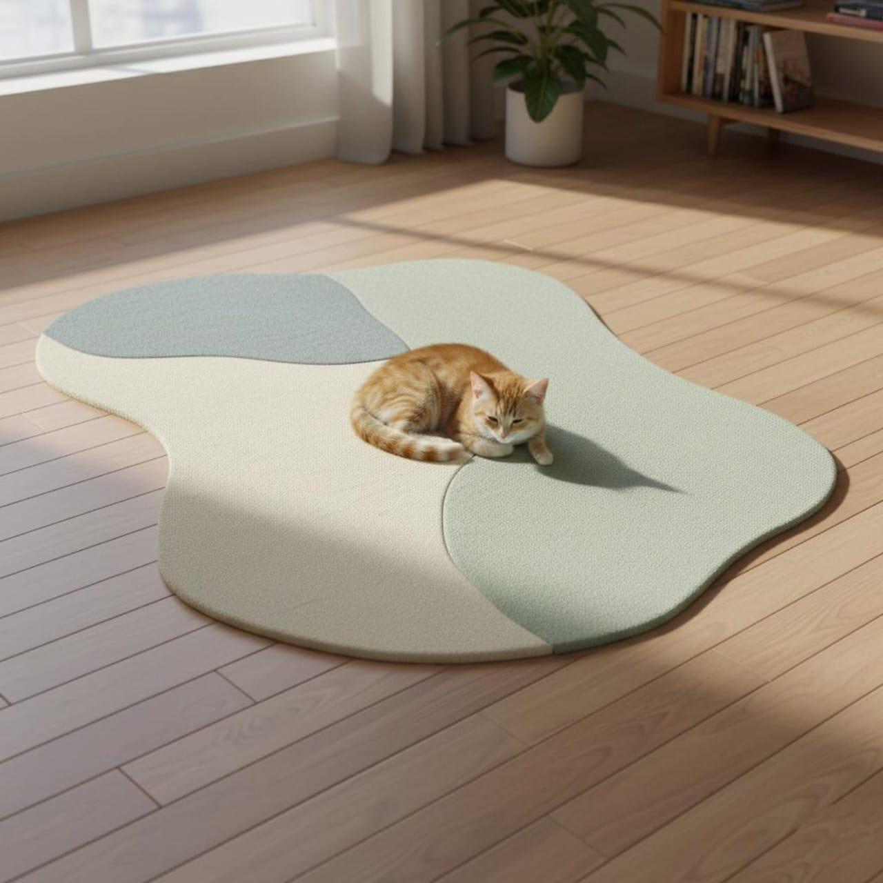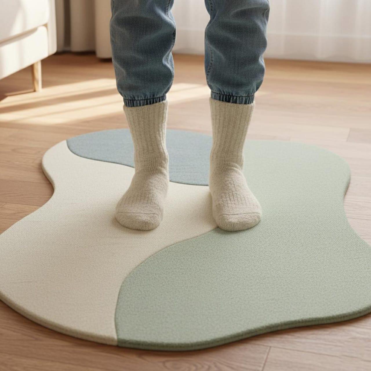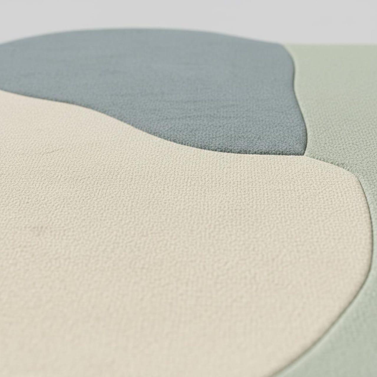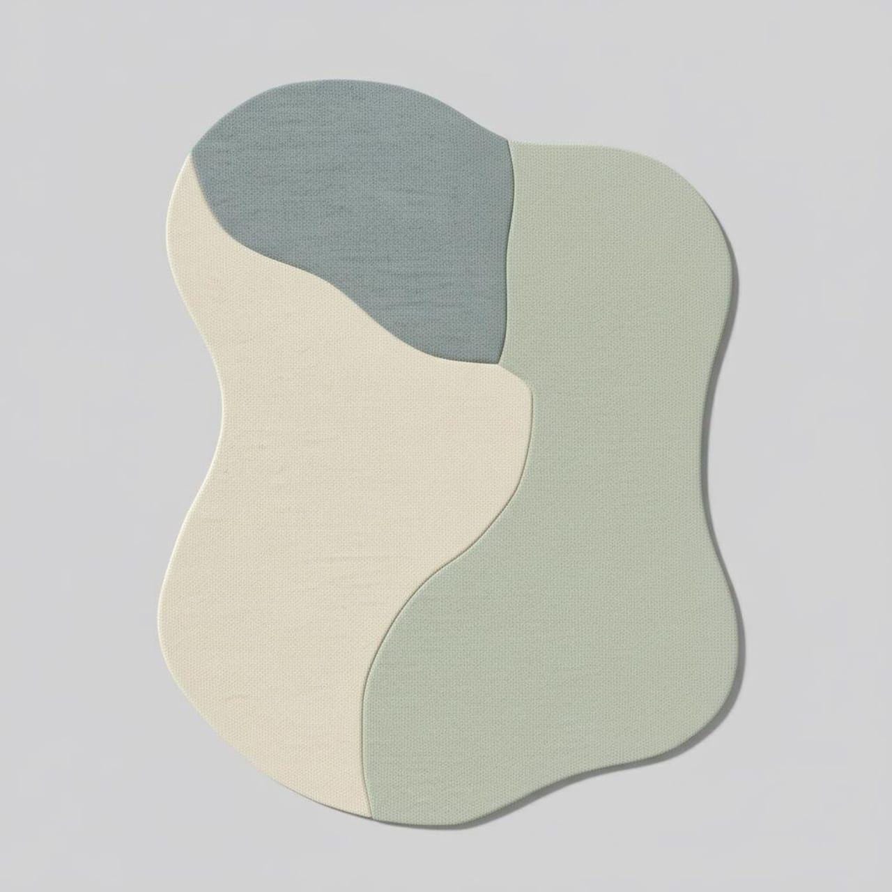 This rug is a celebration of organic movement and modern minimalism. Designed with flowing, sculptural curves, it breaks away from traditional rectangular boundaries and introduces a sense of artistic freedom to your home. The palette blends sage green, muted eucalyptus, soft cream, and misty seafoam — tones inspired by rolling hills and serene landscapes.