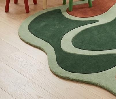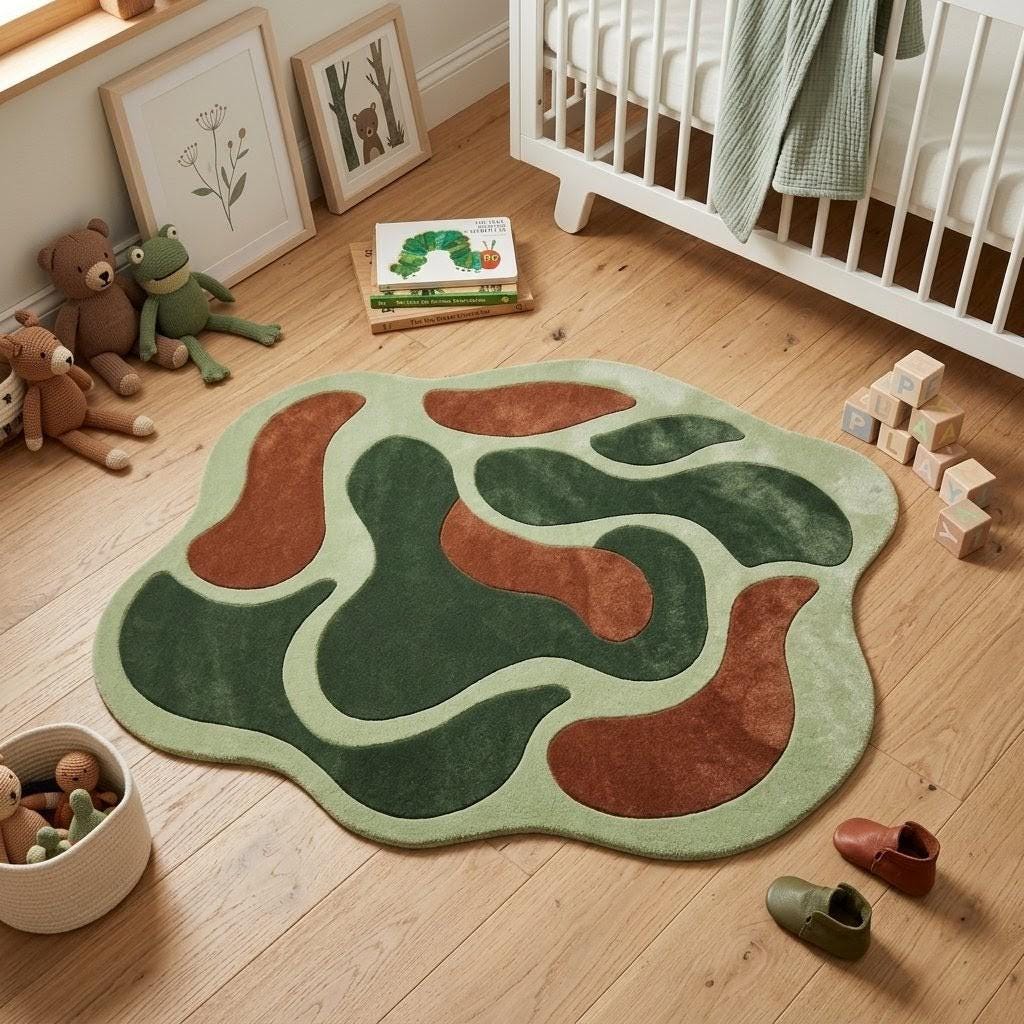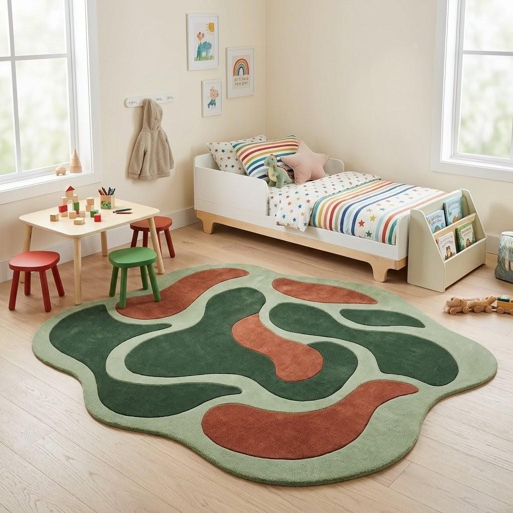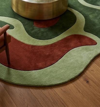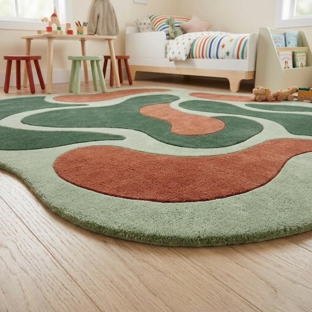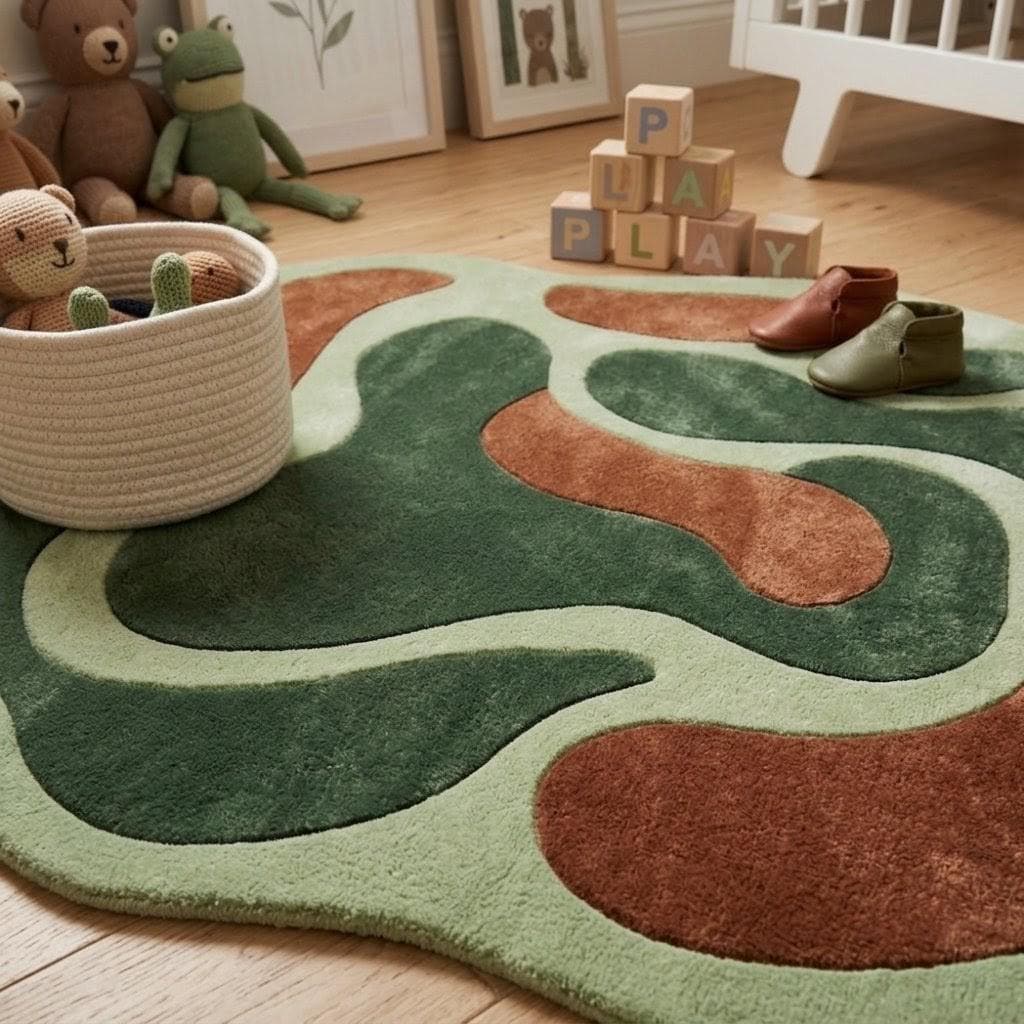This rug features a striking organic abstract design with flowing, irregular shapes in rich forest green, soft sage, and warm terracotta tones. Inspired by mid-century modern and contemporary interiors, it adds a playful yet grounded aesthetic—perfect for creating a statement while still feeling natural and serene. Its fluid pattern mimics nature’s curves, making it ideal for modern, boho, and Scandinavian-inspired spaces.