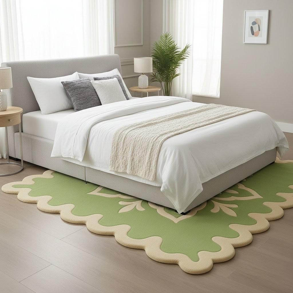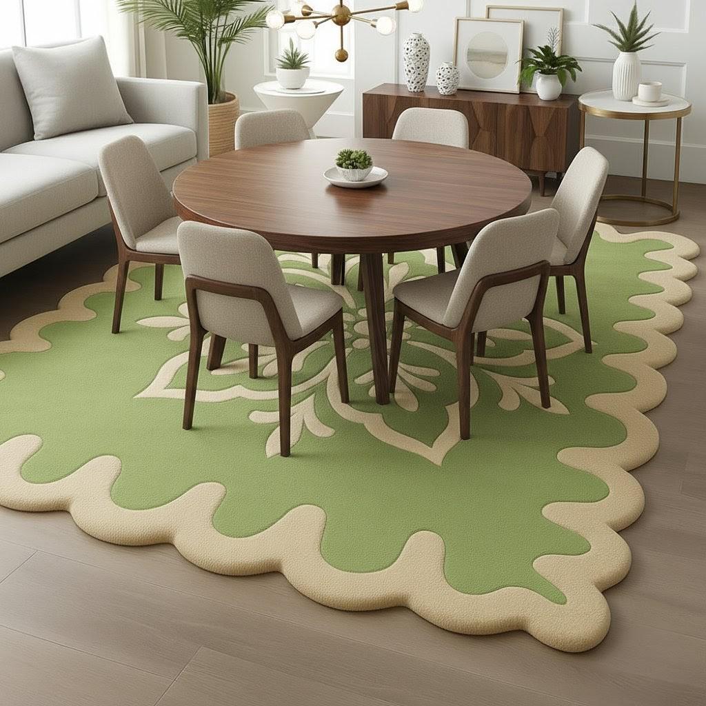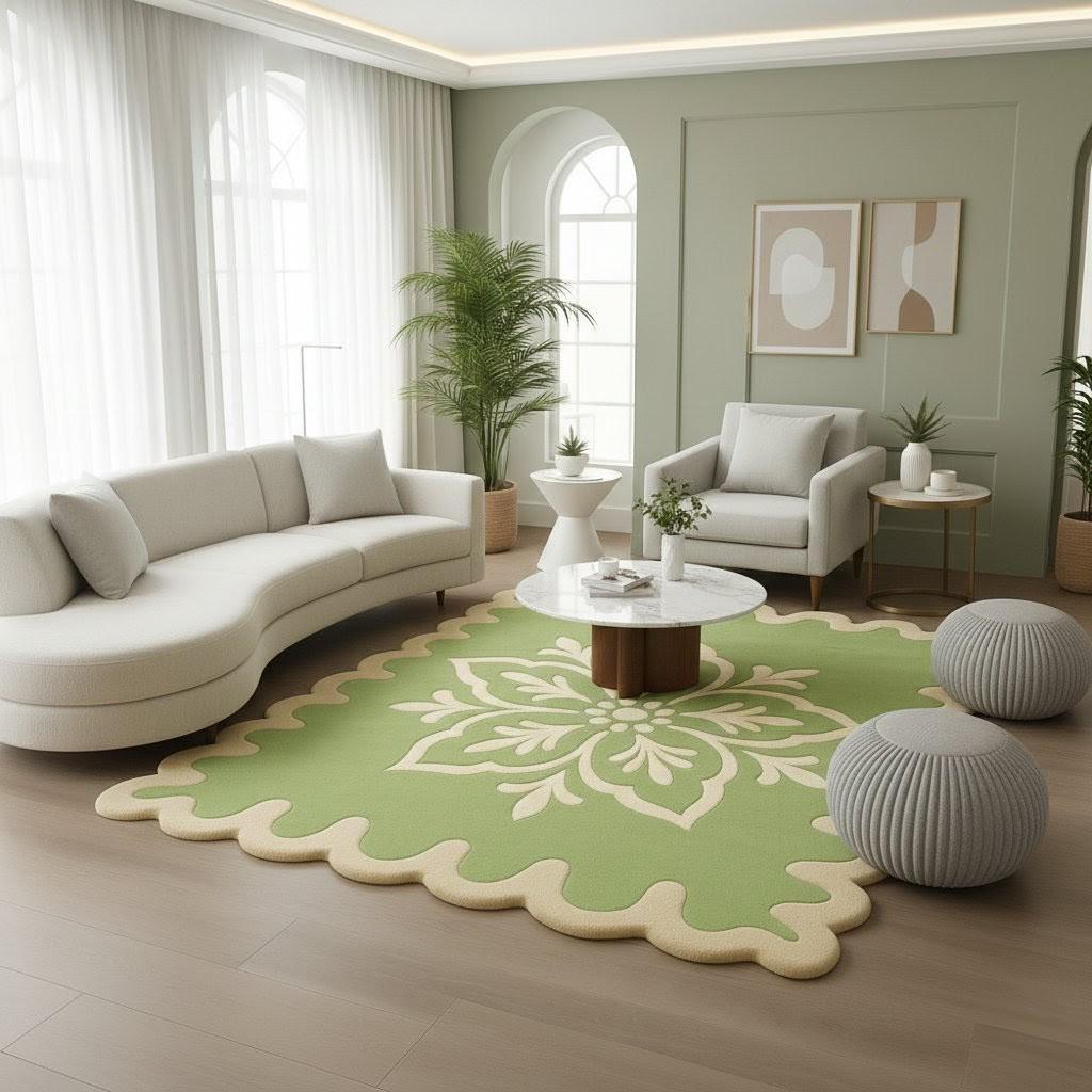 Transform your space with this beautifully designed Green Floral Scallop Rug, crafted to bring a blend of elegance, comfort, and modern style to any room. With its soft green tone, wave-edged border, and delicate floral detailing, this rug works perfectly as a centerpiece in living rooms, bedrooms, dining areas, reading corners, or studio interiors.