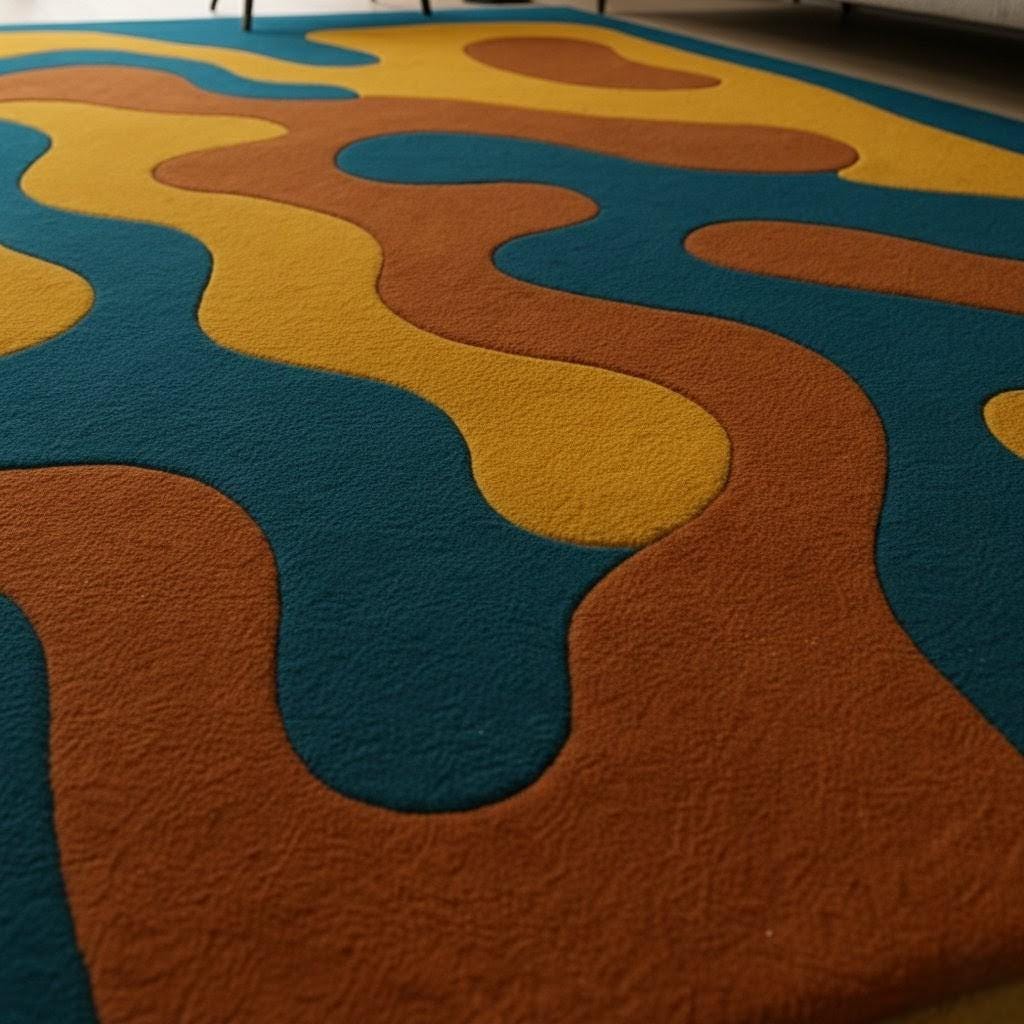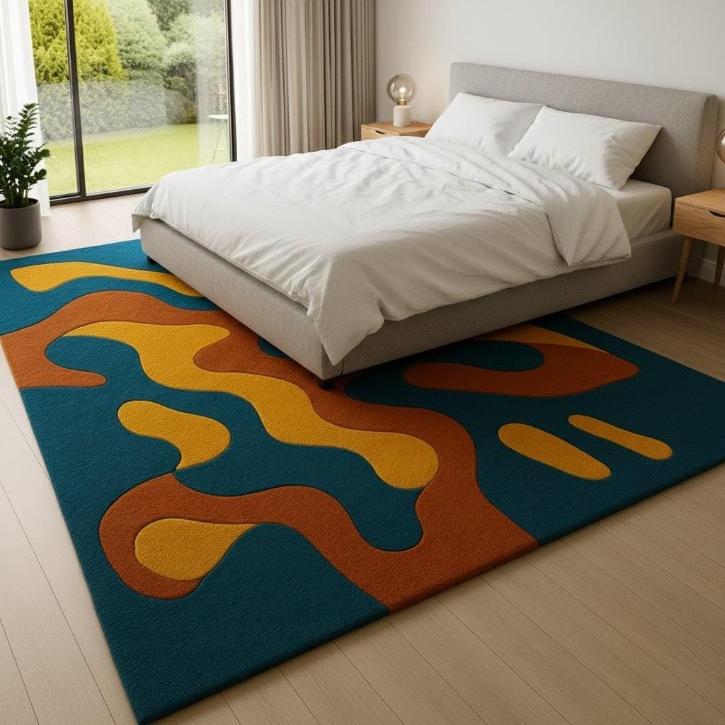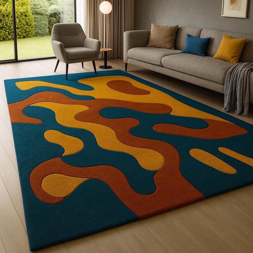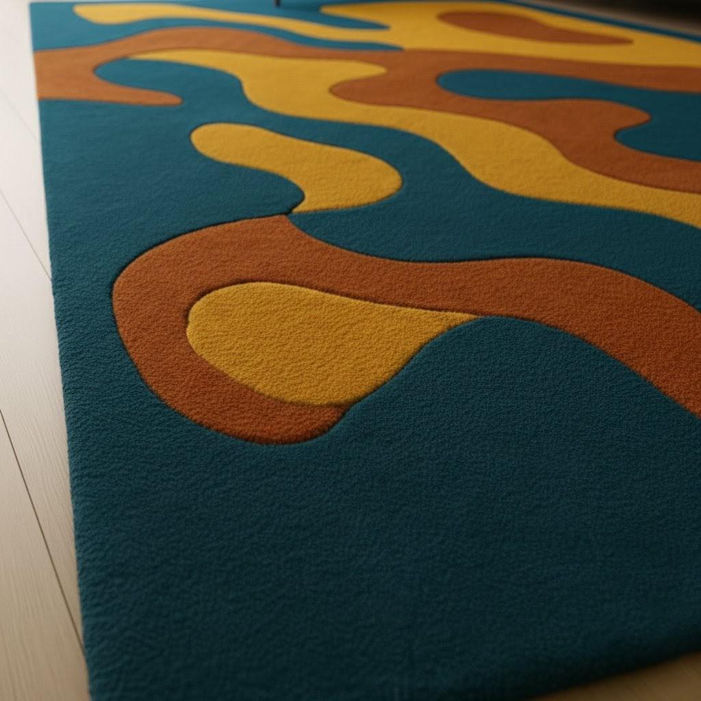Add a bold touch of creativity to your space with this Modern Abstract Wavy Pattern Rug. Designed with flowing shapes in warm tones of teal, mustard yellow, and burnt orange, this piece brings art and comfort together in the most beautiful way. Perfect for living rooms, bedrooms, balconies, reading