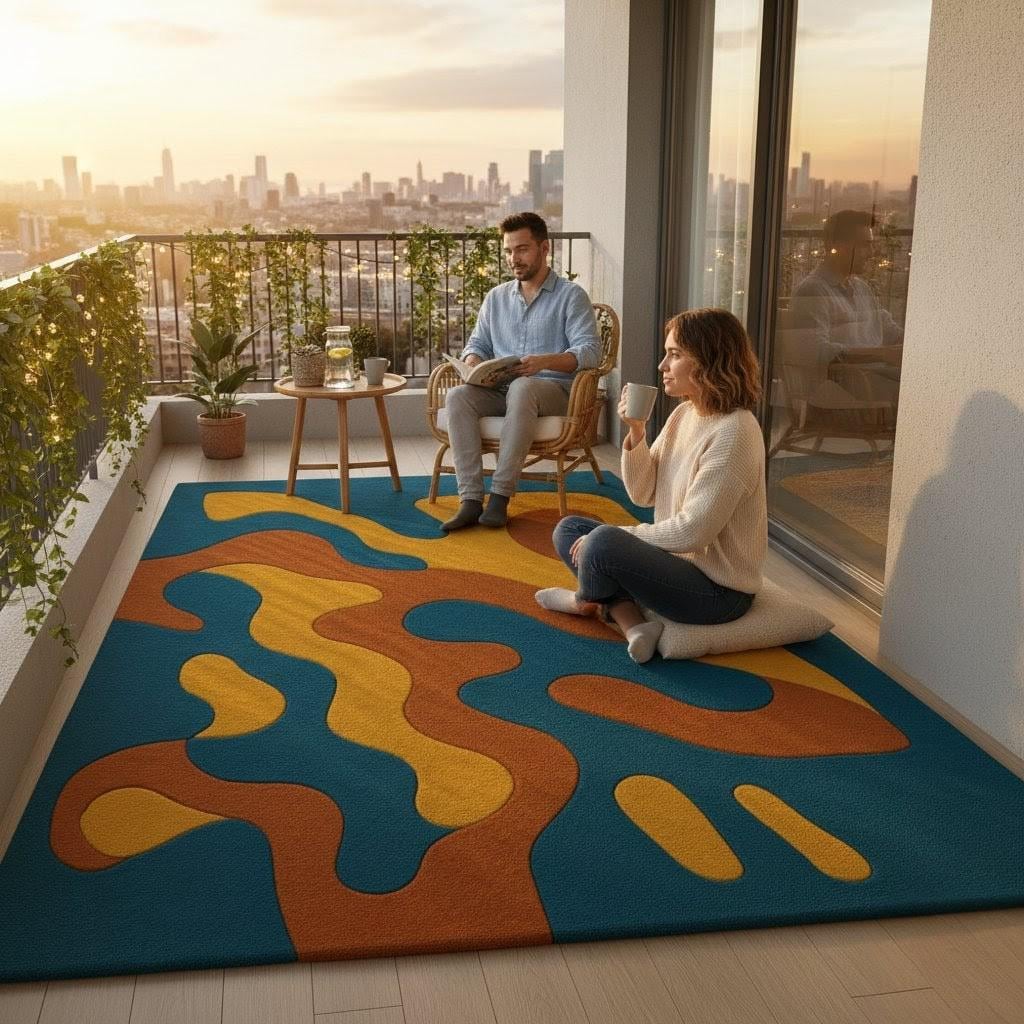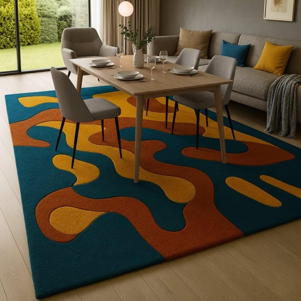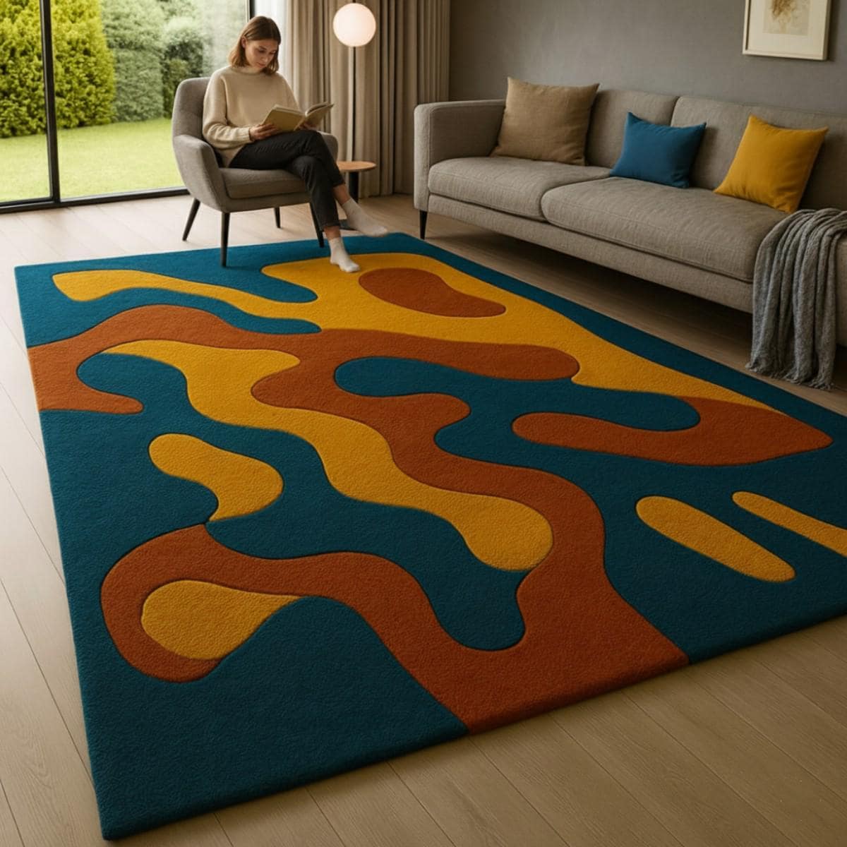 Add a bold touch of creativity to your space with this Modern Abstract Wavy Pattern Rug. Designed with flowing shapes in warm tones of teal, mustard yellow, and burnt orange, this piece brings art and comfort together in the most beautiful way. Perfect for living rooms, bedrooms, balconies, reading
