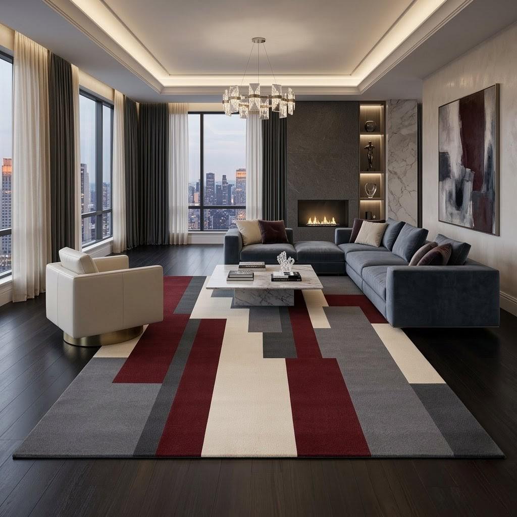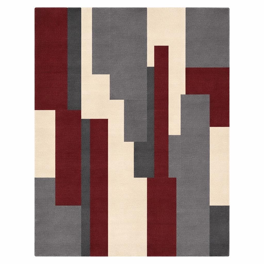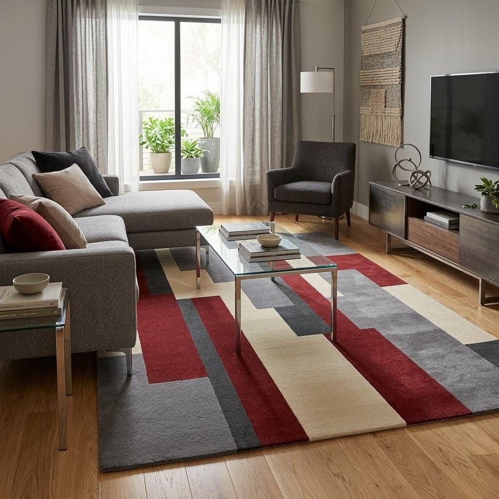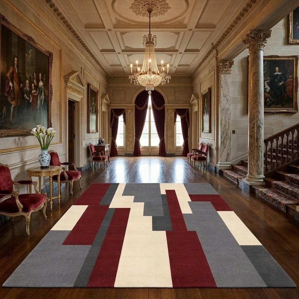 This striking geometric rug is a celebration of modern artistry and architectural balance. Featuring bold linear compositions in deep red, charcoal gray, and soft cream, the design evokes a sense of structured elegance while maintaining warmth and approachability. The layered blocks and directional lines create visual movement, making this piece not just a rug—but a statement. Inspired by mid-century modern aesthetics with a contemporary twist, it seamlessly blends into both minimalist and curated interiors.