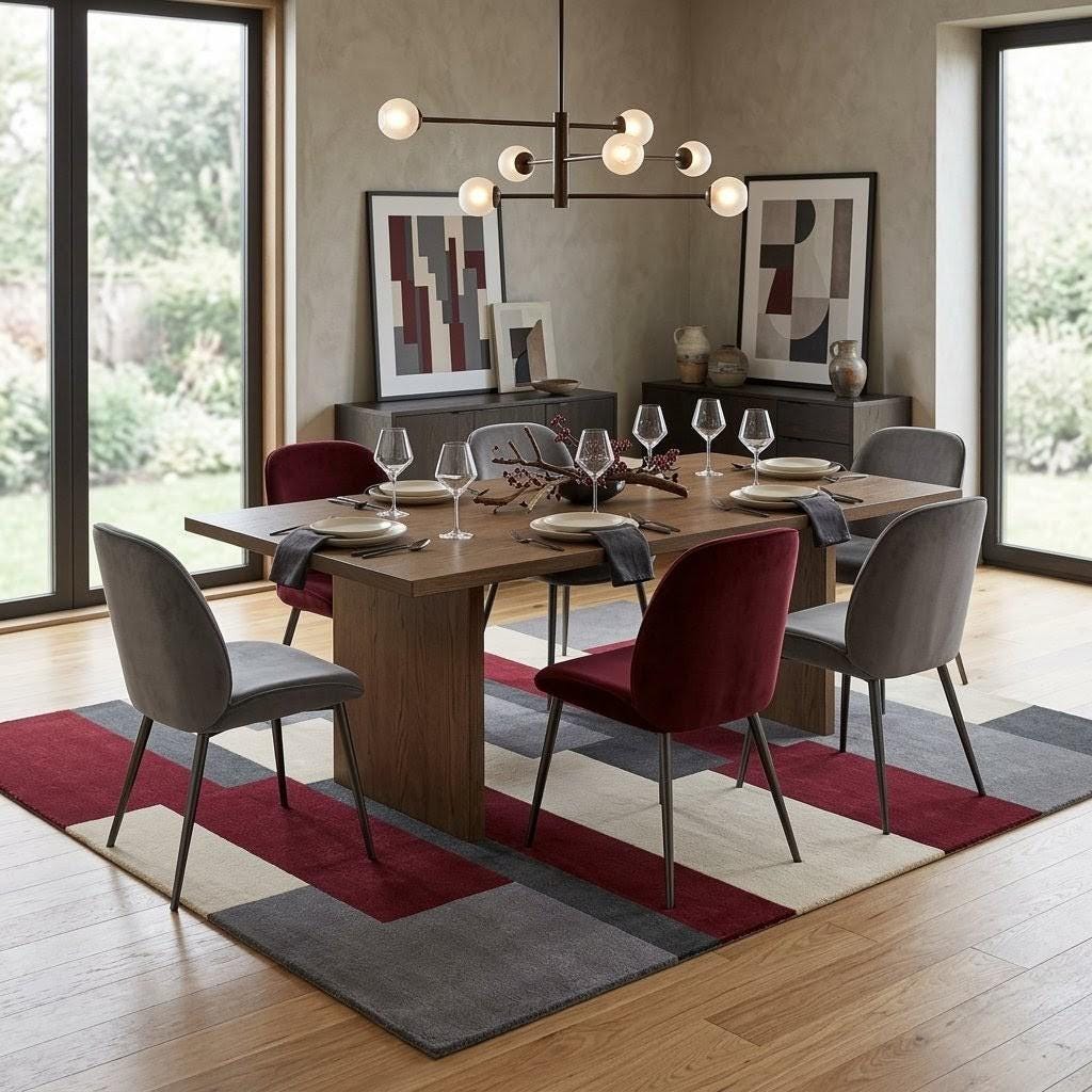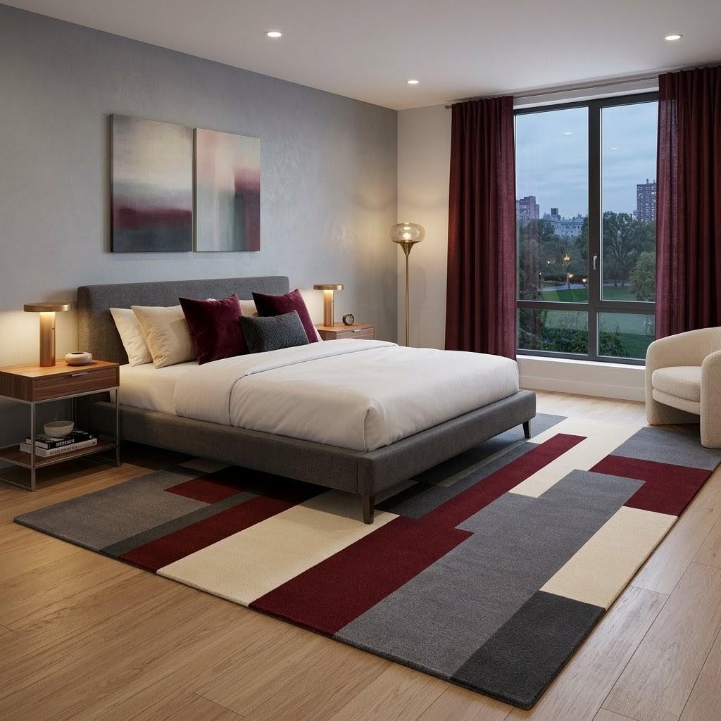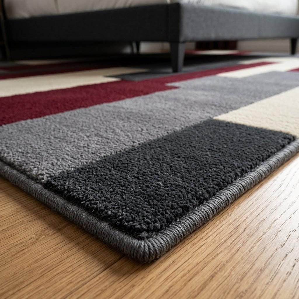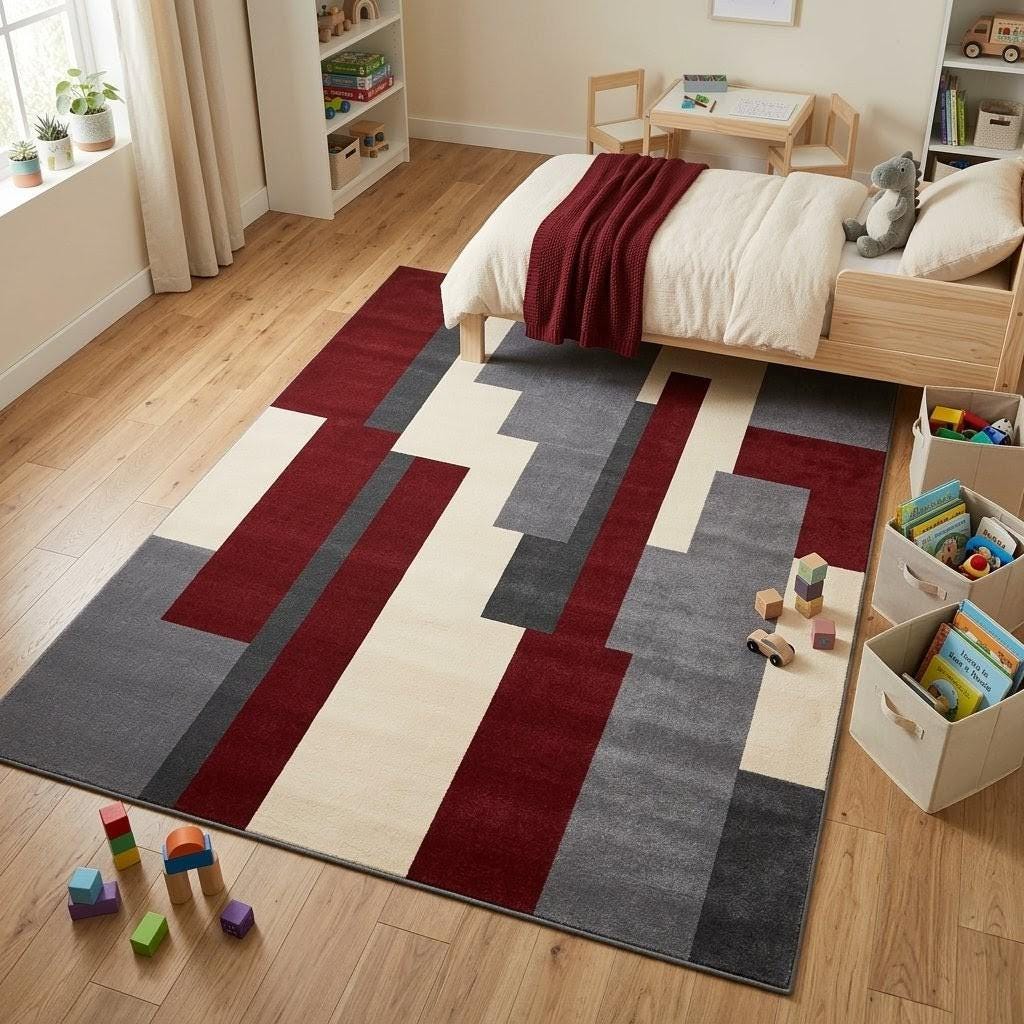 This striking geometric rug is a celebration of modern artistry and architectural balance. Featuring bold linear compositions in deep red, charcoal gray, and soft cream, the design evokes a sense of structured elegance while maintaining warmth and approachability. The layered blocks and directional lines create visual movement, making this piece not just a rug—but a statement. Inspired by mid-century modern aesthetics with a contemporary twist, it seamlessly blends into both minimalist and curated interiors.