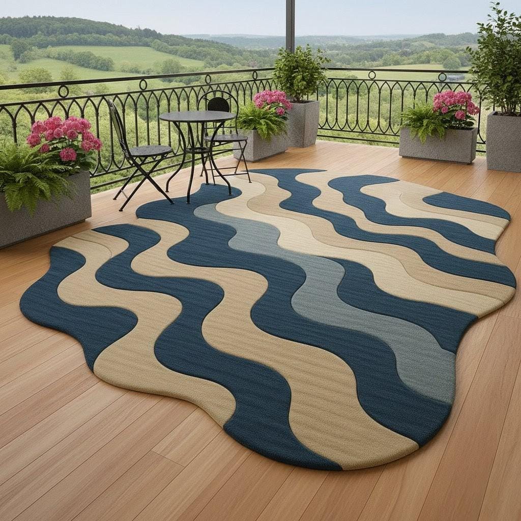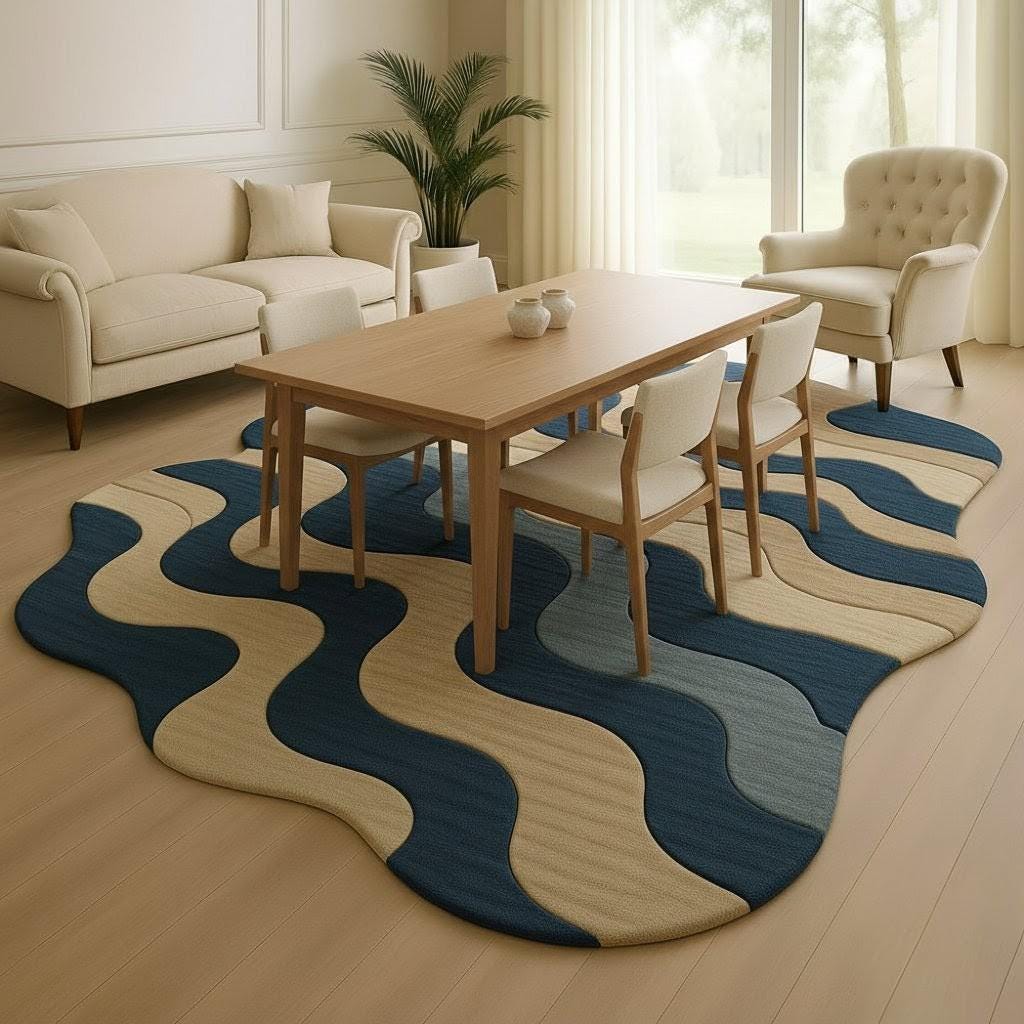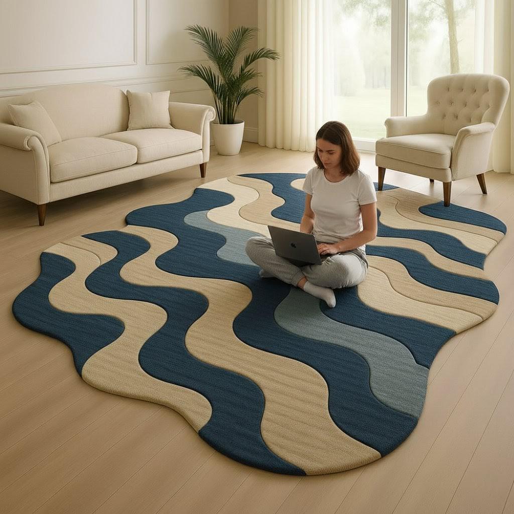 Bring a touch of modern elegance to your space with this beautiful wavy patterned area rug, designed to make any room feel warm, stylish, and full of personality. Inspired by flowing waves and natural tones, this rug blends deep blue, beige, and soft grey to create a soothing visual statement that complements both minimal and contemporary interiors.