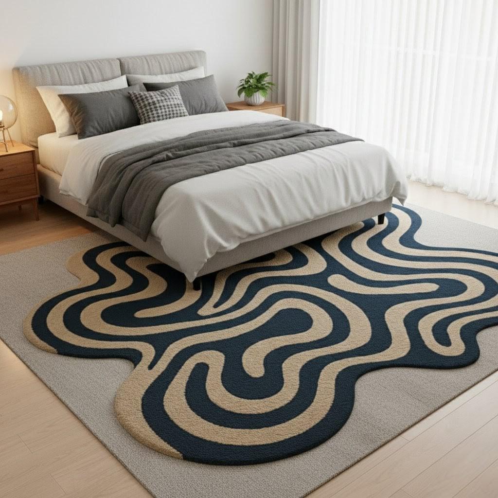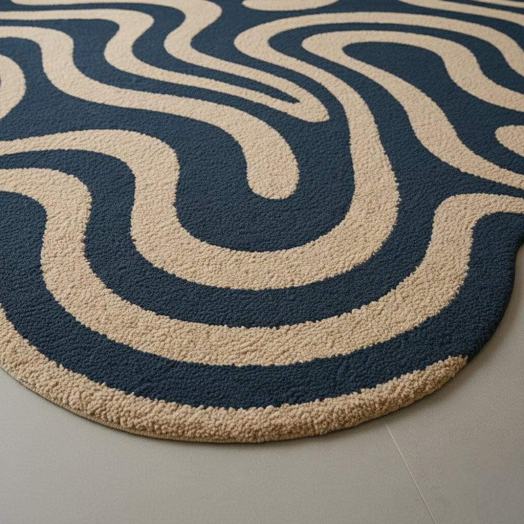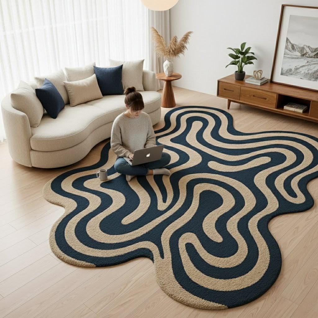 This unique abstract wavy carpet is designed to stand out as a statement piece in any space. With its organic blob shape and modern flowing wave pattern in deep navy and beige tones, it instantly adds personality, warmth, and a stylish contemporary vibe to your home.