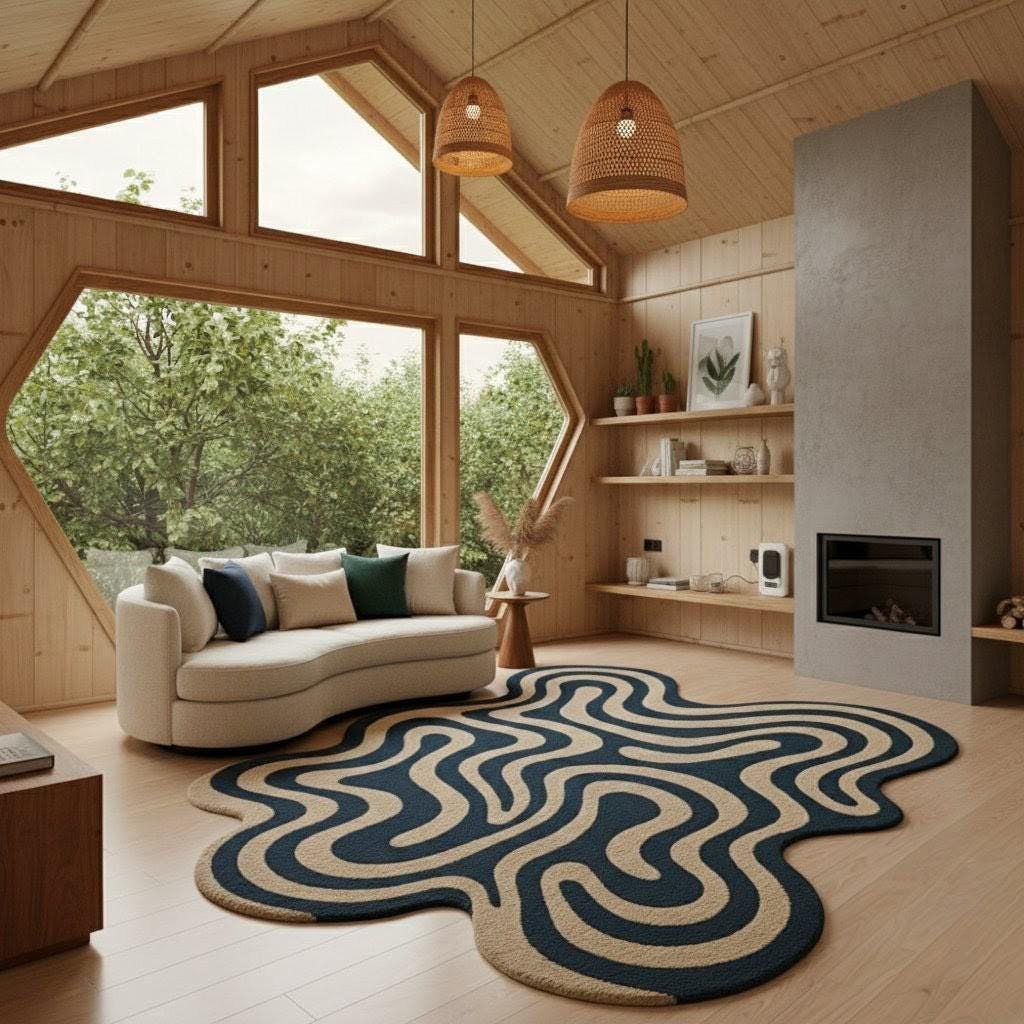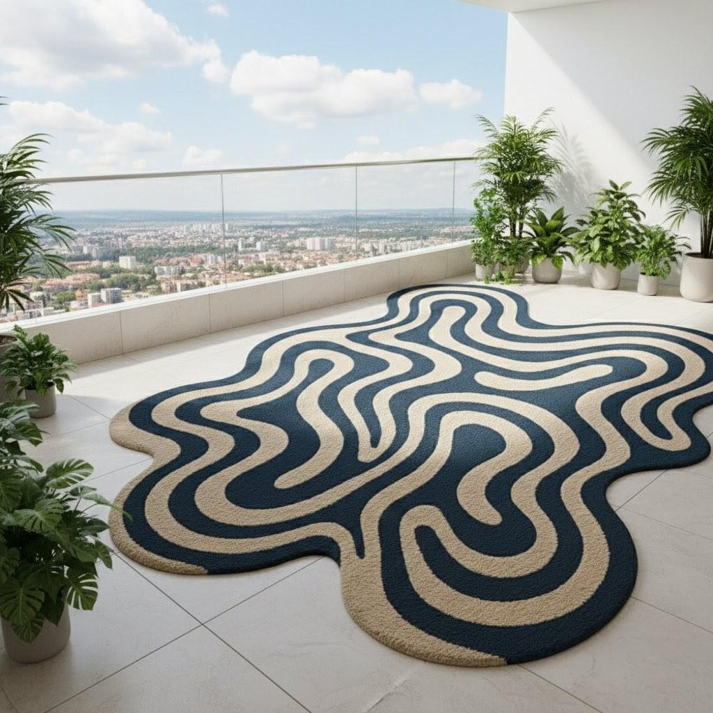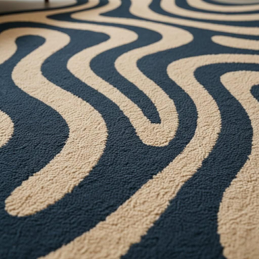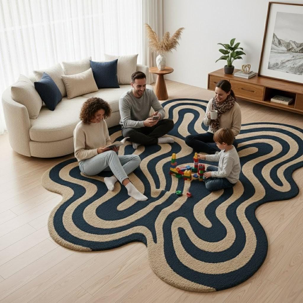 This unique abstract wavy carpet is designed to stand out as a statement piece in any space. With its organic blob shape and modern flowing wave pattern in deep navy and beige tones, it instantly adds personality, warmth, and a stylish contemporary vibe to your home.