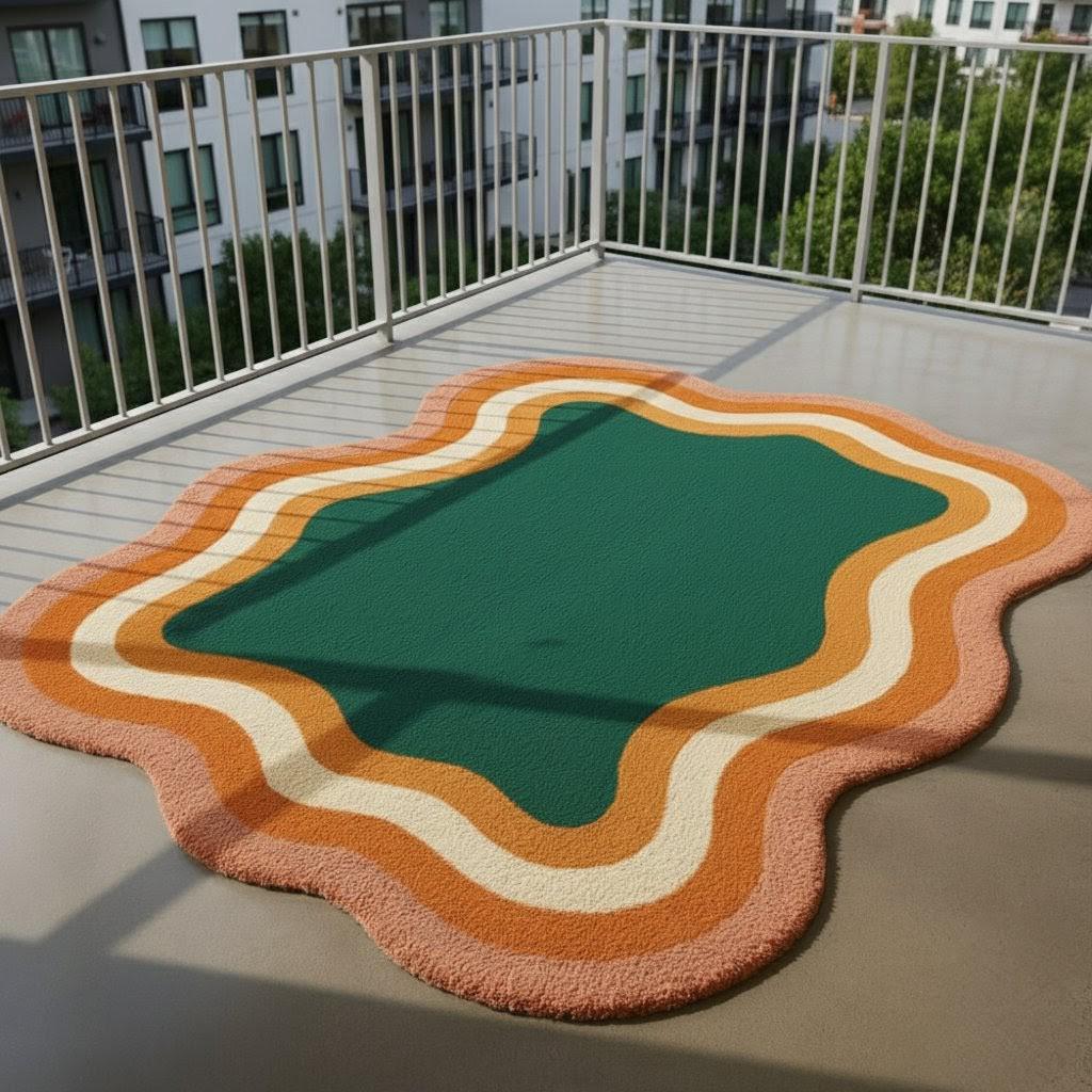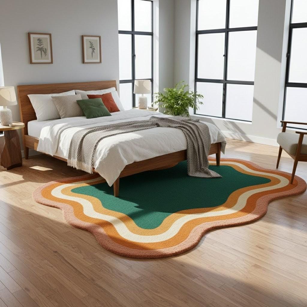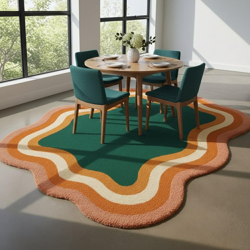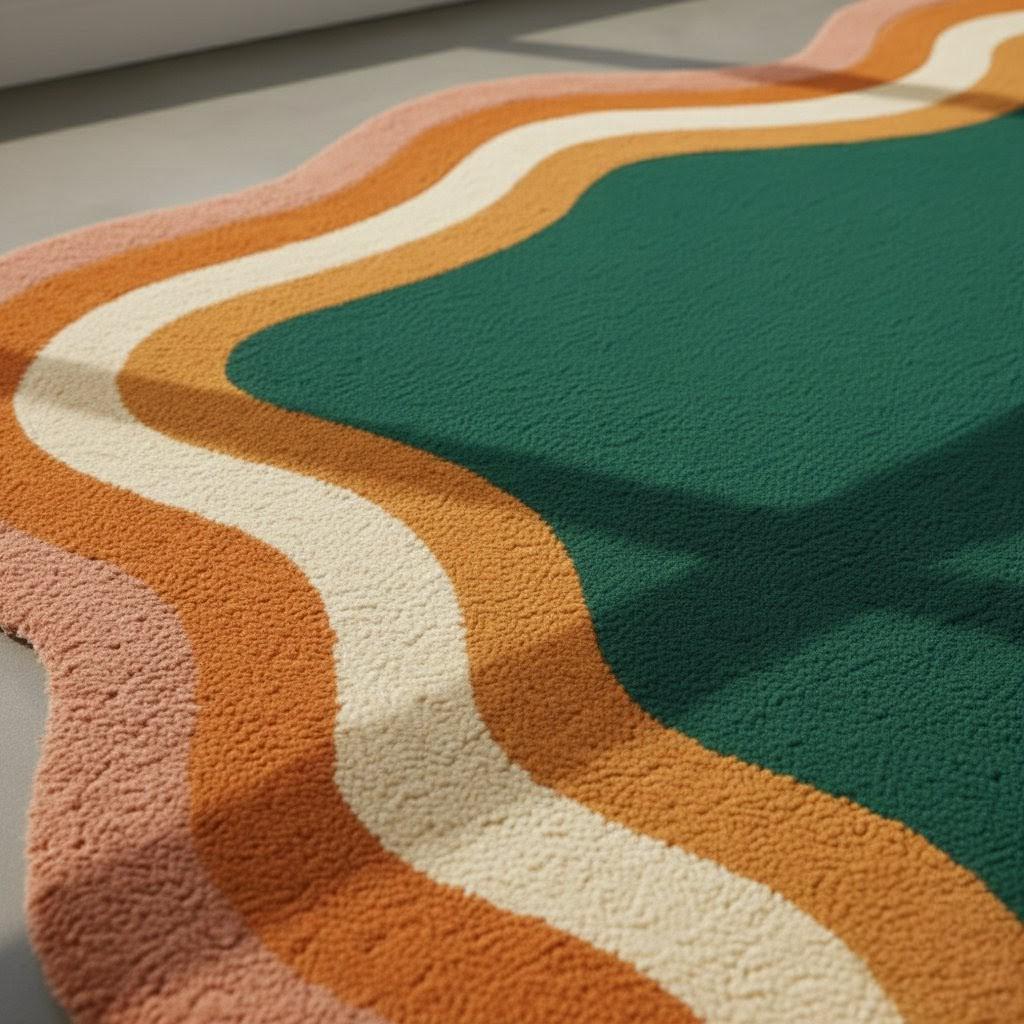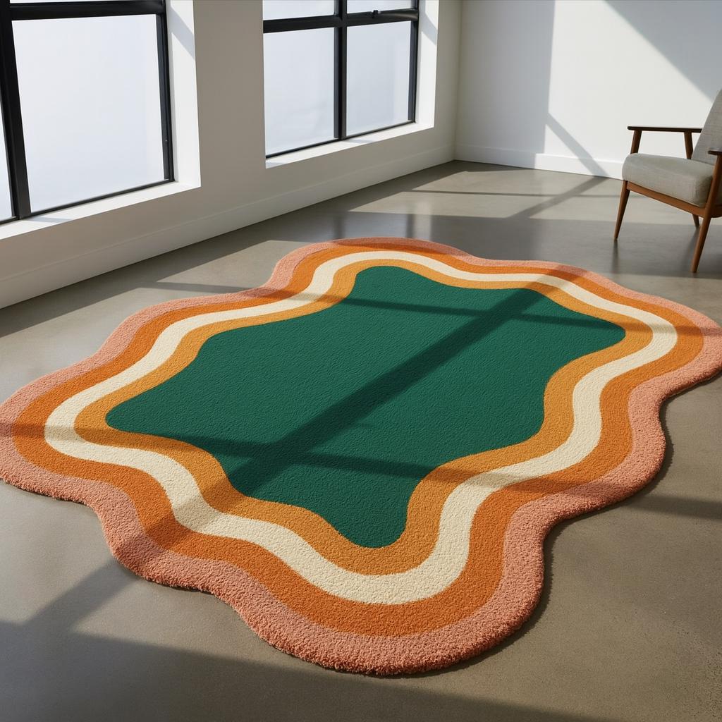 Bring bold personality to your space with this stunning Retro Wavy Area Rug, featuring a vibrant blend of emerald green, burnt orange, mustard, and cream tones. Its unique abstract wave border adds a playful vintage charm, making it the perfect statement piece for any modern or mid-century inspired interior.