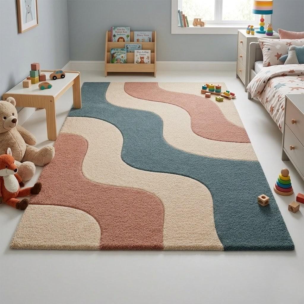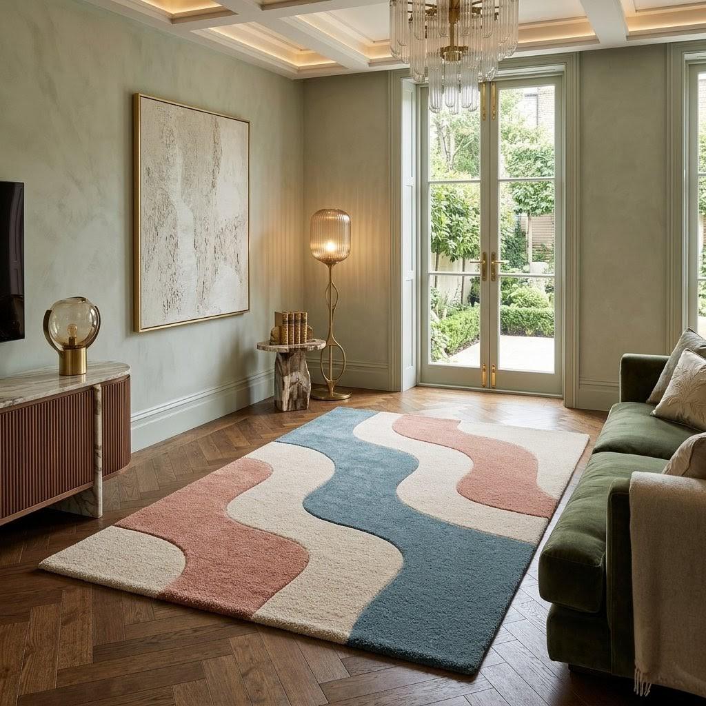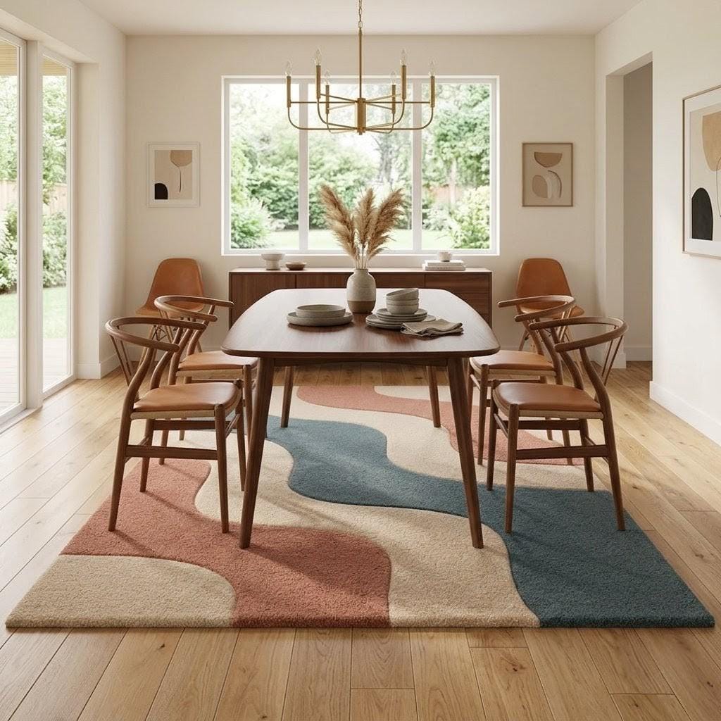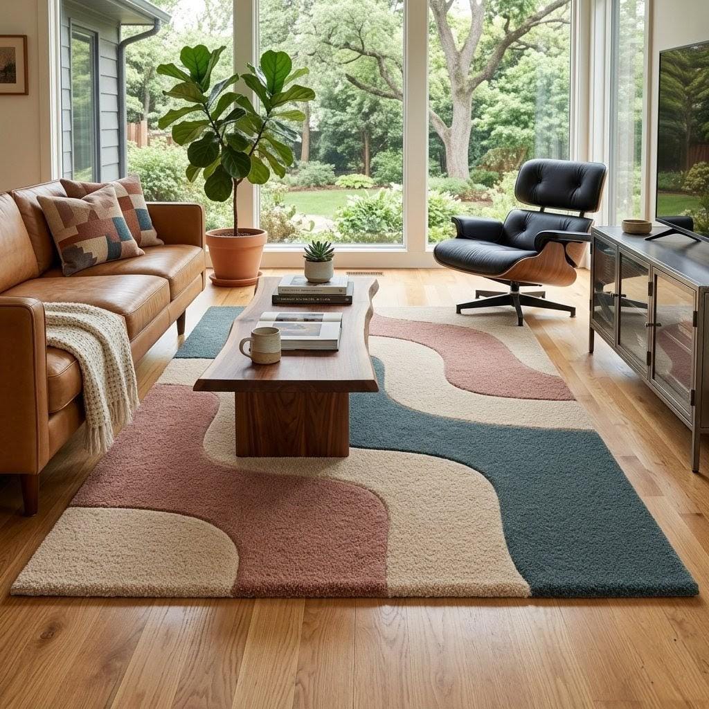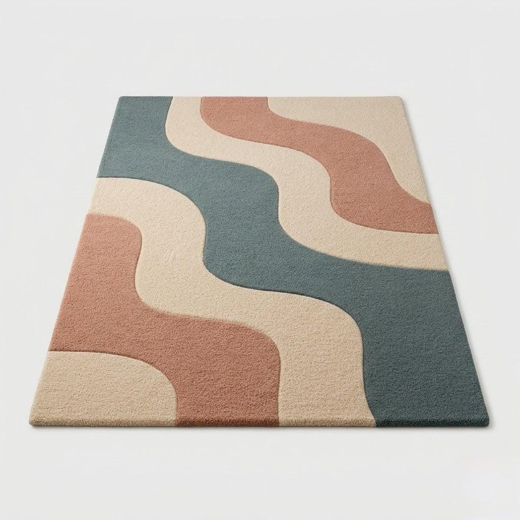 This rug features a mid-century modern abstract design with soft, organic waves flowing across a calming neutral base. The harmonious blend of beige, muted terracotta, and deep blue creates a balanced yet eye-catching statement piece. Its sculptural pattern adds movement and depth, making it perfect for modern, Scandinavian, and boho-inspired interiors.