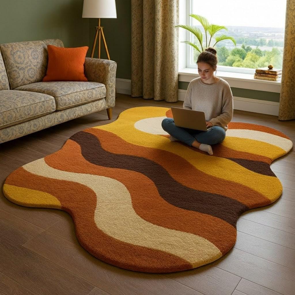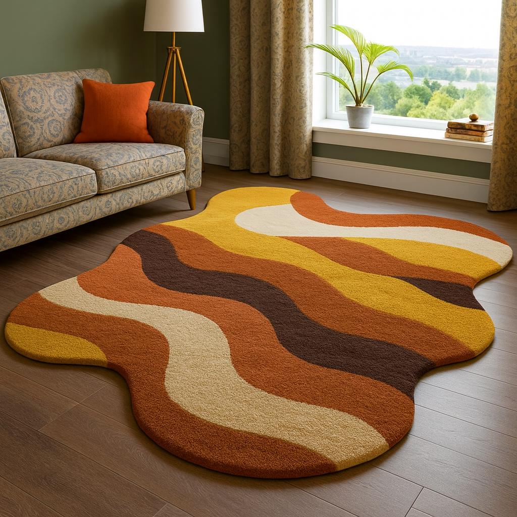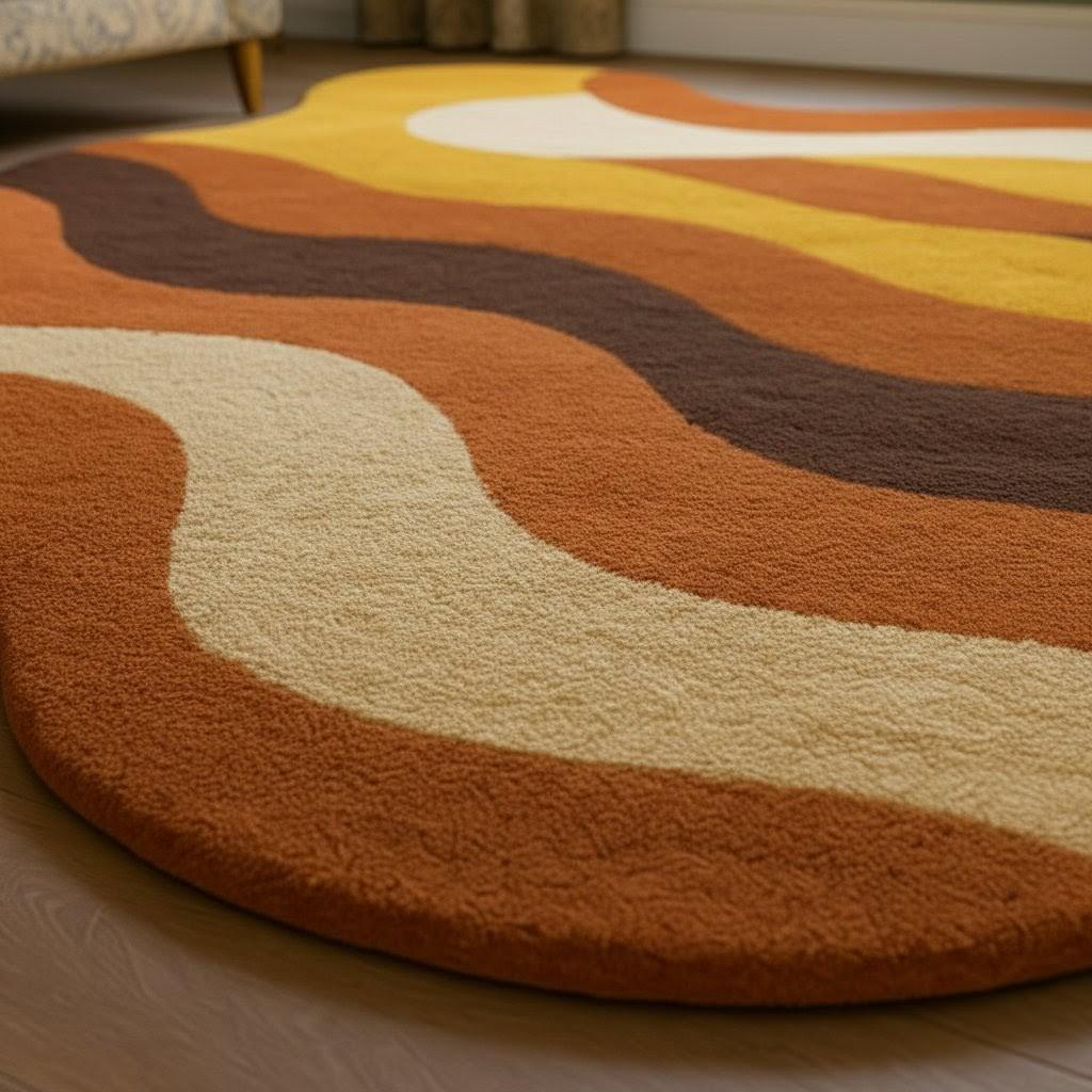 Transform your space with this gorgeous Retro Wavy Abstract Rug, designed to bring warmth, personality, and modern style to any room. The unique irregular organic shape paired with warm tones of mustard yellow, burnt orange, cream and brown makes it an eye-catching statement piece for minimalist, boho, and contemporary homes.