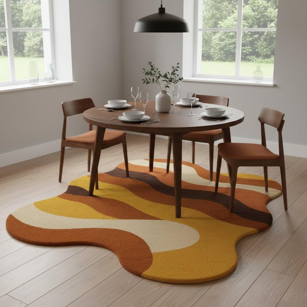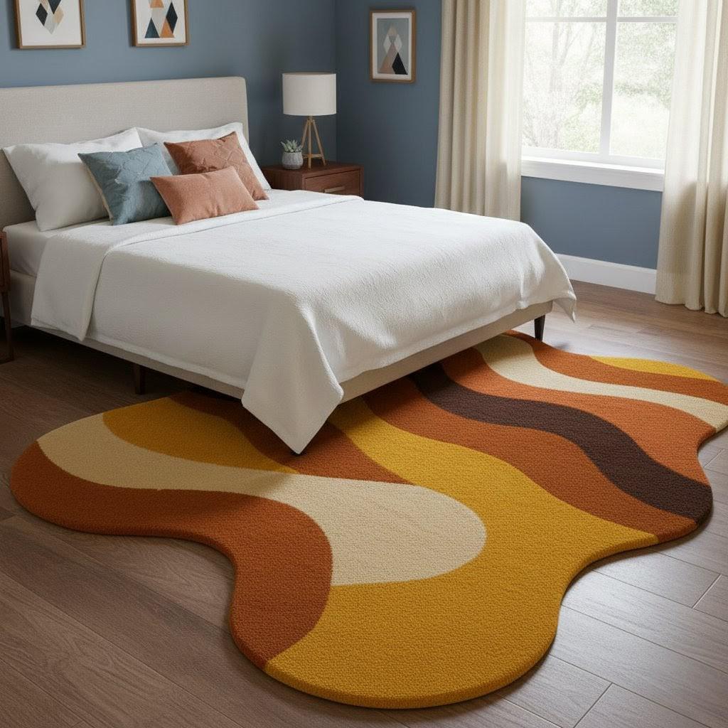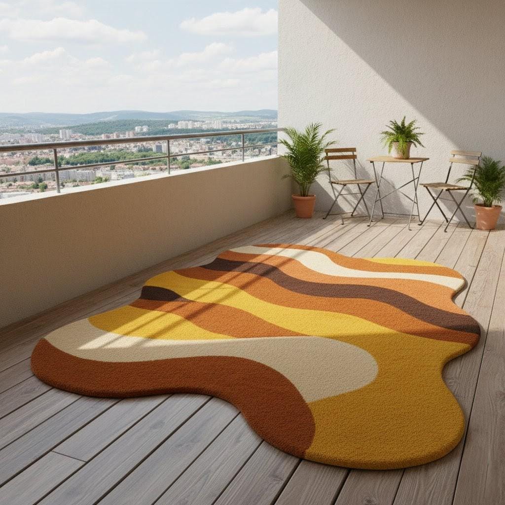 Transform your space with this gorgeous Retro Wavy Abstract Rug, designed to bring warmth, personality, and modern style to any room. The unique irregular organic shape paired with warm tones of mustard yellow, burnt orange, cream and brown makes it an eye-catching statement piece for minimalist, boho, and contemporary homes.