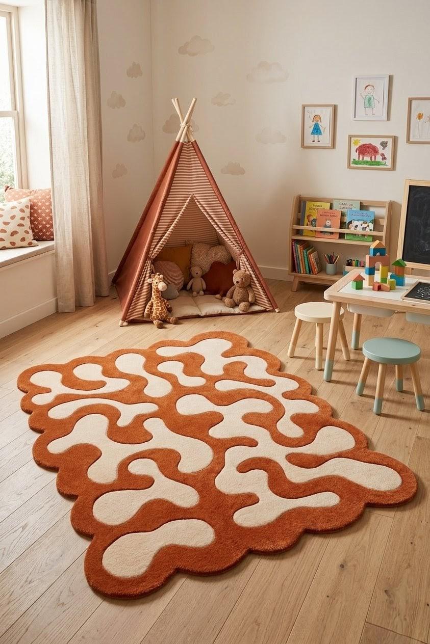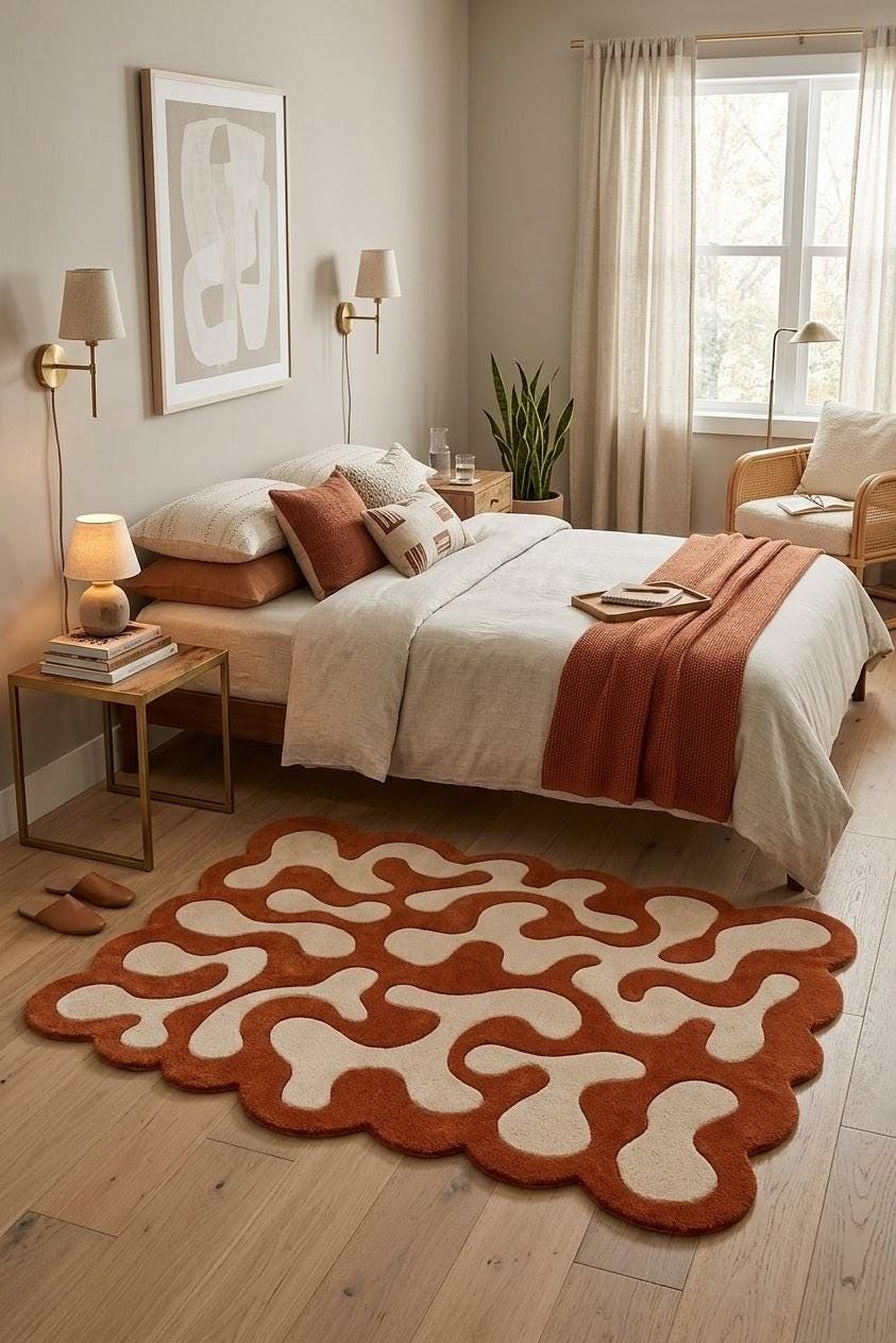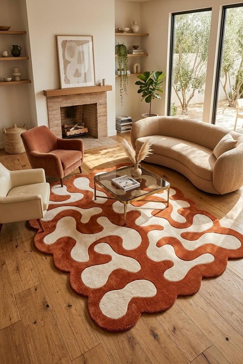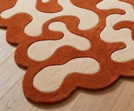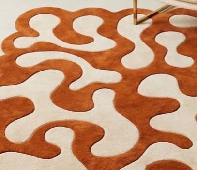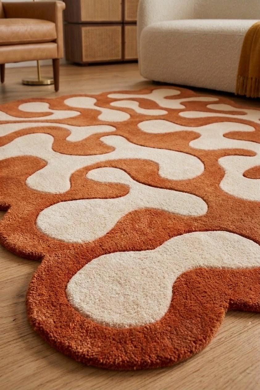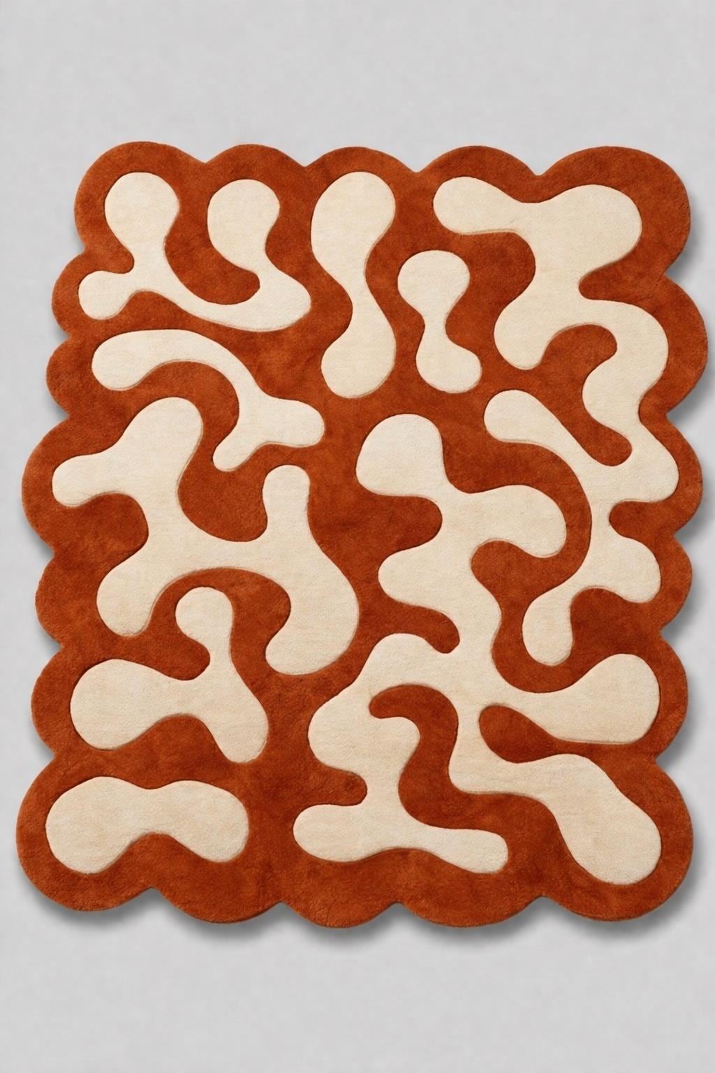 This rug features a striking abstract organic pattern with flowing, amoeba-like shapes in warm terracotta layered over a soft cream base. Inspired by modern and mid-century design, it blends seamlessly into contemporary, boho, and minimalist interiors. The sculptural silhouette adds movement and makes it a true statement piece.