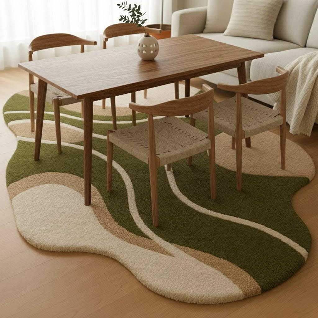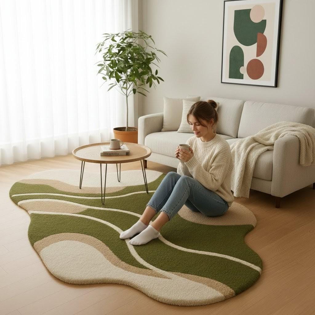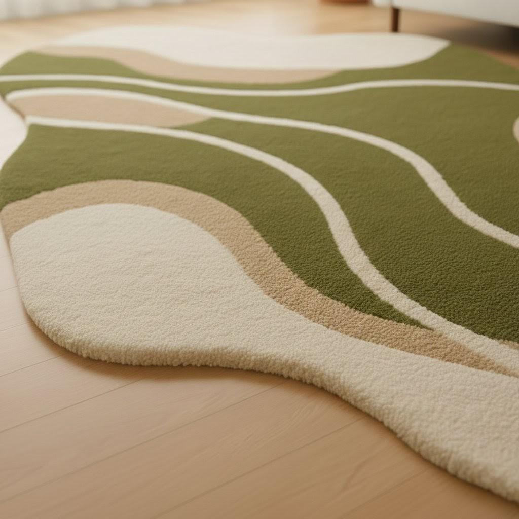 Handmade Wool Wave Area Rug – Modern Green Beige Carpet