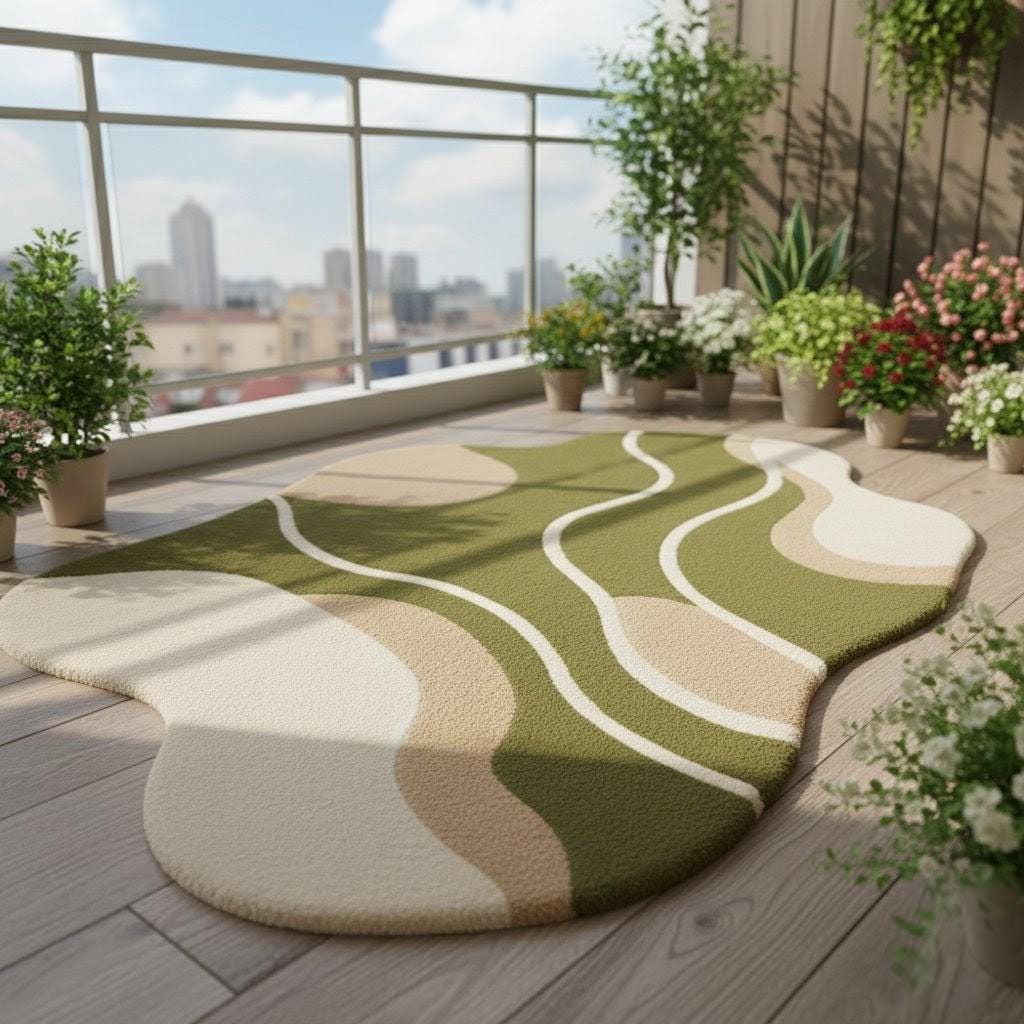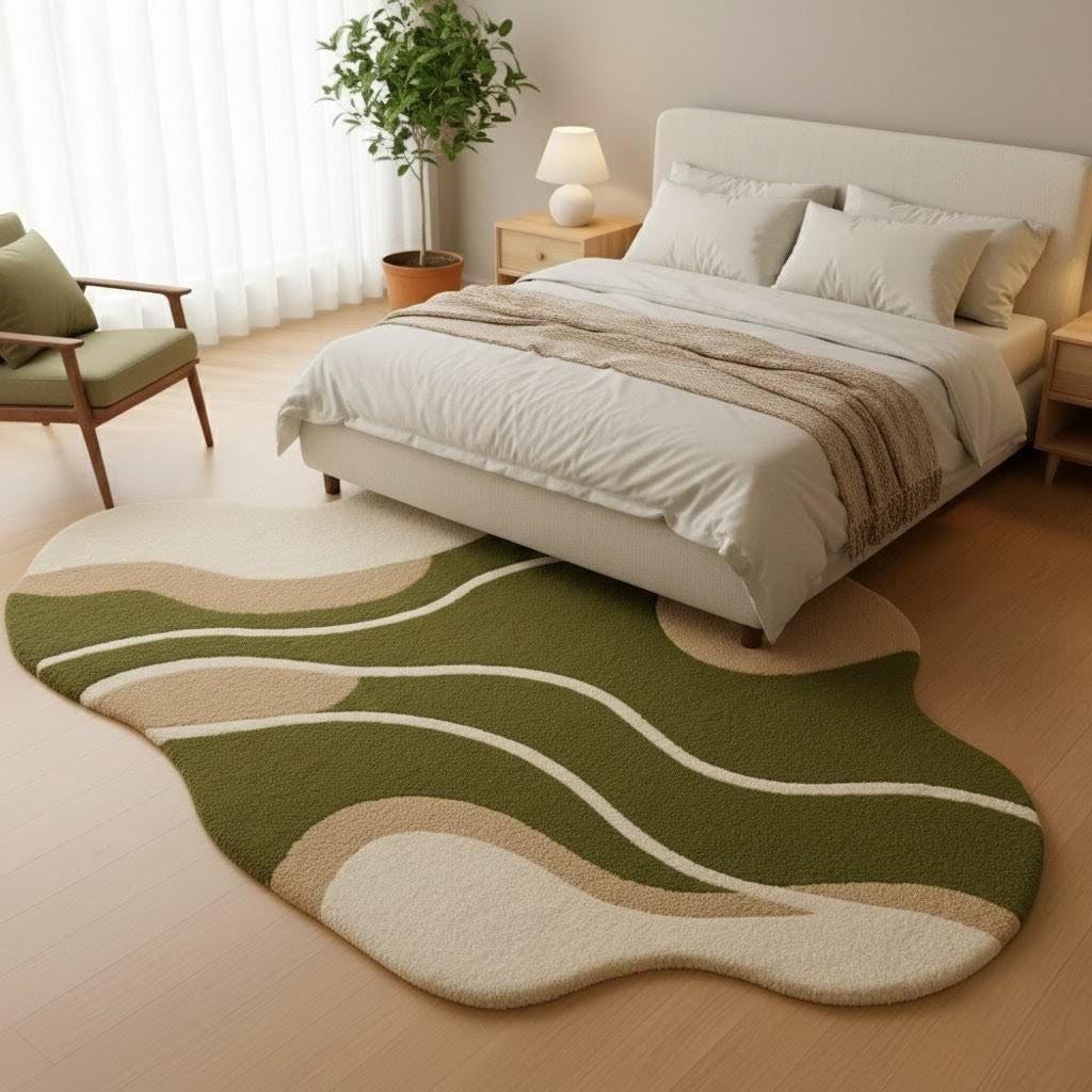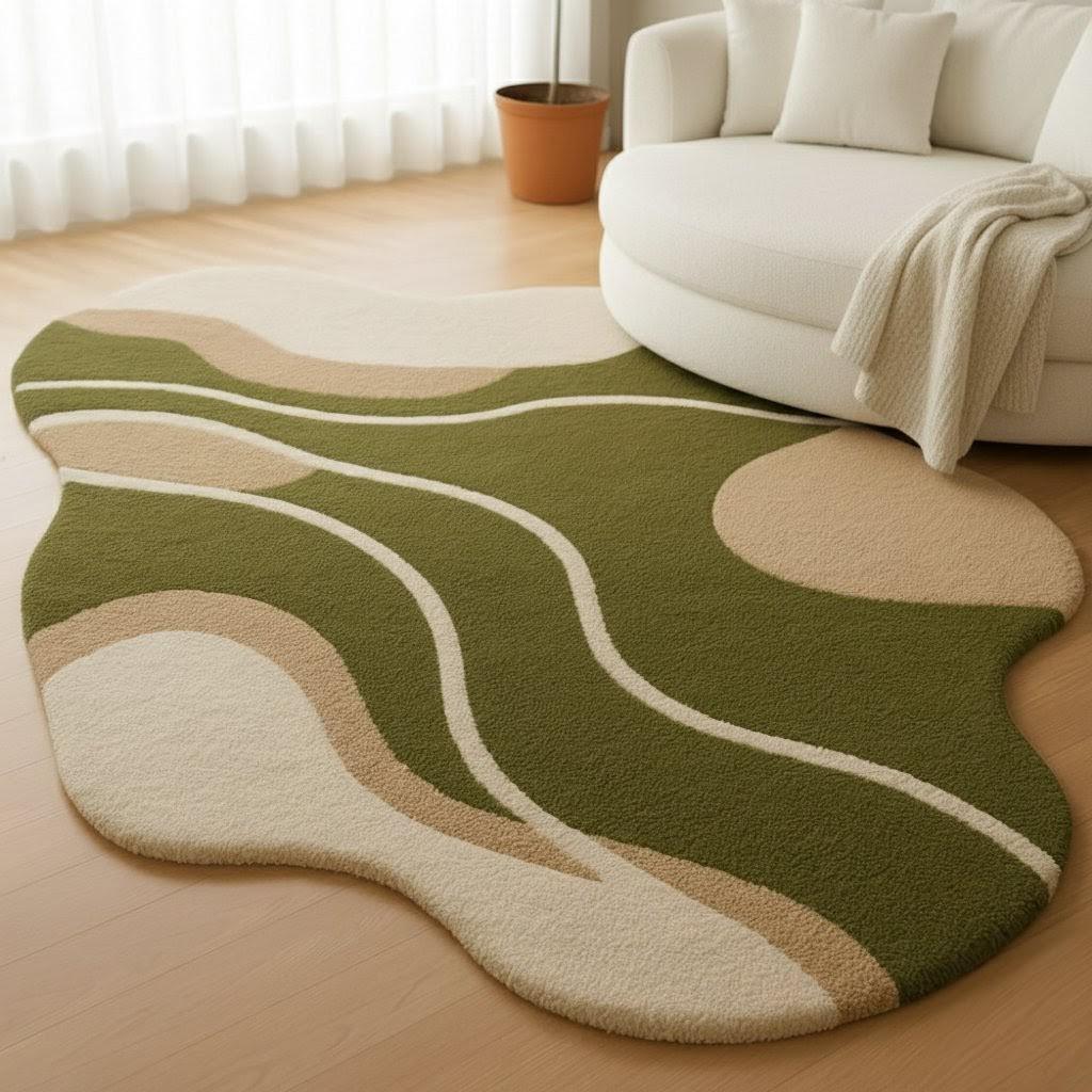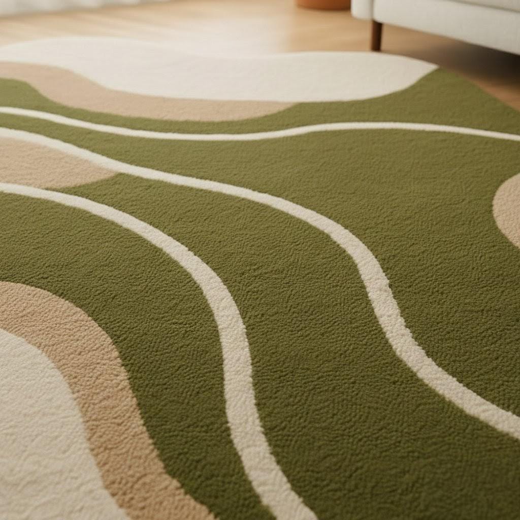 Bring a touch of calm, nature-inspired beauty into your home with this Modern Wavy Abstract Rug, designed with soft organic curves and a soothing palette of earthy green, beige, and cream tones.