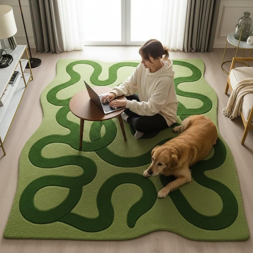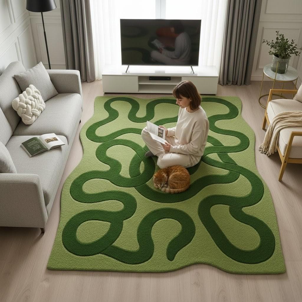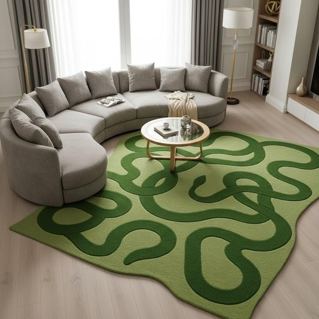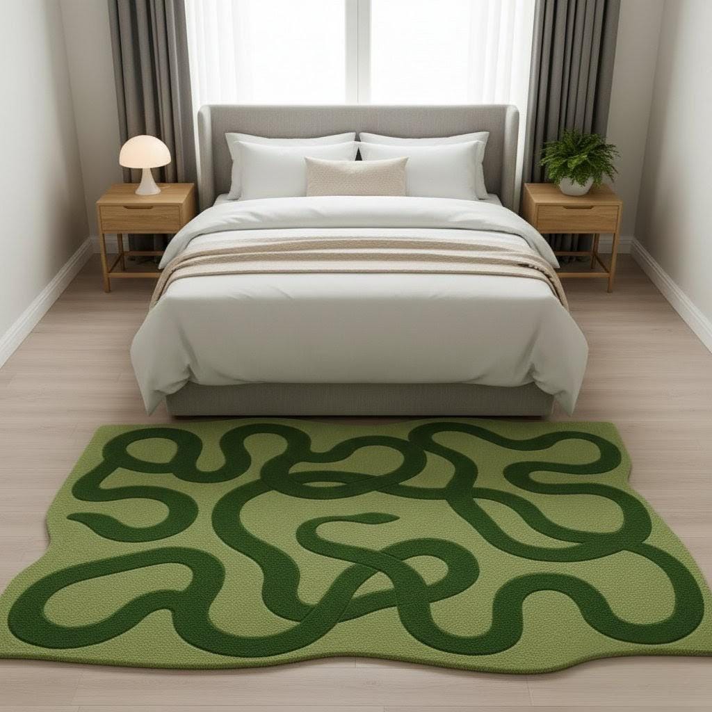 Modern Green Abstract Wavy Rug – Soft Custom Shaped Floor Carpet | Aesthetic Living Room & Bedroom Decor | Unique Handmade Tufted Area Rug