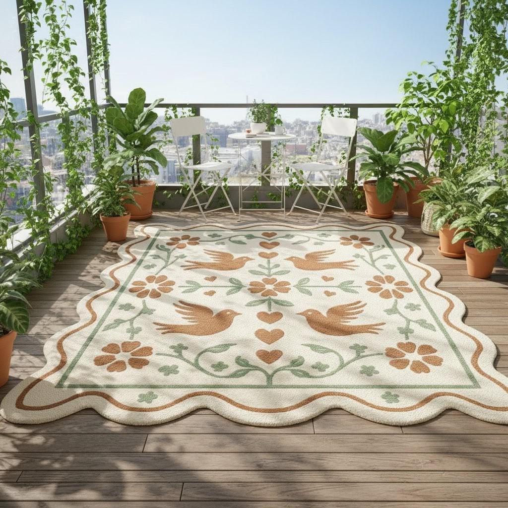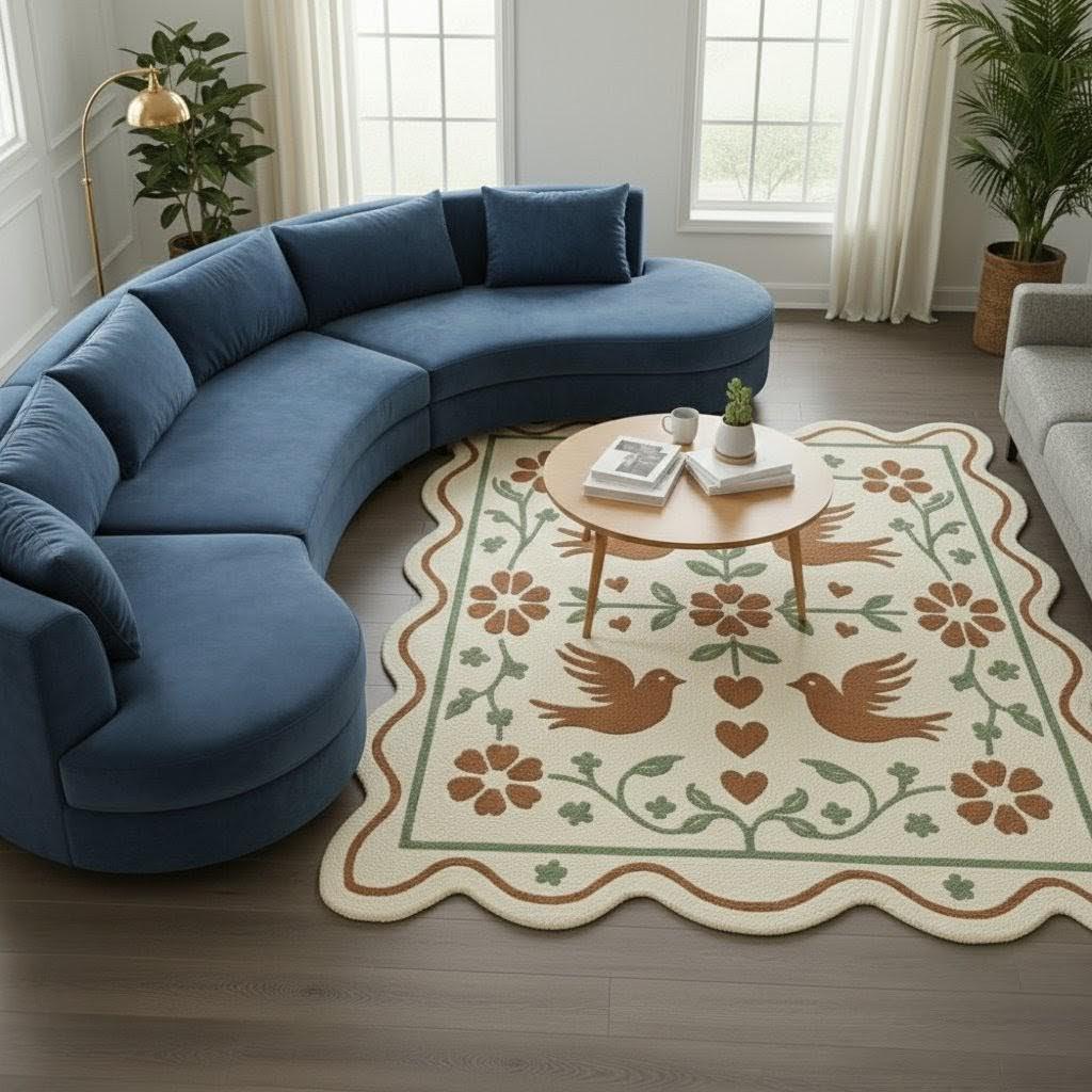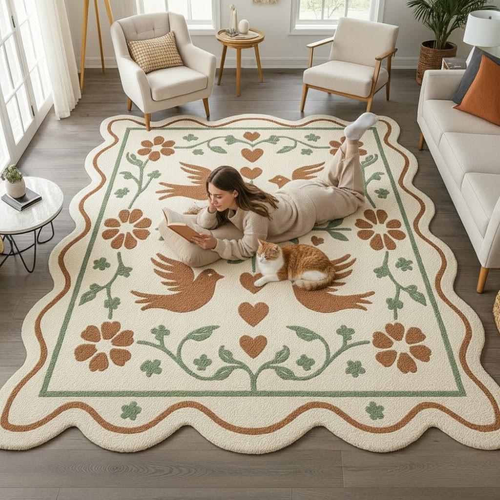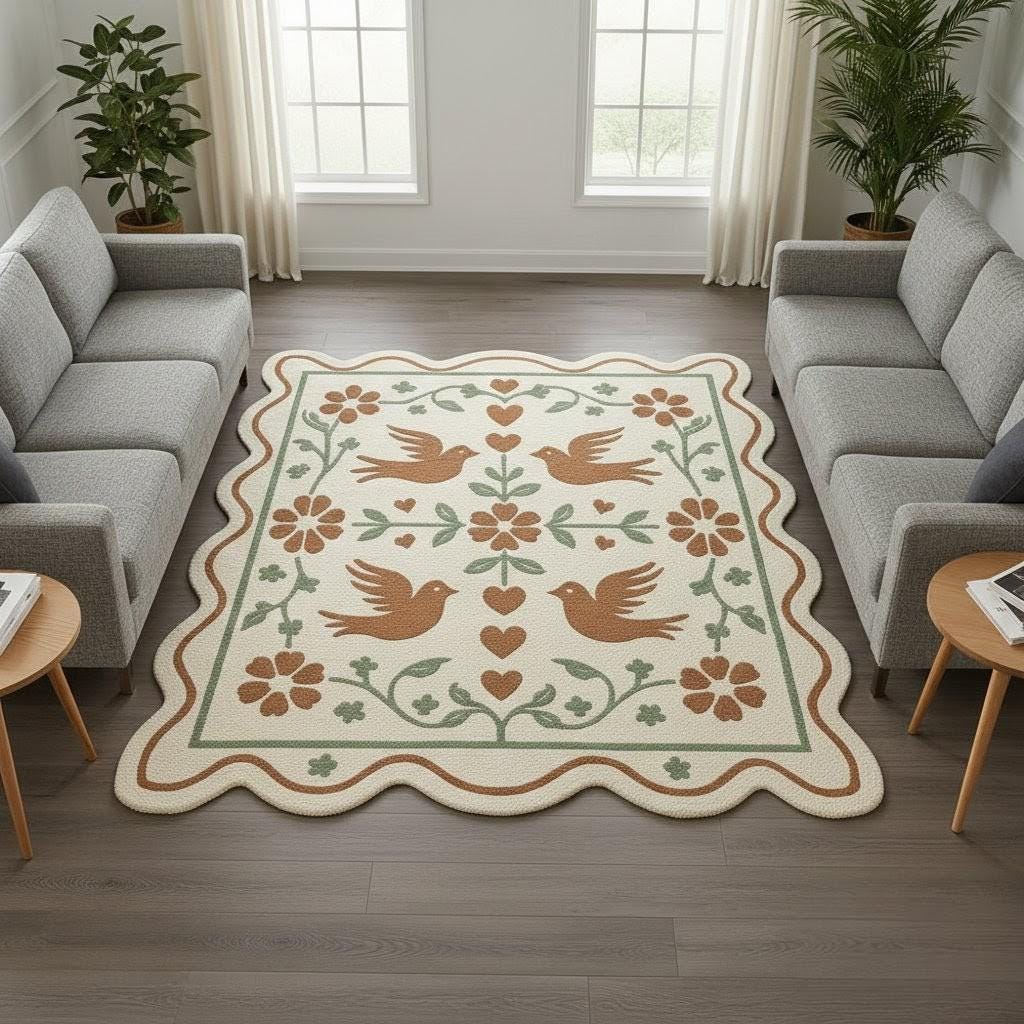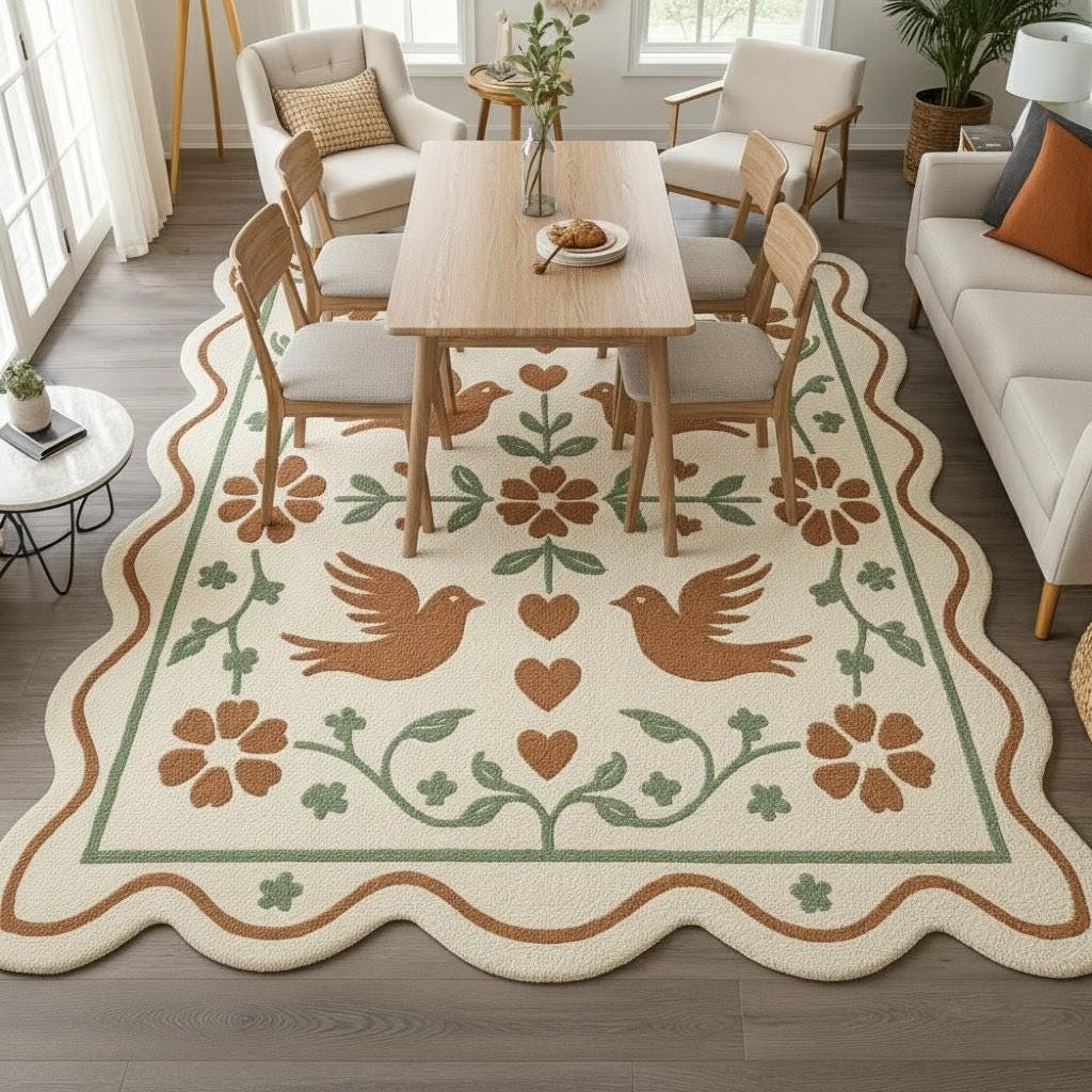 Bring warmth, charm, and timeless folk beauty into your home with this scalloped folk art area rug, inspired by traditional motifs and cozy cottagecore aesthetics. Featuring handcrafted-style birds, hearts, and floral vines in soft earthy tones, this rug instantly transforms any space into a welcoming retreat.