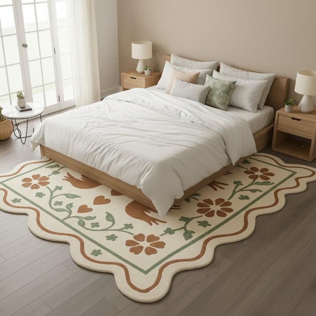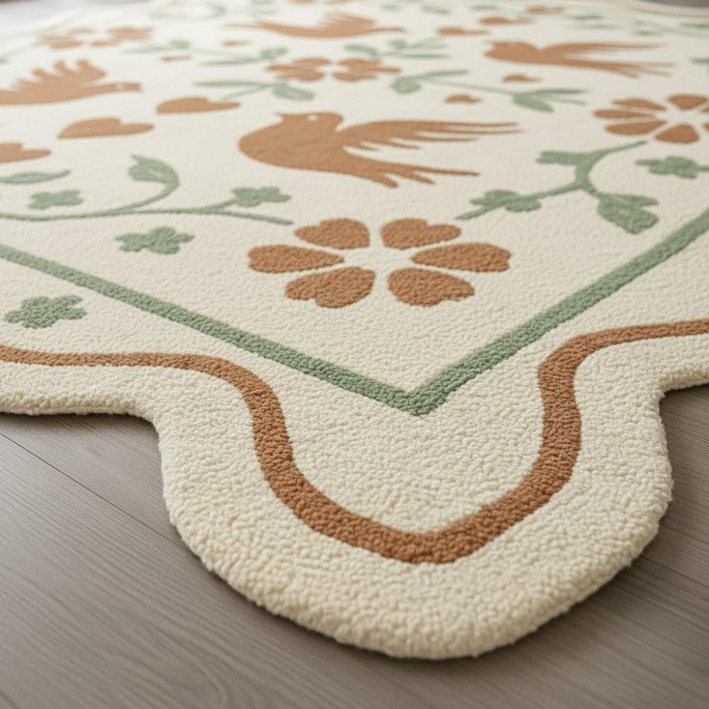 Perfect for living rooms, bedrooms, dining areas, nurseries, reading corners, or balconies, its unique scalloped edge adds an elegant touch that stands out from ordinary rugs. The neutral cream base paired with warm browns and calming greens makes it easy to style with both modern and vintage interiors