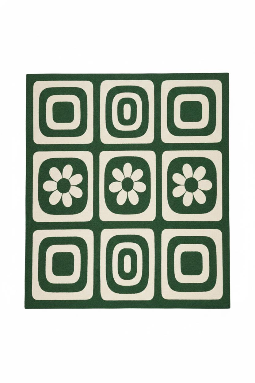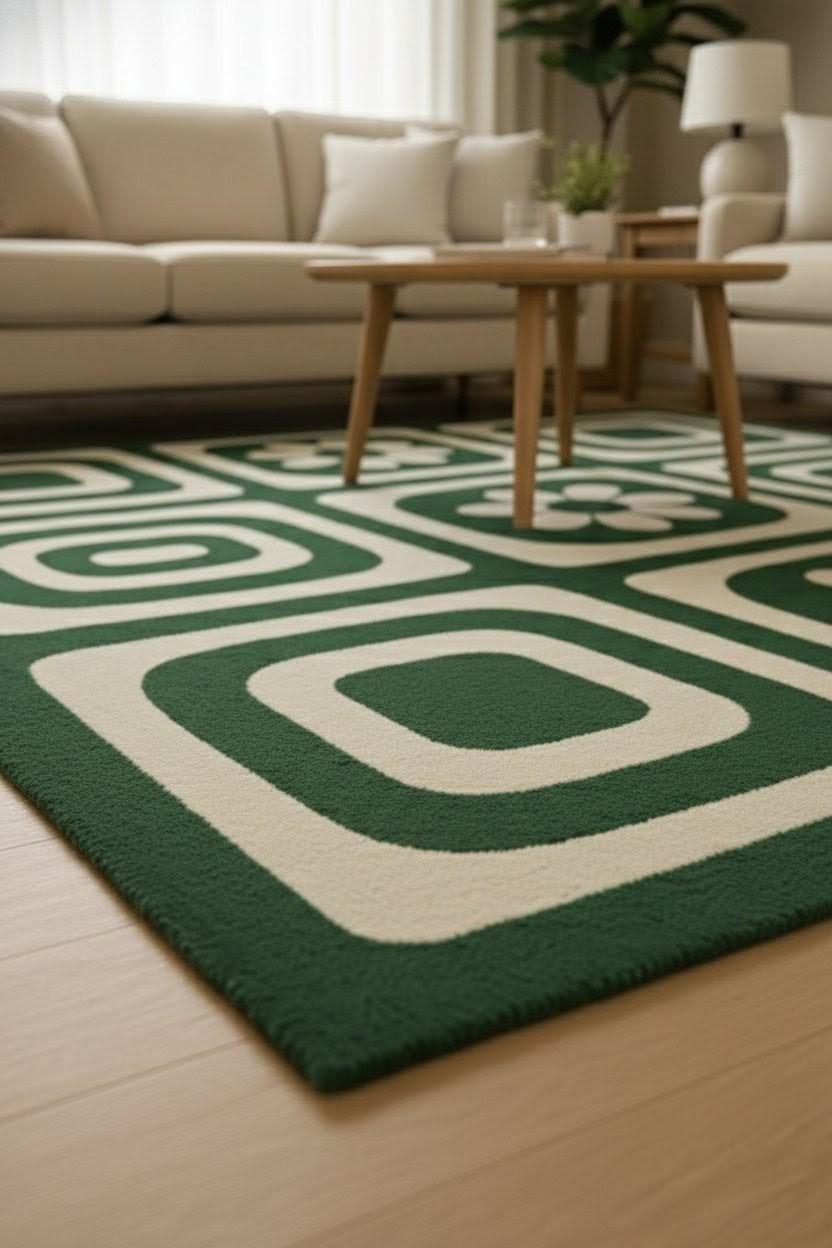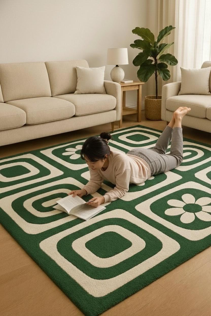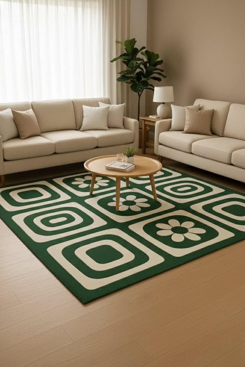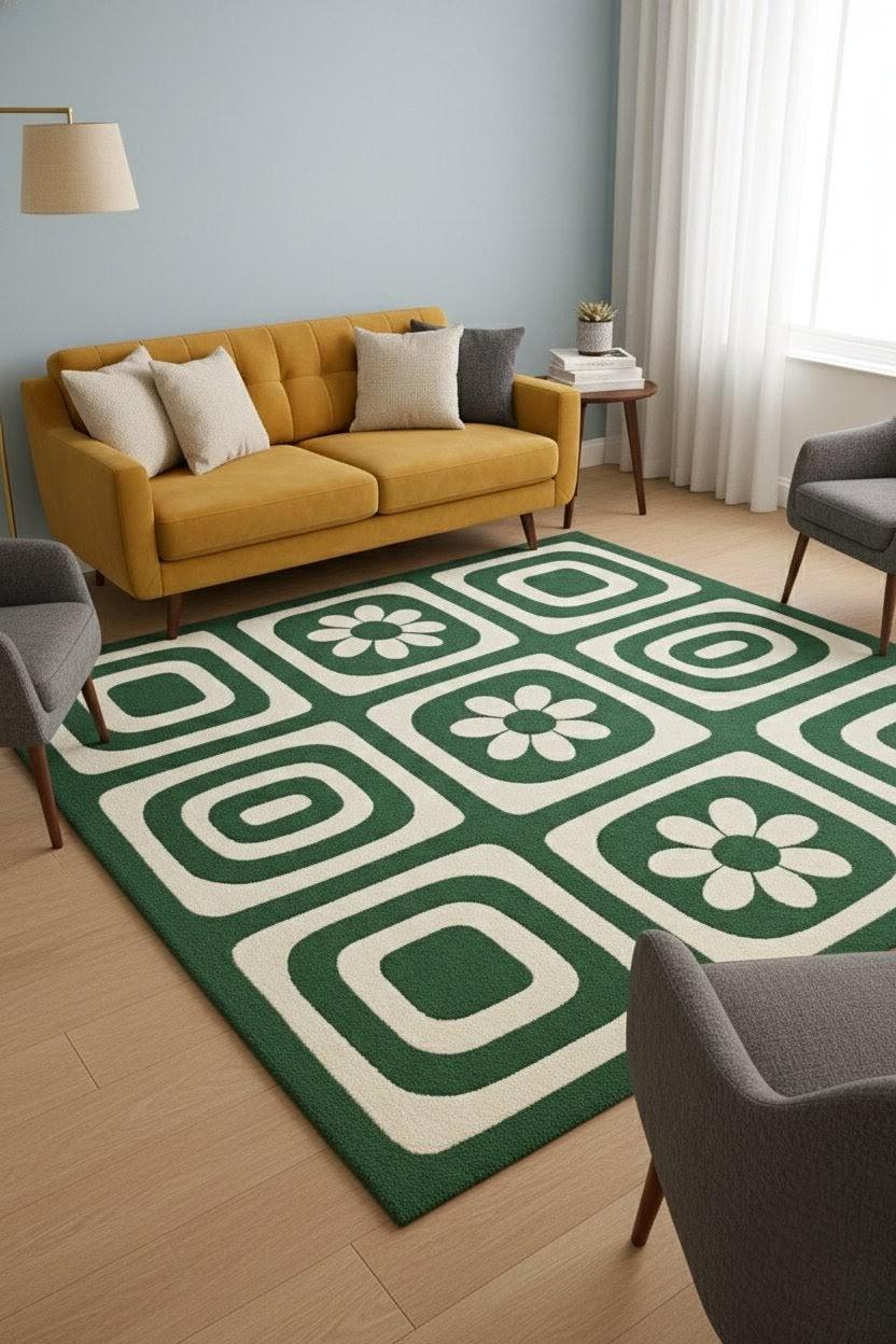 Is carpet ka design mid-century modern inspiration se inspired hai, jisme bold geometric squares aur floral motifs ka perfect balance hai. Green aur ivory color combination room ko calm, cozy aur stylish banata hai 🌿
