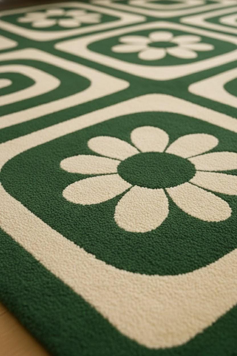 Green Retro Floral Geometric Area Rug | Mid Century Modern Carpet | Soft Living Room Rug | Handmade Style Home Decor by cozy Carft RUGS