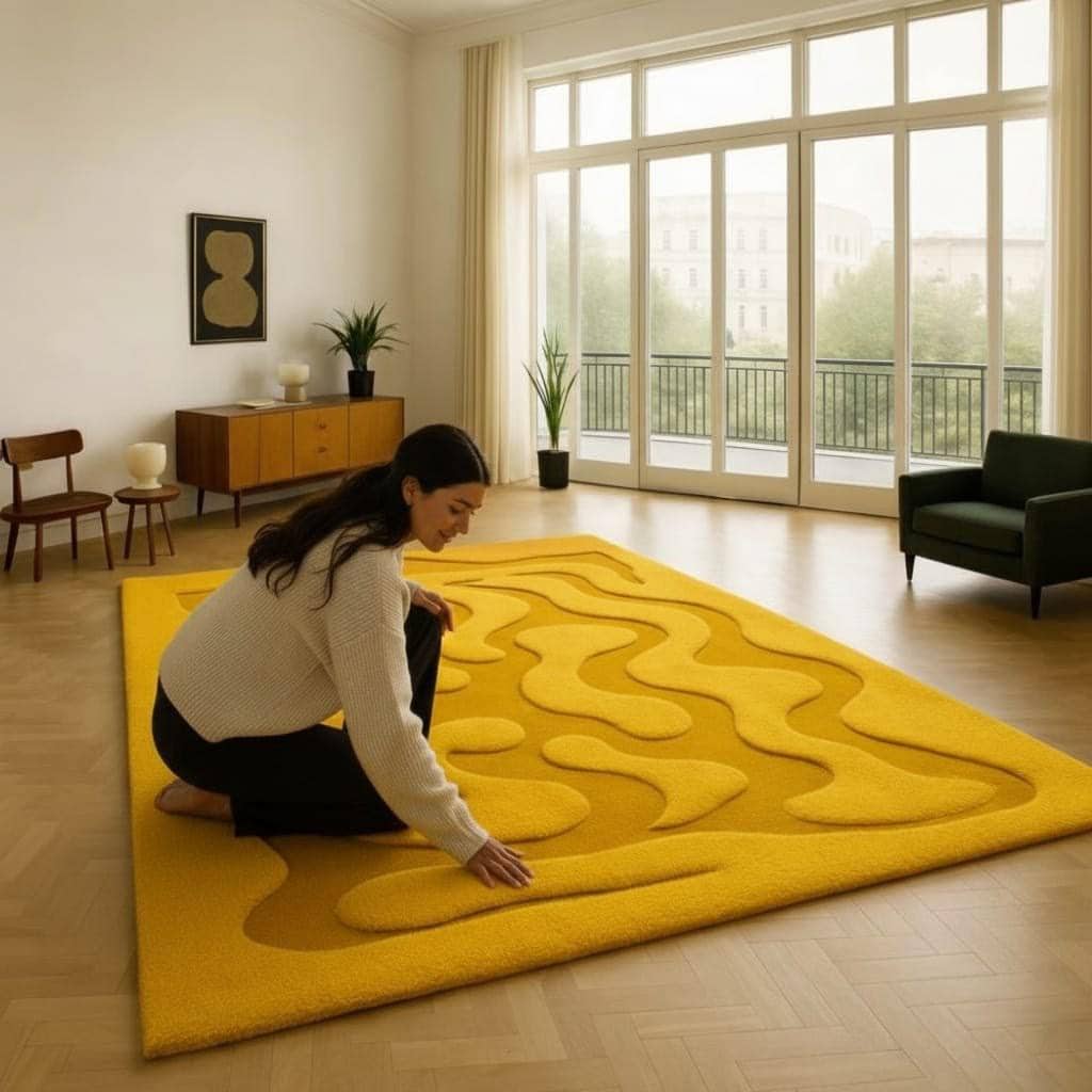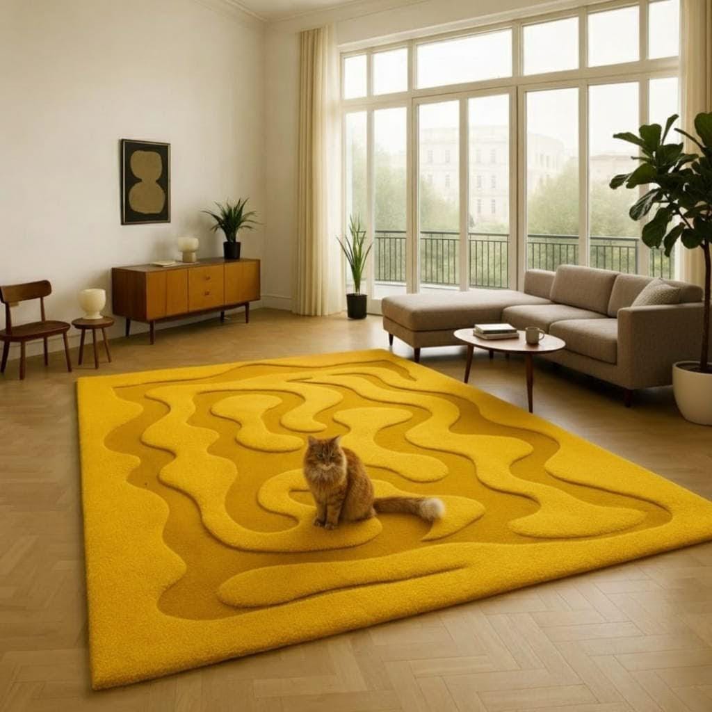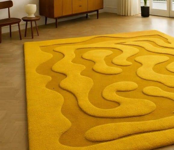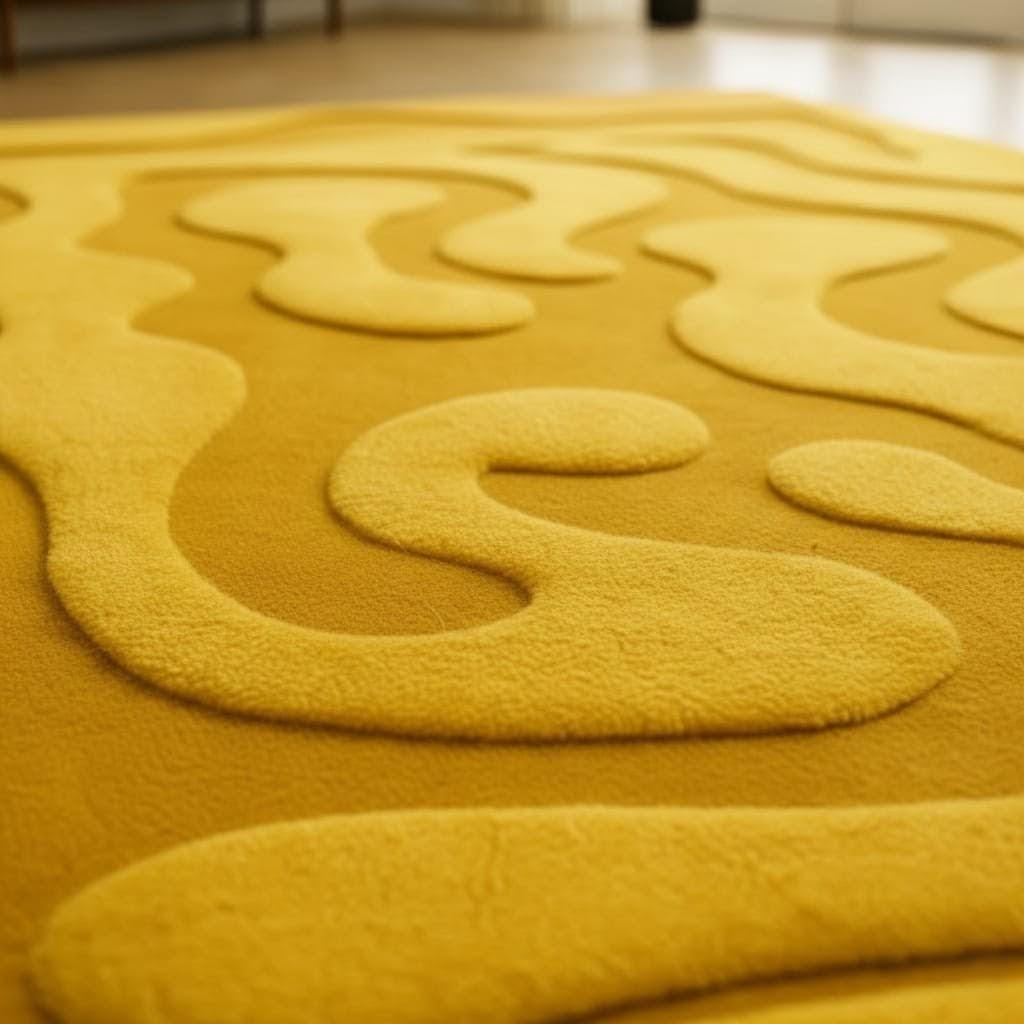 Carpet ka warm yellow tone room mein positivity, freshness aur cozy feel laata hai, jabki iska abstract wave design modern aur minimal spaces ko perfectly complement karta hai. Yeh rug sirf ek floor covering nahi, balki ek statement art piece hai jo living room, bedroom, playroom ya creative spaces ko instantly elevate karta hai.