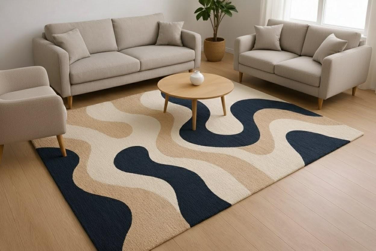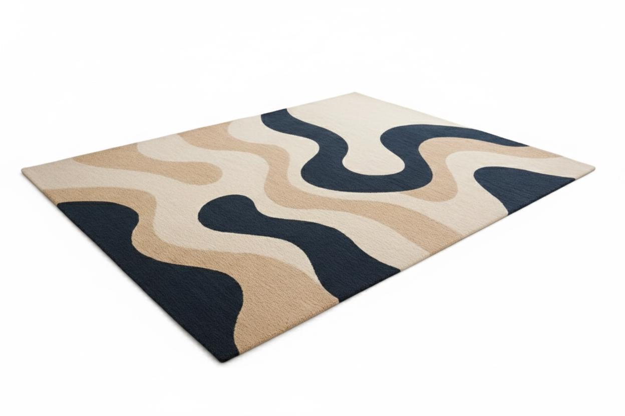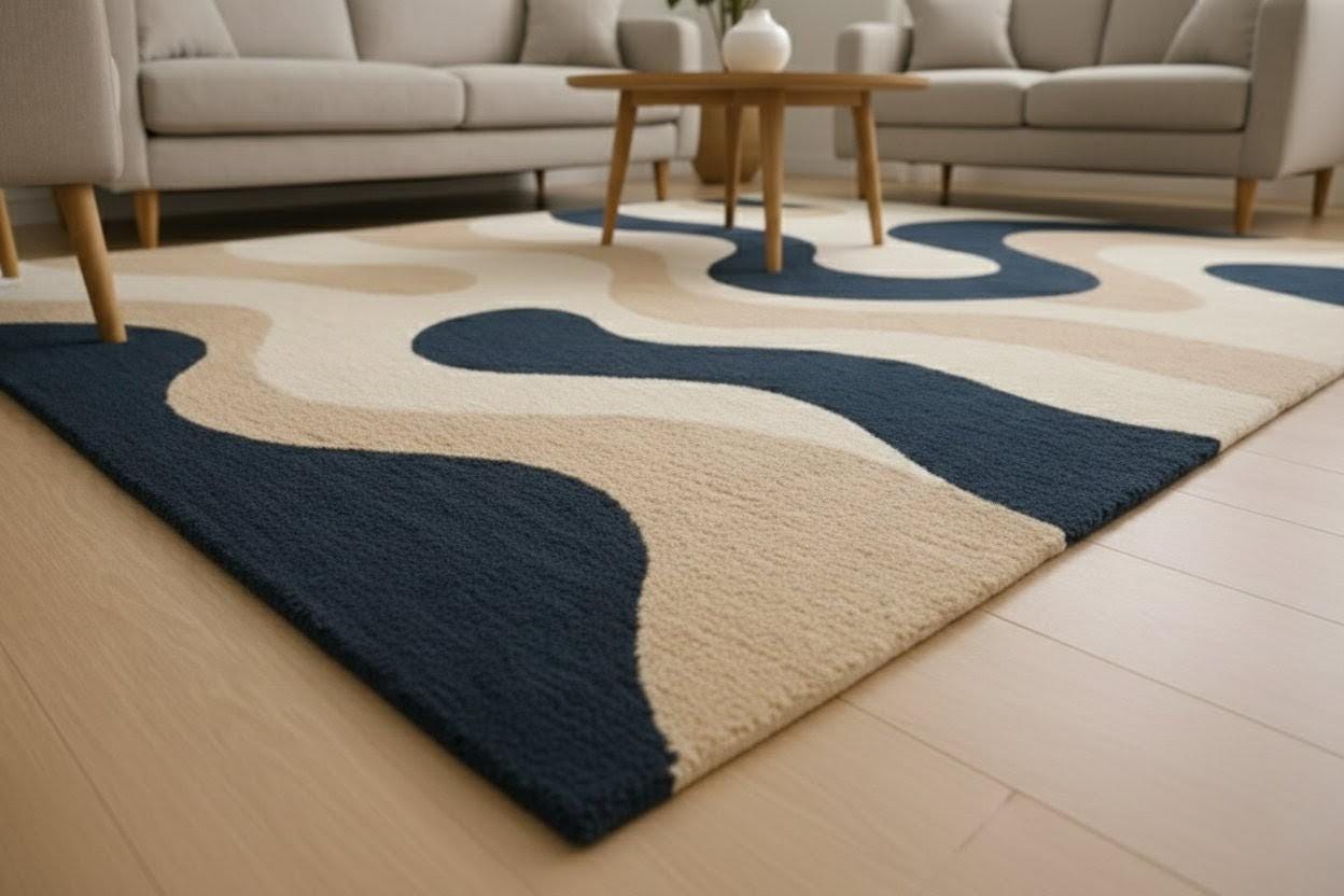 Yeh modern abstract wavy design carpet aapke home interior ko instantly classy aur cozy look deta hai. Is carpet ka blue, beige aur cream color combination bahut hi soothing aur elegant feel create karta hai, jo living room, bedroom, kids room ya play area ke liye perfect hai.