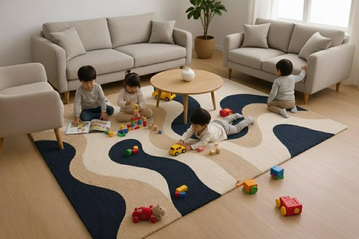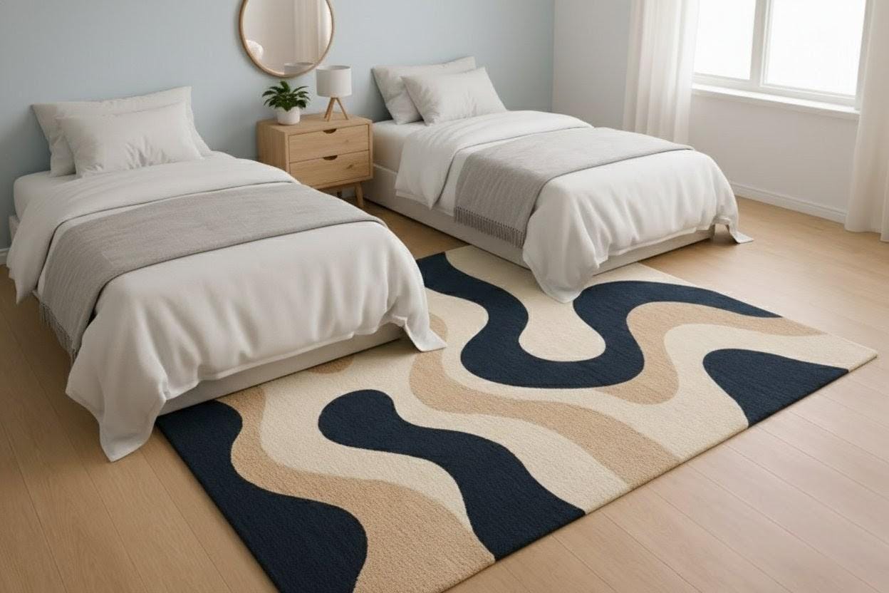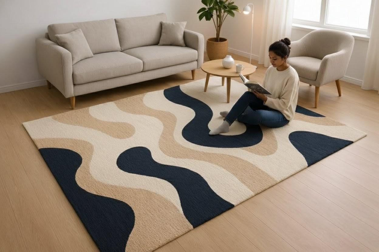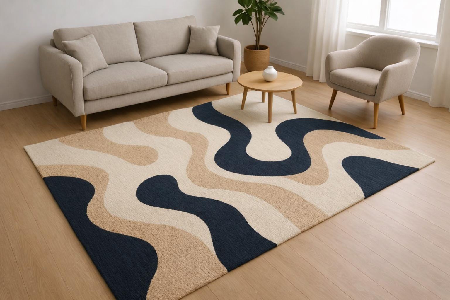 Yeh modern abstract wavy design carpet aapke home interior ko instantly classy aur cozy look deta hai. Is carpet ka blue, beige aur cream color combination bahut hi soothing aur elegant feel create karta hai, jo living room, bedroom, kids room ya play area ke liye perfect hai.