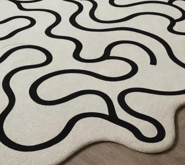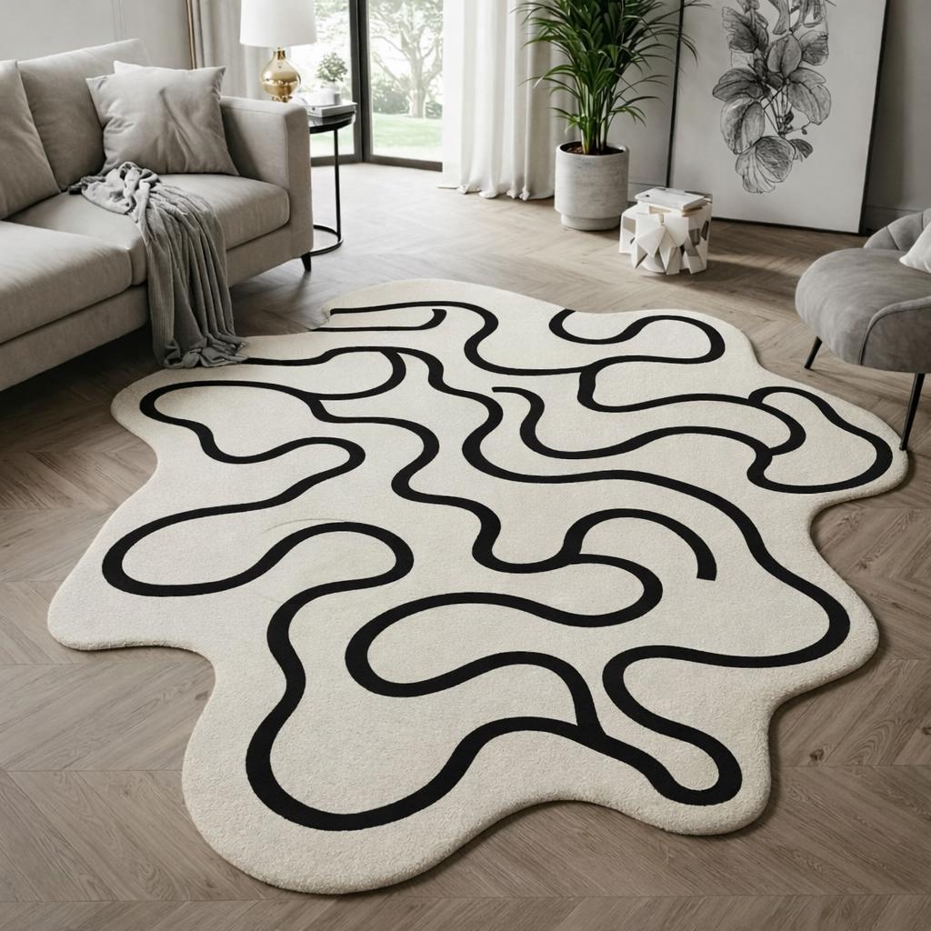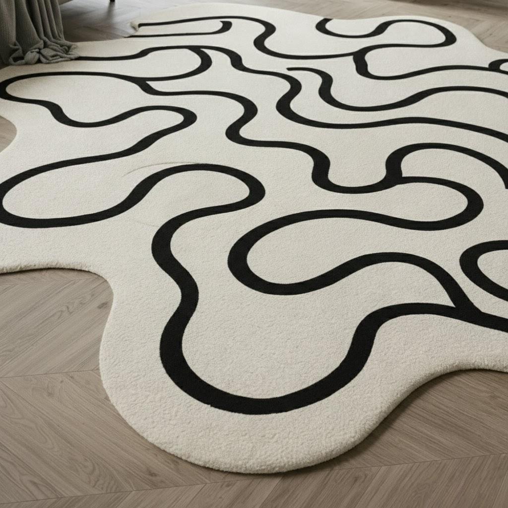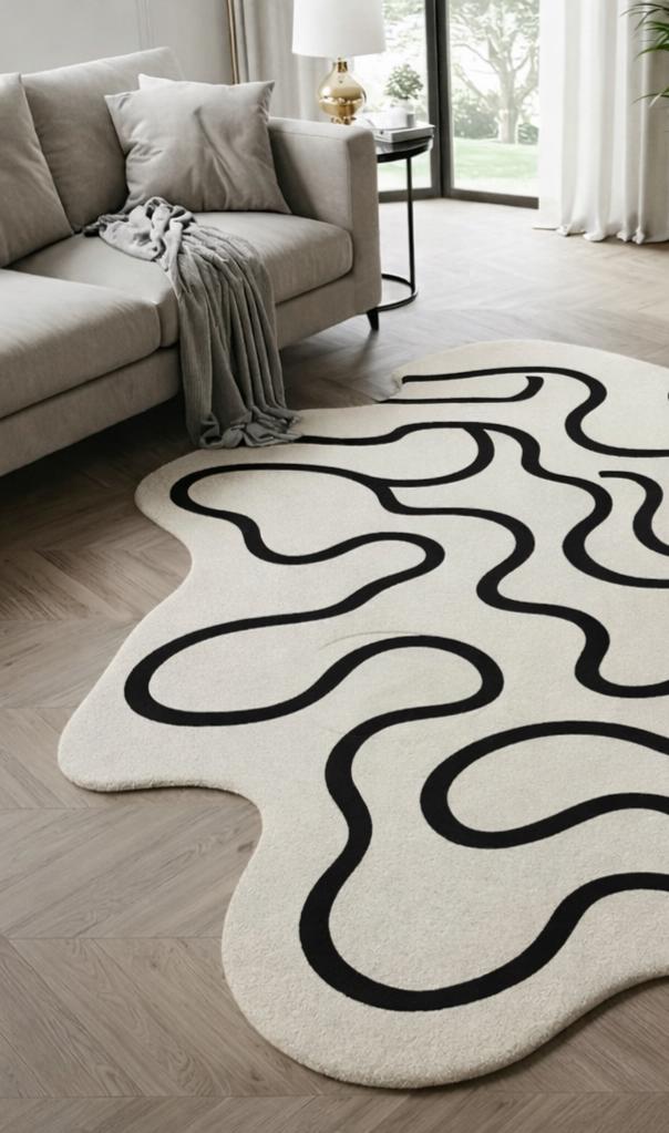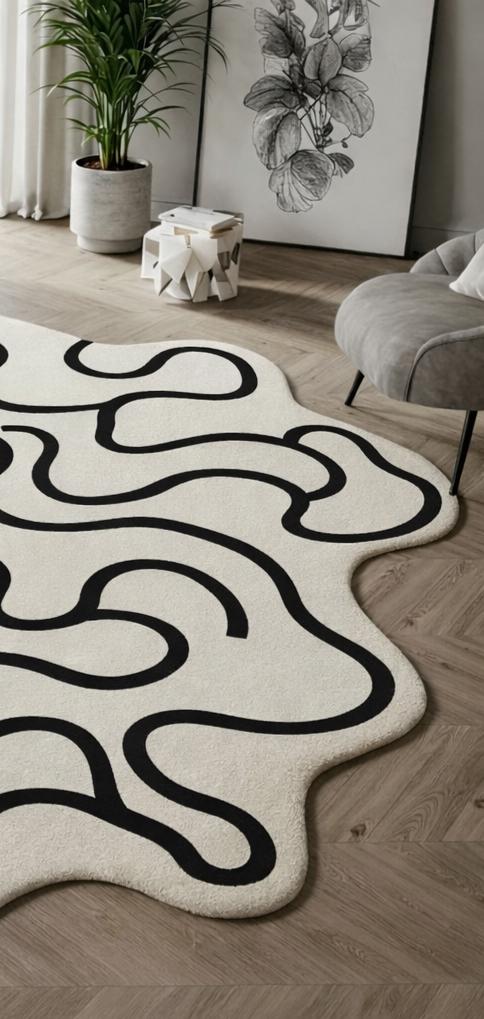 Yeh modern abstract wavy line carpet aapke living space ko instantly stylish, artistic aur luxurious look deta hai. Cream/off-white base par bold black flowing lines is carpet ko ek statement décor piece banati hain, jo minimal aur contemporary interiors ke saath perfectly blend hota hai