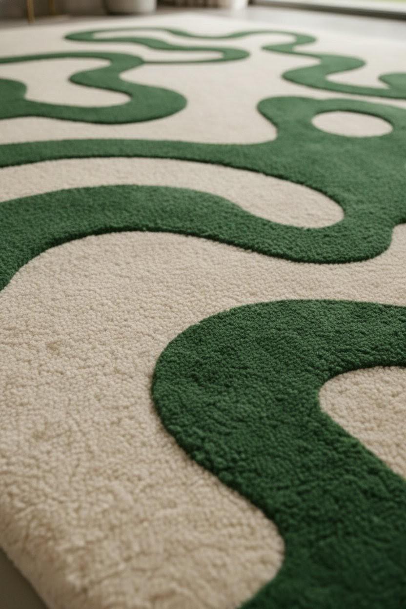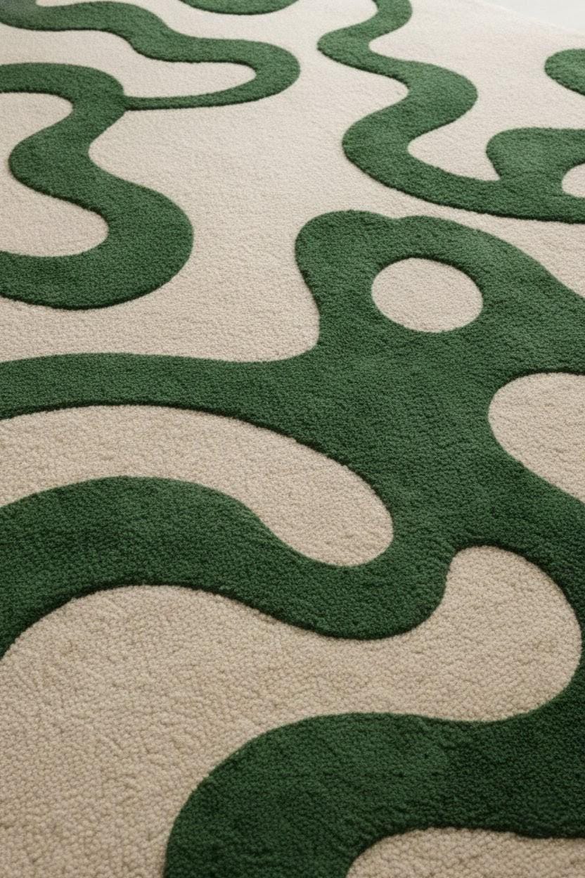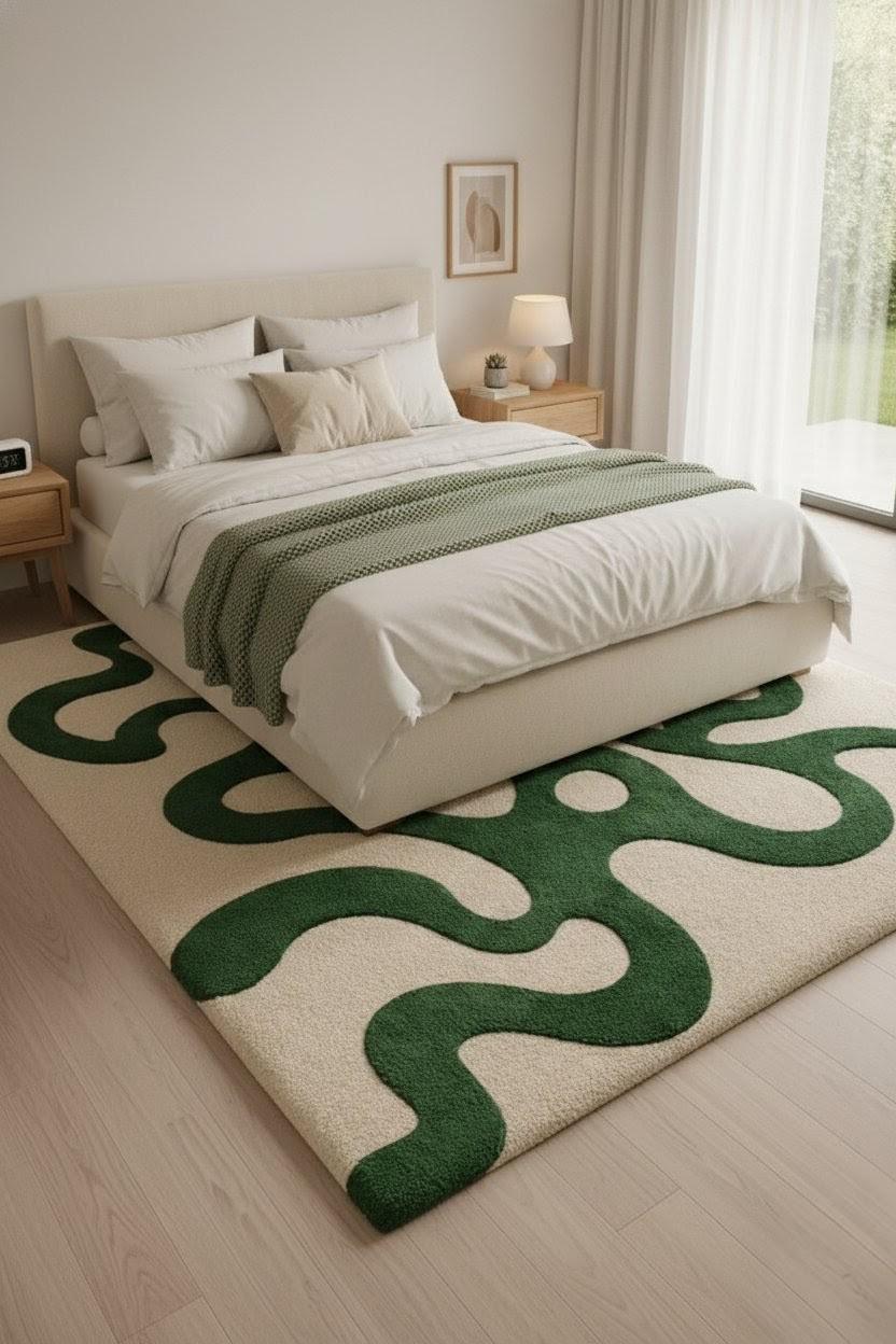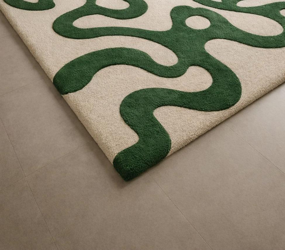 Soft aur plush tufted texture pairon ke neeche bahut comfortable lagta hai, saath hi cozy aur premium vibe add karta hai. Neutral beige base ke saath deep green curves minimal interiors, Scandinavian, modern aur contemporary decor ke saath easily blend ho jaate hain💫