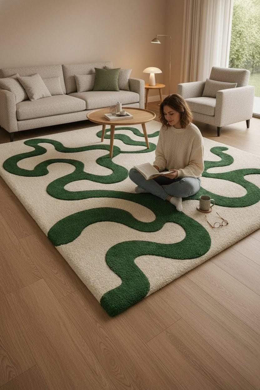 💫Yeh modern abstract area rug aapke space ko turant fresh aur stylish look deta hai. Carpet ka organic wavy green pattern nature-inspired feel create karta hai, jo living room, bedroom ya lounge area ke liye perfect hai.