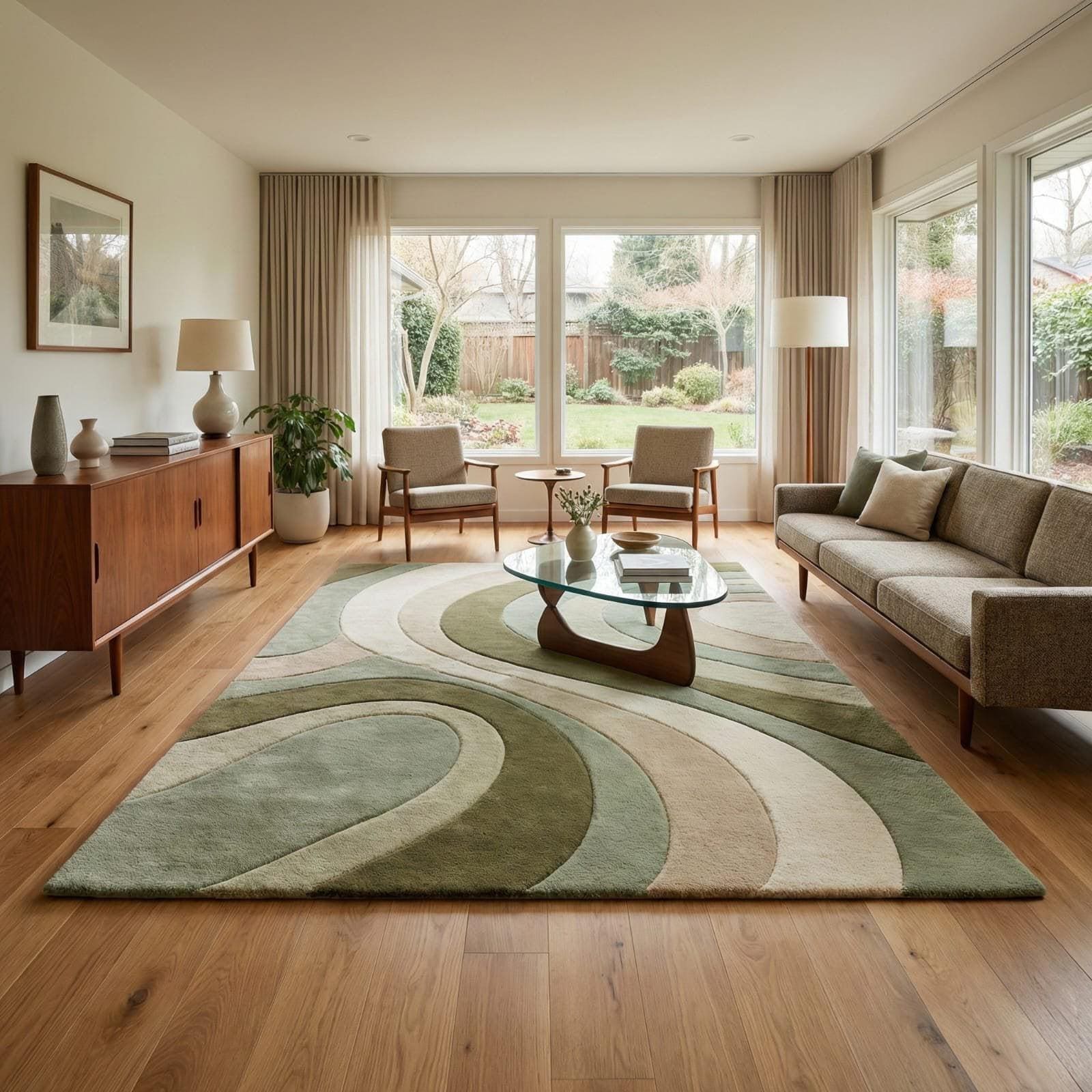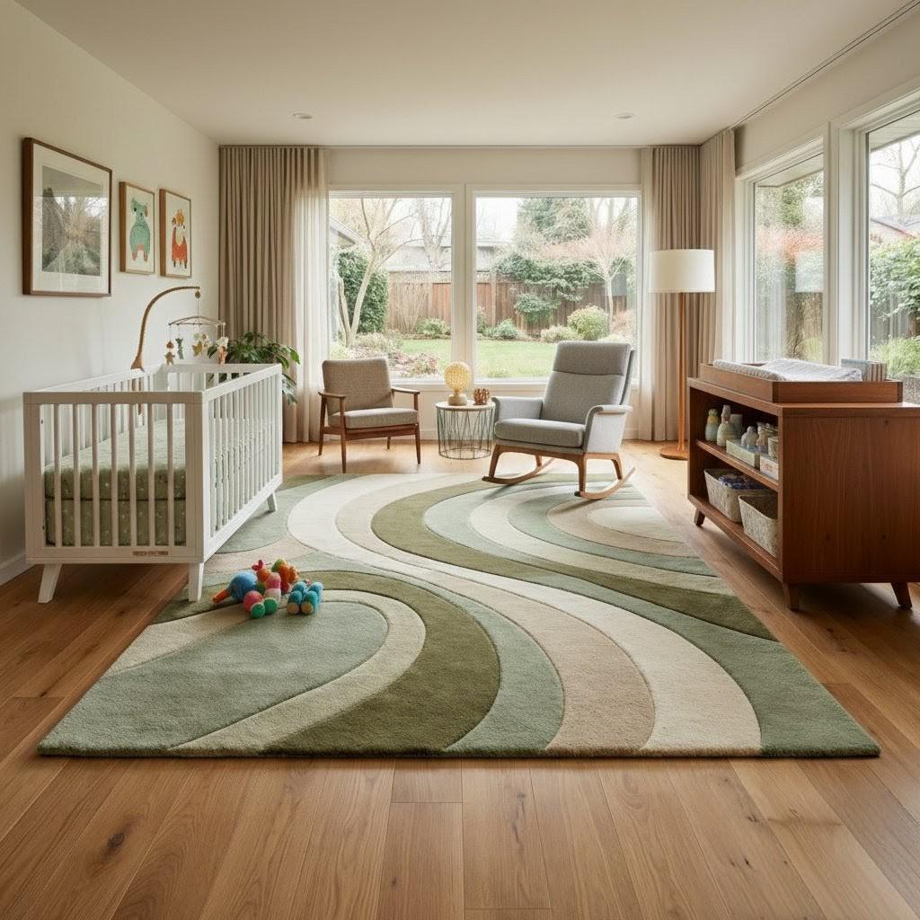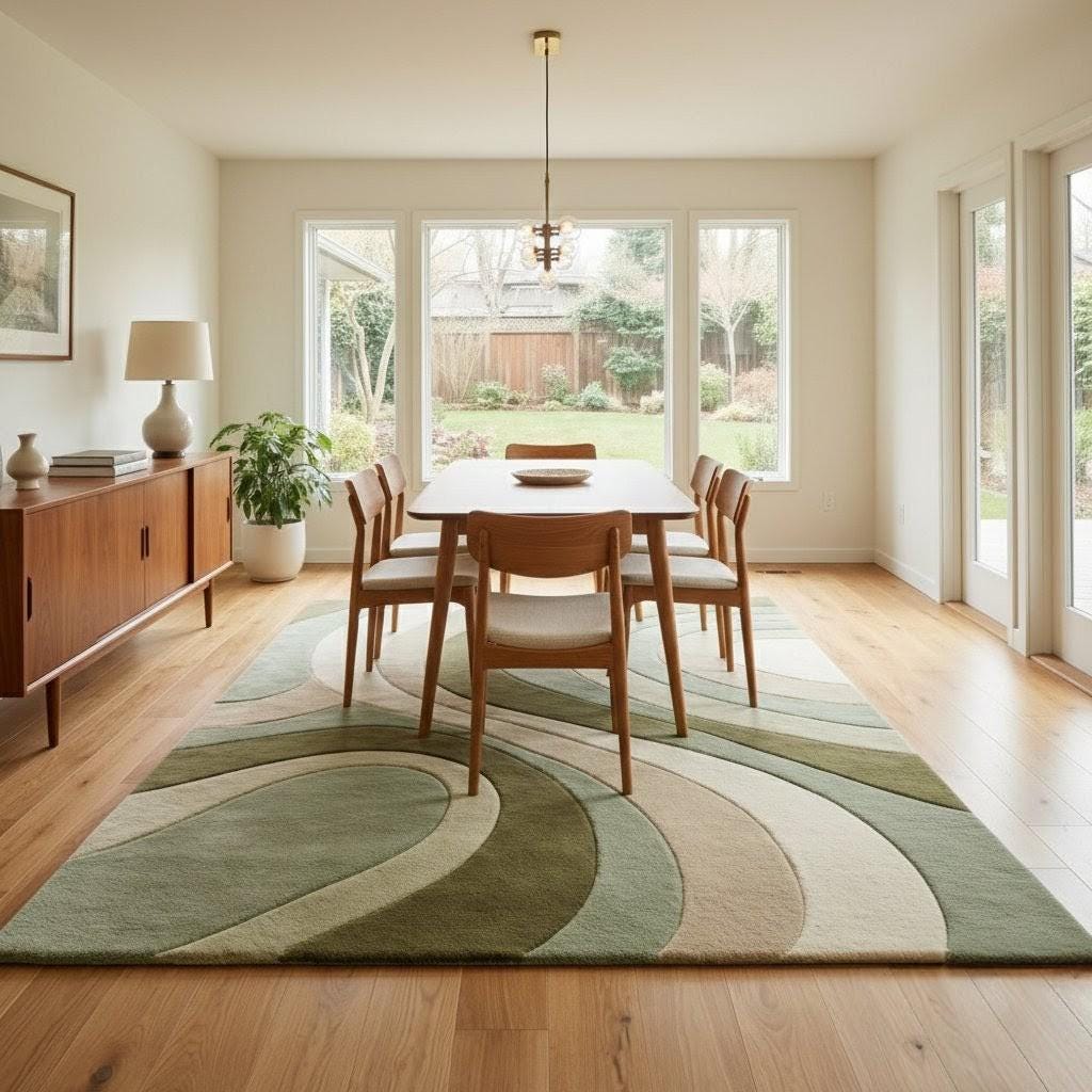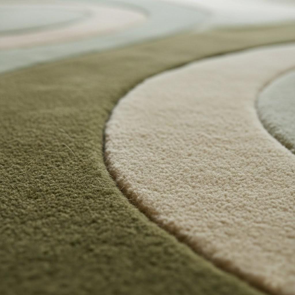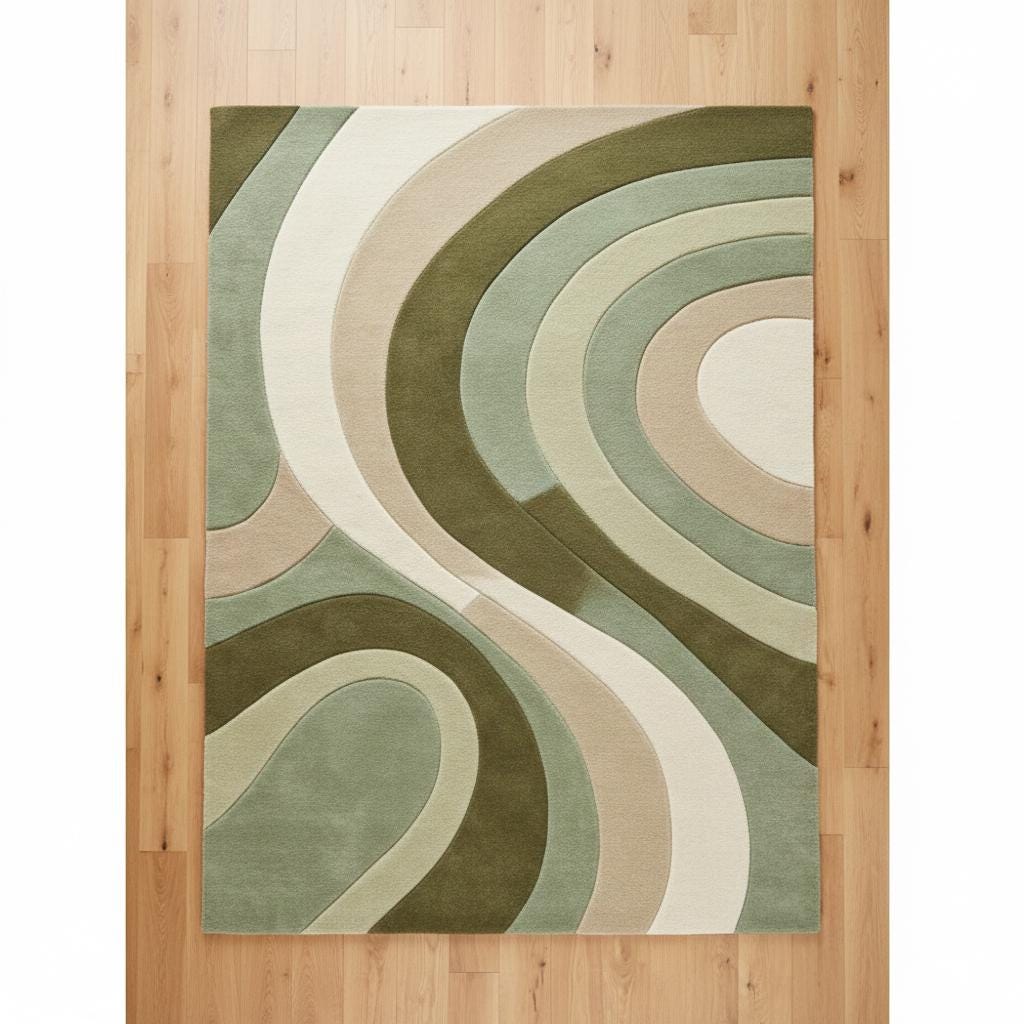 This rug is inspired by the timeless elegance of Mid-Century Modern and Scandinavian interiors, where form flows naturally and color soothes the senses. Soft, sculptural curves ripple across the surface, creating a sense of movement without chaos. The layered tones of sage green, olive, beige, and ivory evoke nature, balance, and warmth—making the rug feel grounded yet artistic. The abstract pattern adds depth while remaining subtle enough to complement both minimalist and cozy interiors.
