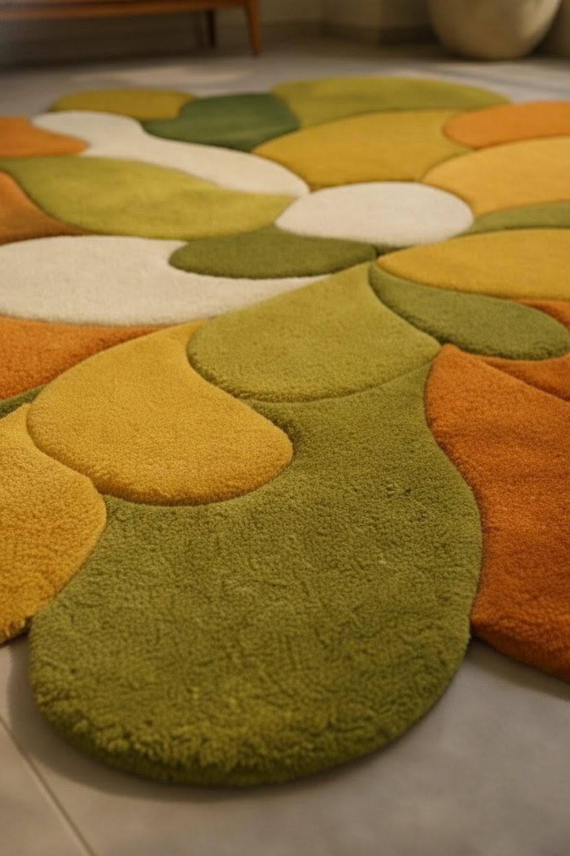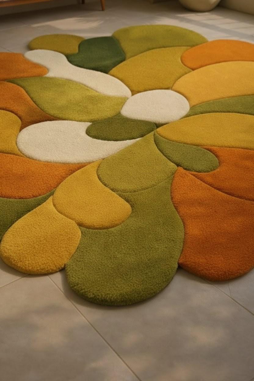 Bring warmth, movement, and artistic charm into your space with this handmade abstract organic shape rug. Designed with flowing, free-form curves, this carpet features a harmonious blend of earthy green, mustard yellow, burnt orange, and soft ivory tones, inspired by nature and modern art