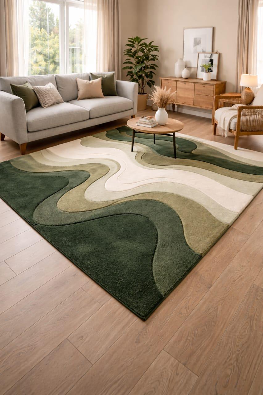 This rug is a celebration of organic movement and modern tranquility. Inspired by aerial views of rolling hills and flowing landscapes, the abstract wave pattern creates a calming visual rhythm that feels both grounded and artistic. Deep forest green melts seamlessly into sage, olive, and soft ivory tones, creating layered dimension and subtle contrast.