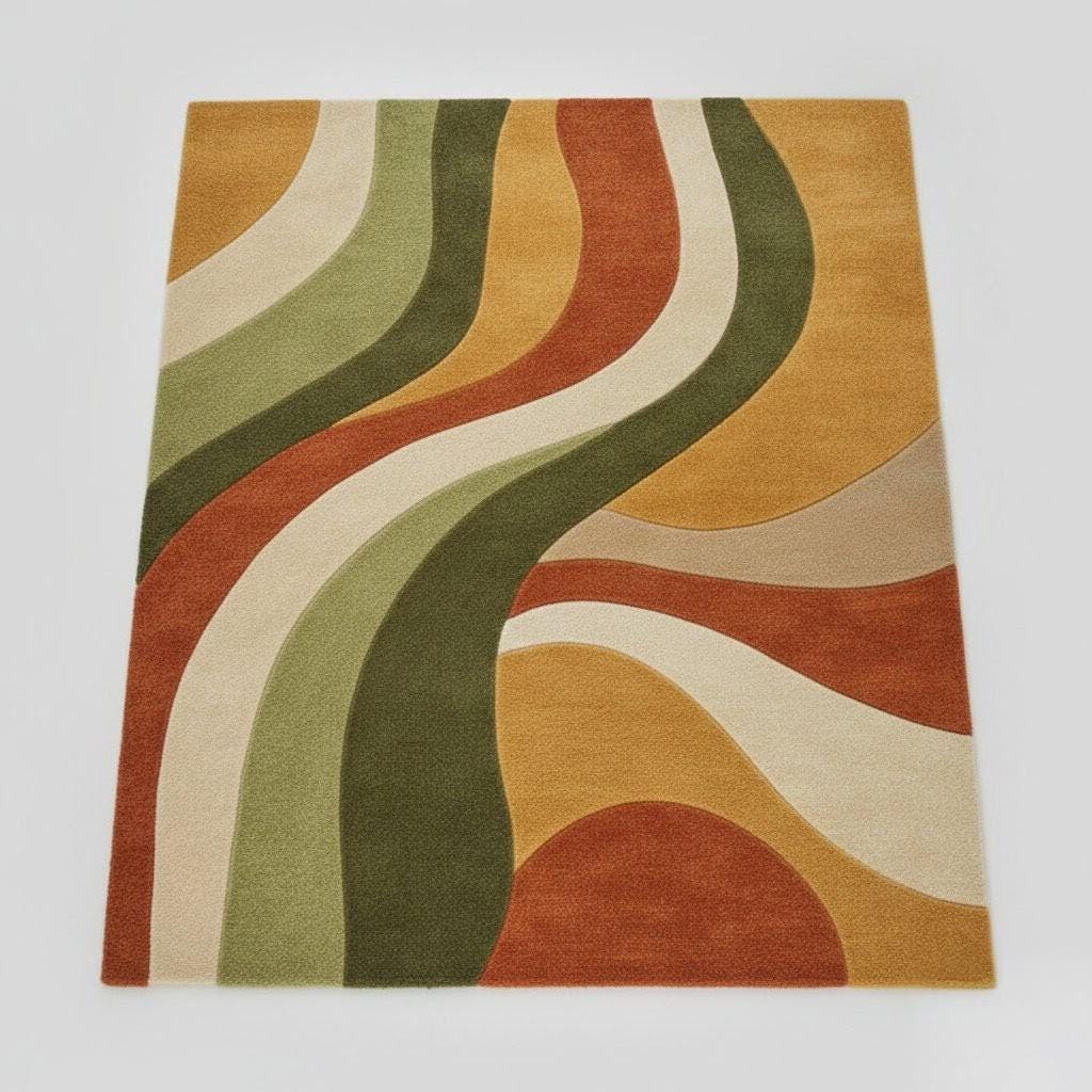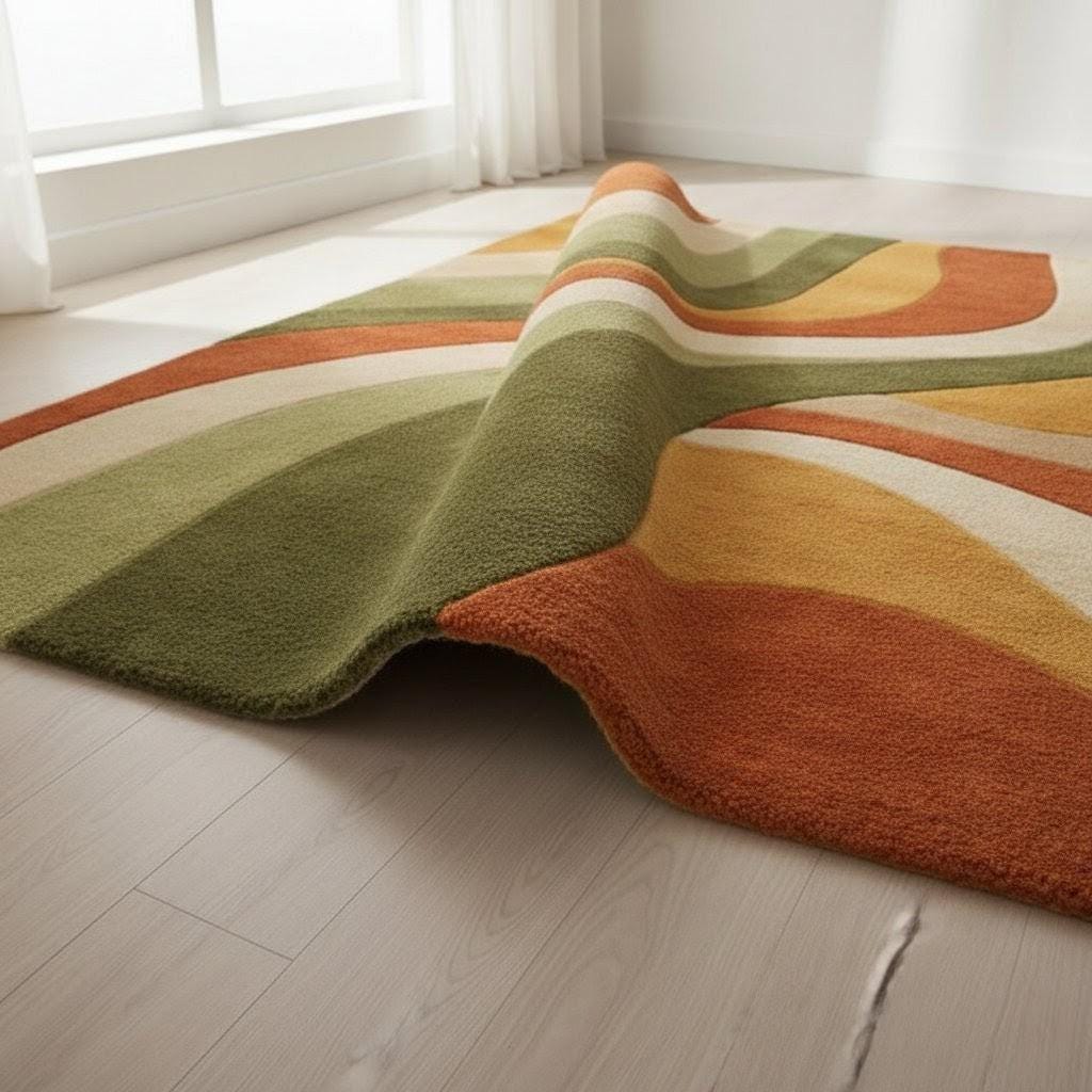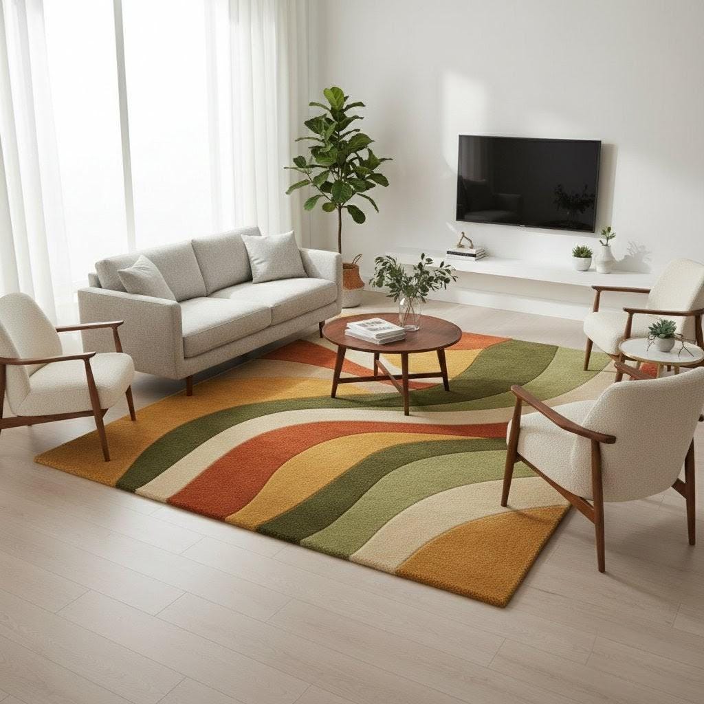 This statement rug from Cozy Crafts Rugs is inspired by Mid-Century Modern movement and organic landscapes. Flowing wave patterns glide across the surface in harmonious bands of sage green, olive, warm rust, mustard gold, and creamy beige. The design evokes gentle hills and sunlit valleys, creating a sense of motion and calm at once. Its abstract curves make it visually dynamic without overpowering your décor, offering a perfect balance between artistic expression and everyday elegance.