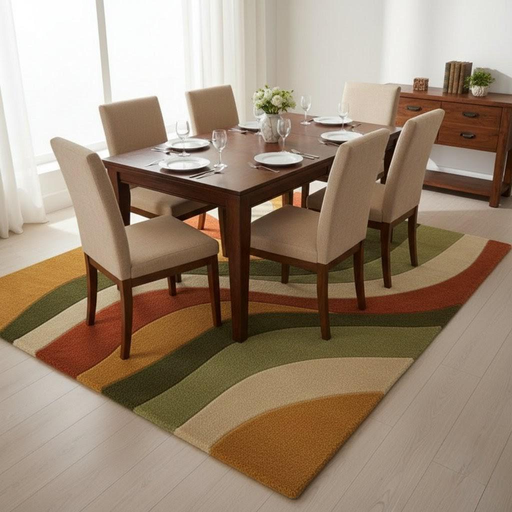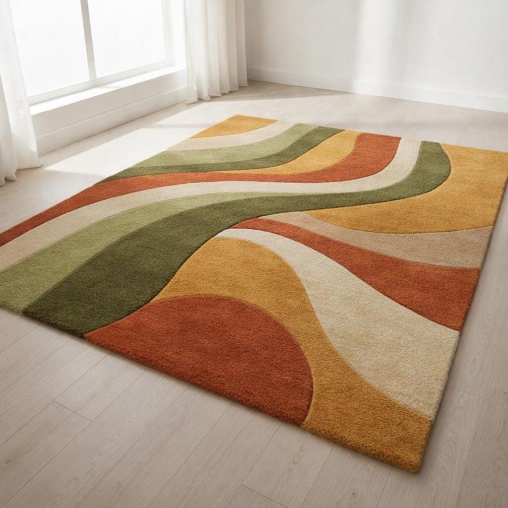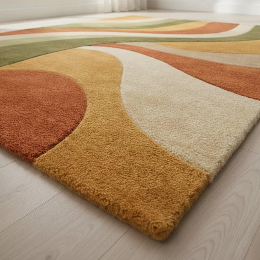 Hand Tufted Wool Area Rug Mid Century Modern Wave Design Earth Tone Green Rust Beige Carpet for Living Room 8x10 9x12 Custom Size Large