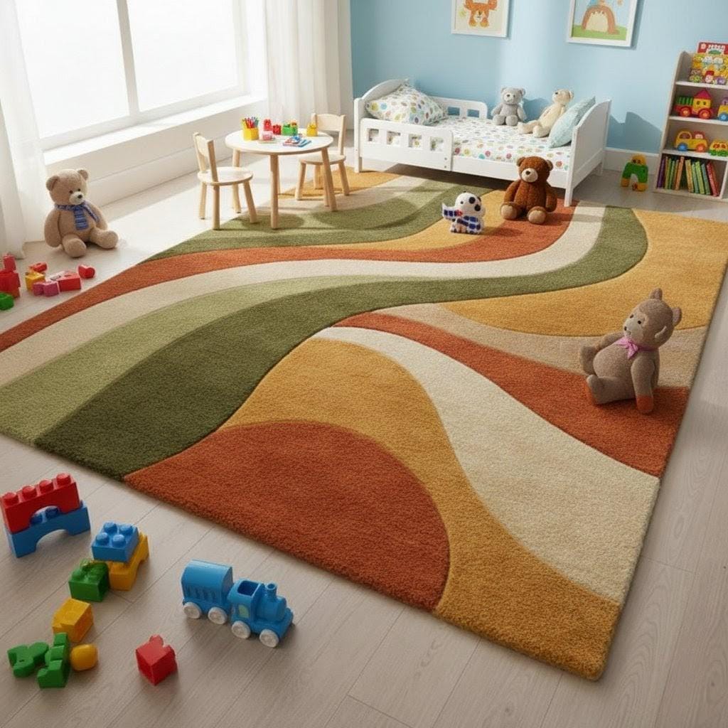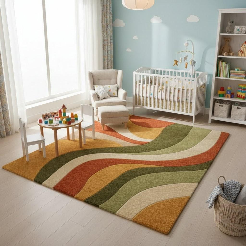 Perfect for living rooms, dining areas, bedrooms, nurseries, and home offices, this rug pairs beautifully with wooden furniture, neutral sofas, and indoor plants. Its warm earth tones complement Scandinavian, Mid-Century, Boho, and Japandi interiors. Place it beneath a dining table for warmth, under a sofa for visual anchoring, or in a child’s room for soft play comfort.